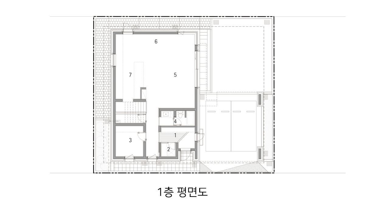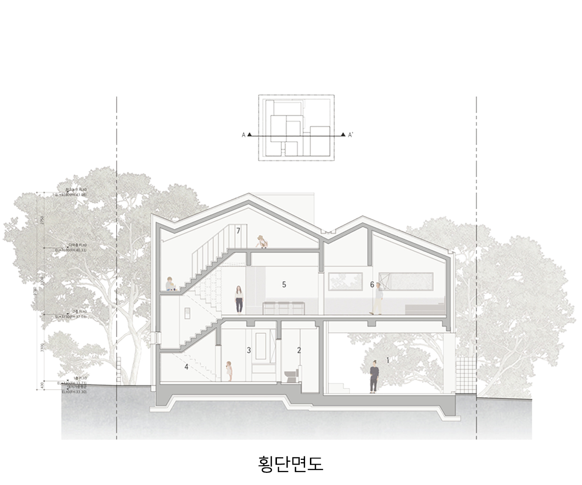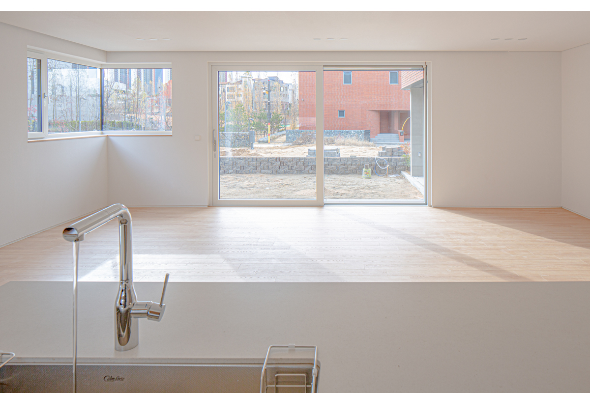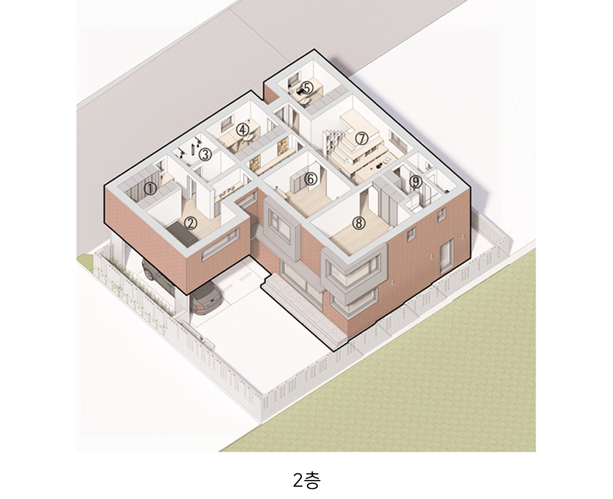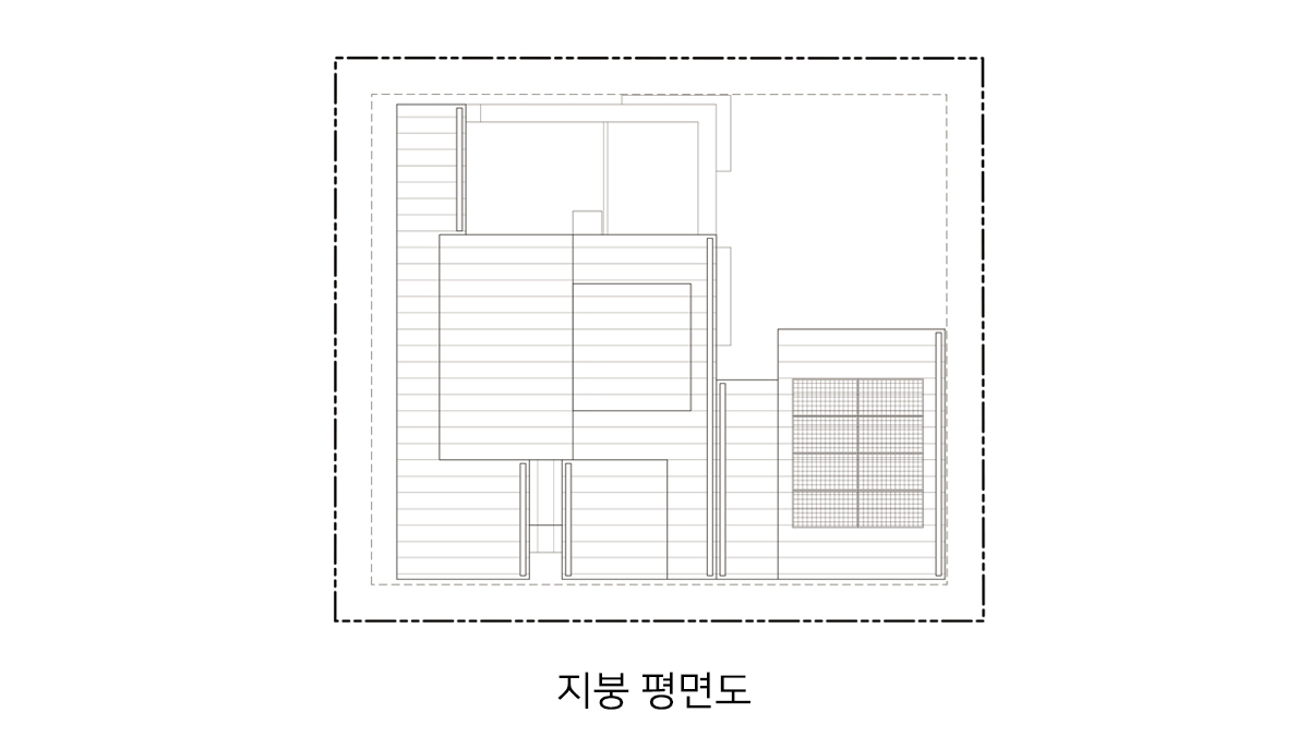 계획 대지는 동탄2신도시 택지지구 내 단독주택 필지로 법정건폐율 50%와 법정용적률 80%의 제한을 받는 필지이다. 거실, 방 등과 같은 필수 주거 공간 외에도 자녀들의 활동을 위한 공간과 부모의 개인 작업 공간을 하나의 건물 안에 담기 위해서는 면적에 대한 고민이 필요했다. 자녀들의 활동 공간을 충분히 확보하는 동시에 효율적인 공간 구성이 가능하도록 공간 내 단차 계획에 주의를 기울였다.