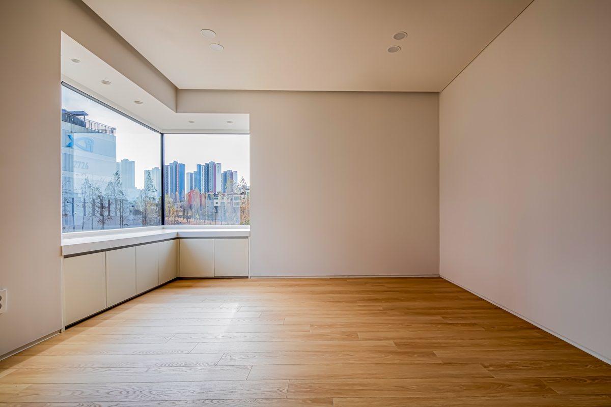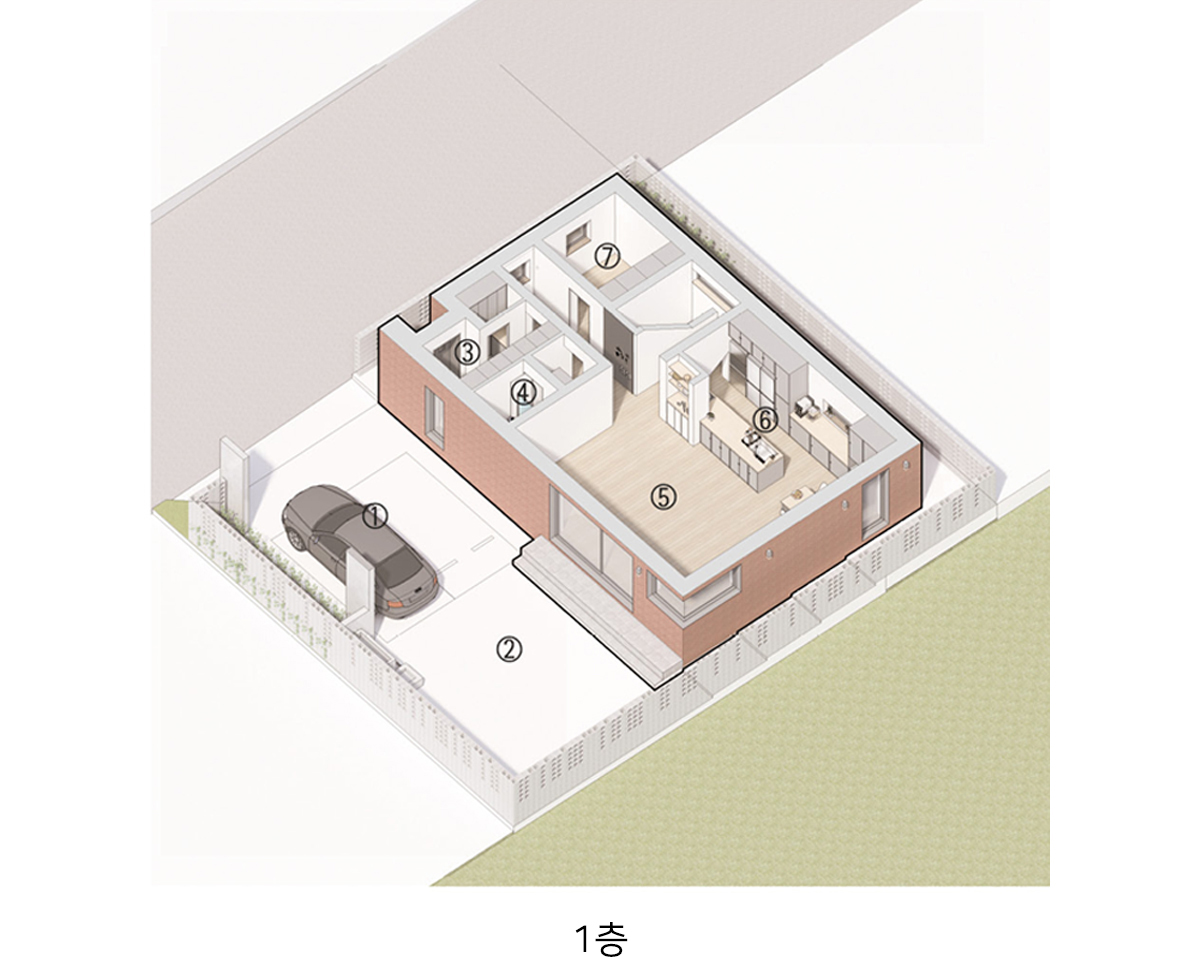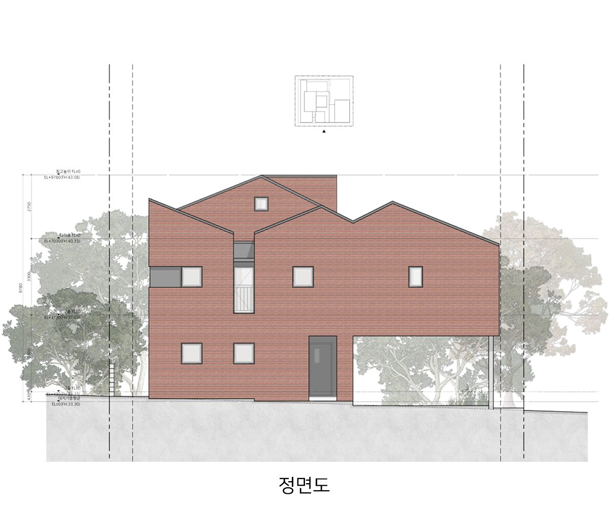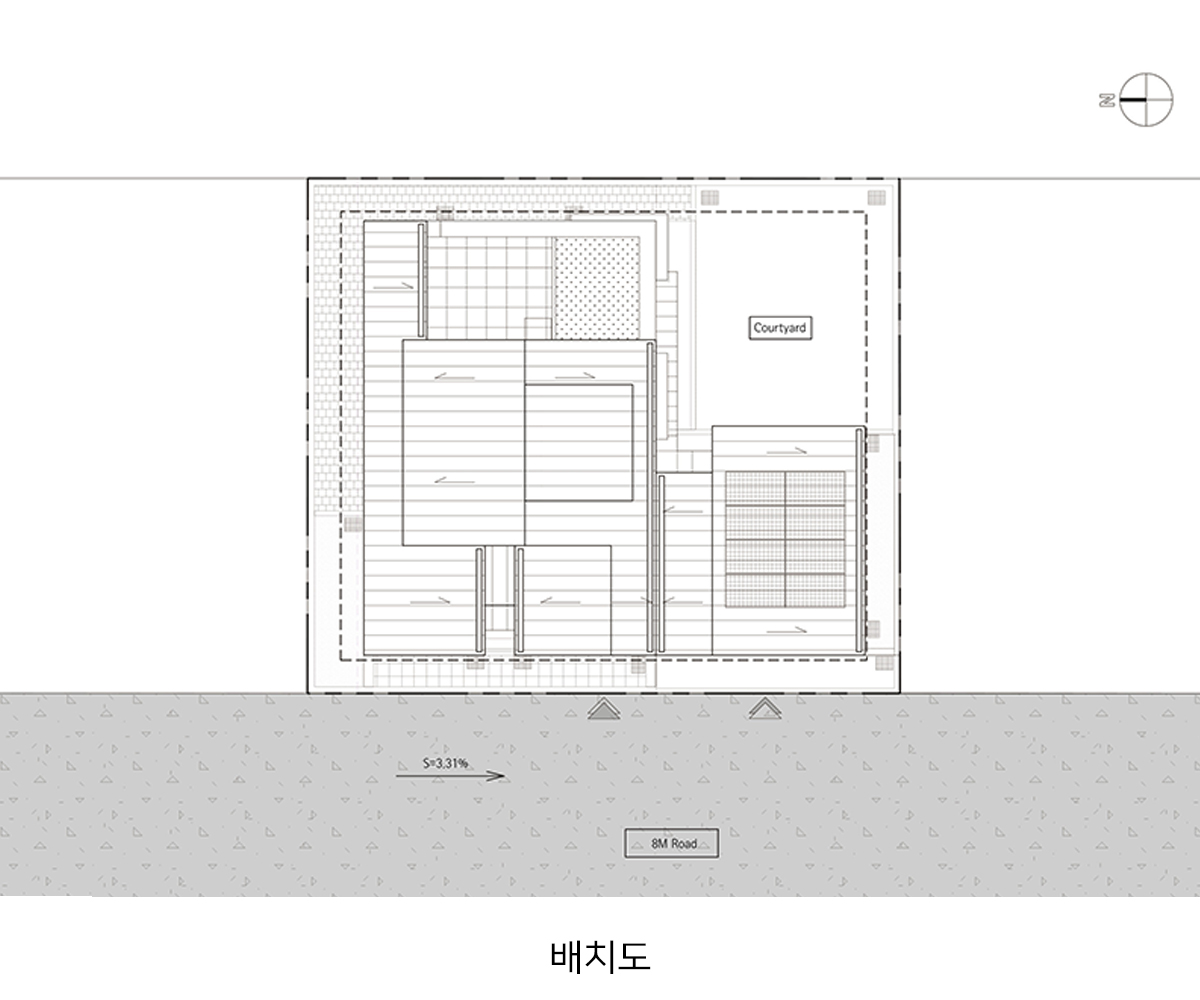 계획 대지는 동탄2신도시 택지지구 내 단독주택 필지로 법정건폐율 50%와 법정용적률 80%의 제한을 받는 필지이다. 거실, 방 등과 같은 필수 주거 공간 외에도 자녀들의 활동을 위한 공간과 부모의 개인 작업 공간을 하나의 건물 안에 담기 위해서는 면적에 대한 고민이 필요했다. 자녀들의 활동 공간을 충분히 확보하는 동시에 효율적인 공간 구성이 가능하도록 공간 내 단차 계획에 주의를 기울였다.