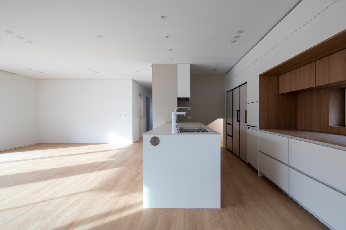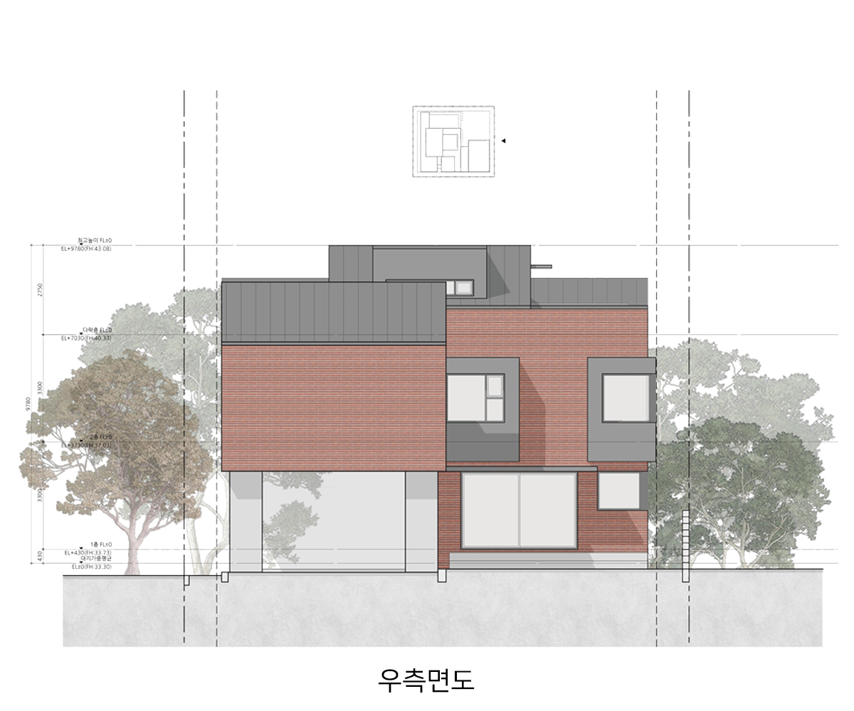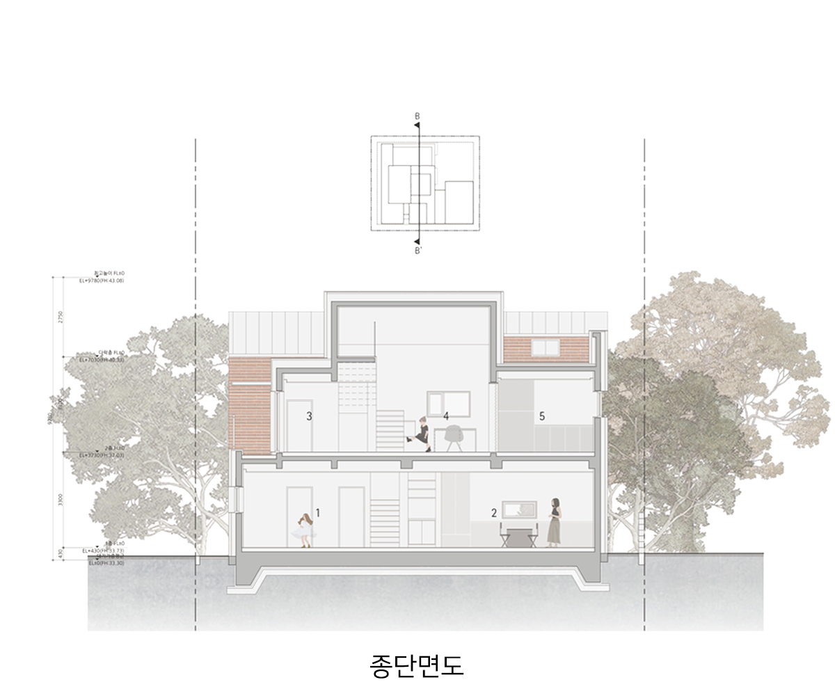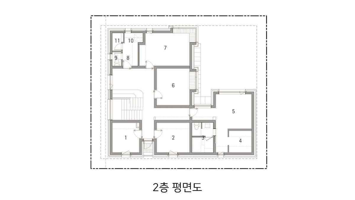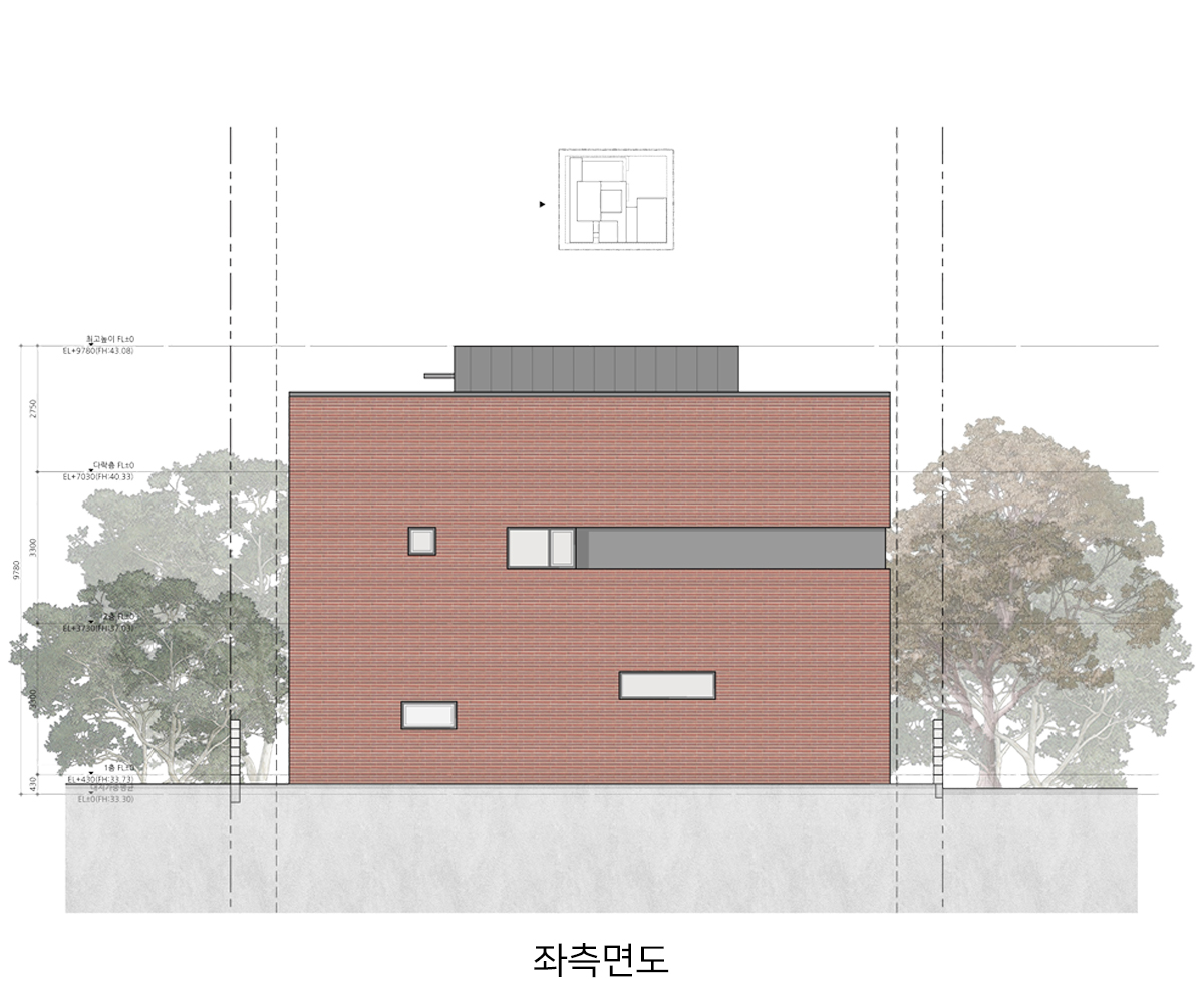 계획 대지는 동탄2신도시 택지지구 내 단독주택 필지로 법정건폐율 50%와 법정용적률 80%의 제한을 받는 필지이다. 거실, 방 등과 같은 필수 주거 공간 외에도 자녀들의 활동을 위한 공간과 부모의 개인 작업 공간을 하나의 건물 안에 담기 위해서는 면적에 대한 고민이 필요했다. 자녀들의 활동 공간을 충분히 확보하는 동시에 효율적인 공간 구성이 가능하도록 공간 내 단차 계획에 주의를 기울였다.