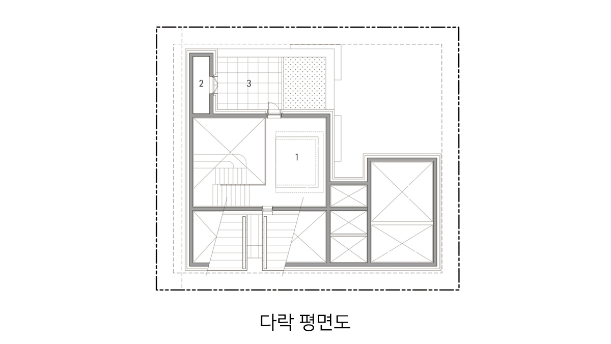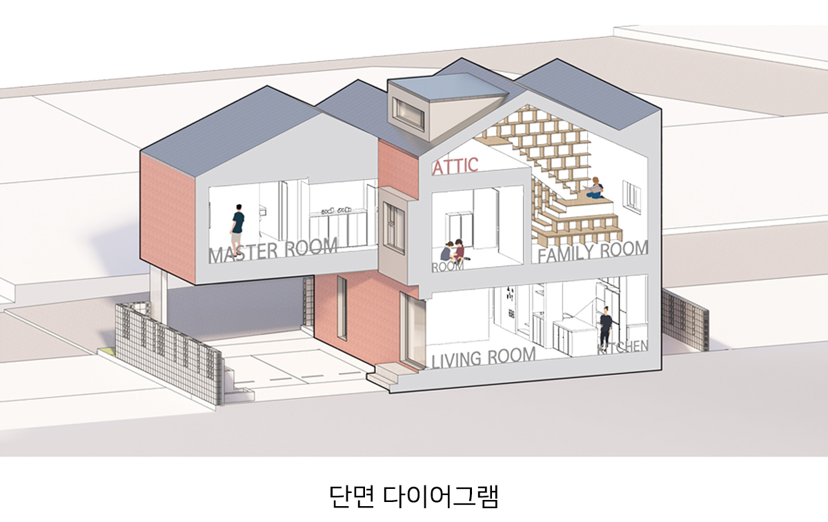 핵심 공간인 다락은 단차를 통해 주택 내의 각 공간에서 다양한 재미를 찾을 수 있도록 계획되었다. 1층 평면 계획의 주안점은 어린 자녀들이 부모님과 많은 시간을 함께 보낼 수 있도록 외부 마당과 연계된 거실, 그리고 자녀들을 바라볼 수 있는 주방 및 식당을 통합한 공간이었다. 2층은 가족만을 위한 프라이빗한 공간으로 부부 공간과 자녀 공간으로 구성했다.