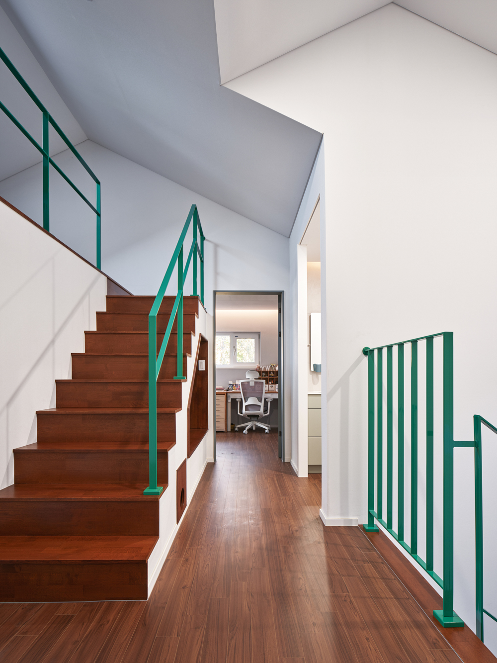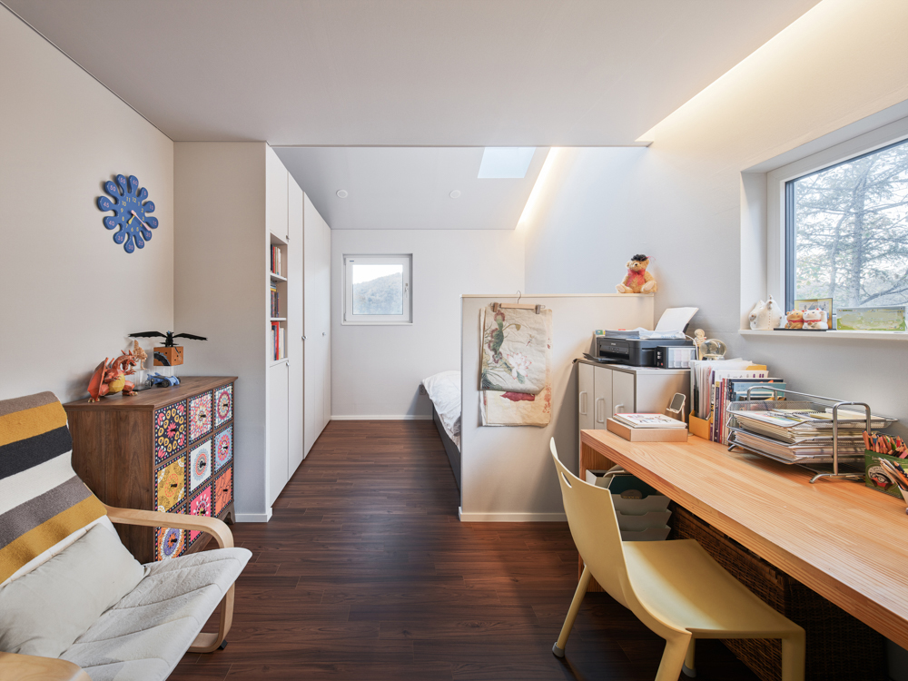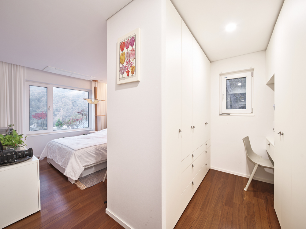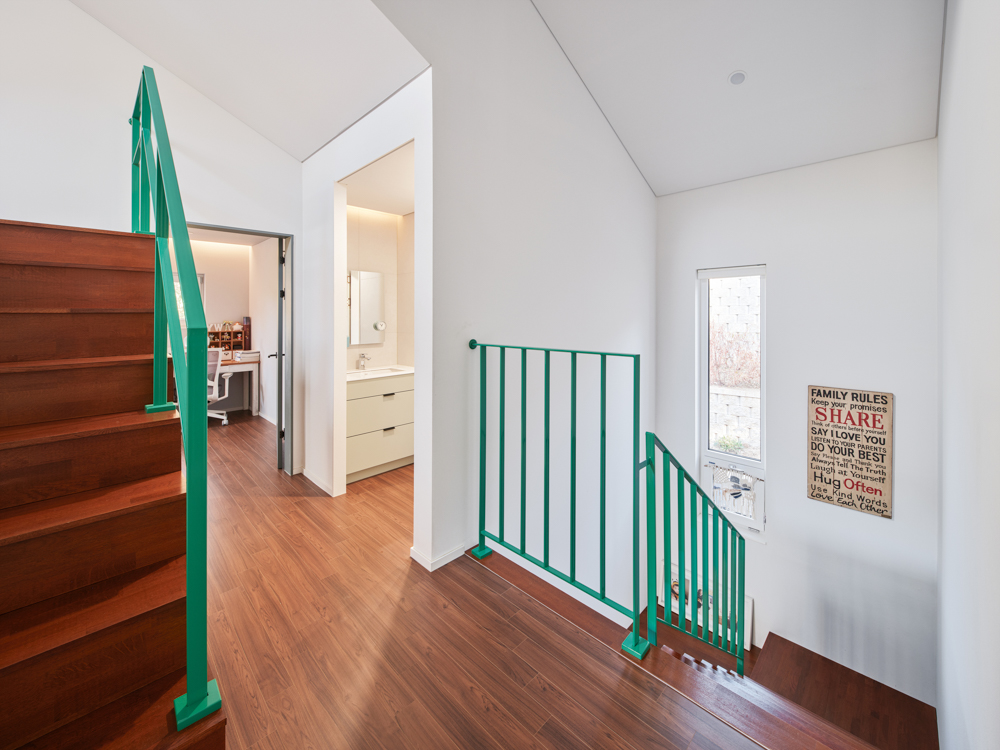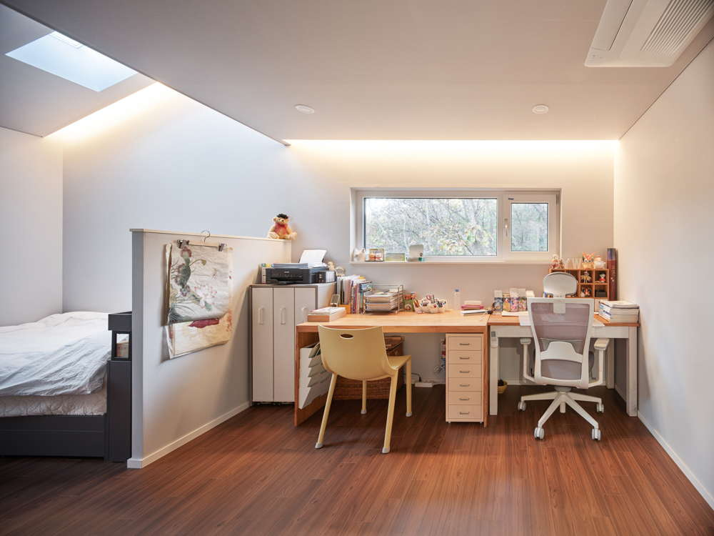 자녀들의 생활공간인 2층의 경우, 두 자녀가 각자 바라는 독립적인 공간을 위해 ‘방 안의 방’을 계획했지만 건물 규모의 한계로 온전히 독립된 숨은 방을 구획하는 덴 어려움이 따랐다. 이를 대신하여 평천장과 경사천장을 혼용해 공간감의 차이로 영역을 구분해 주었다. 밤마다 하늘을 바라보며 잠들 수 있는 공간을 원했던 딸의 공간에는 침대 자리 바로 위에 천창을 내었다.