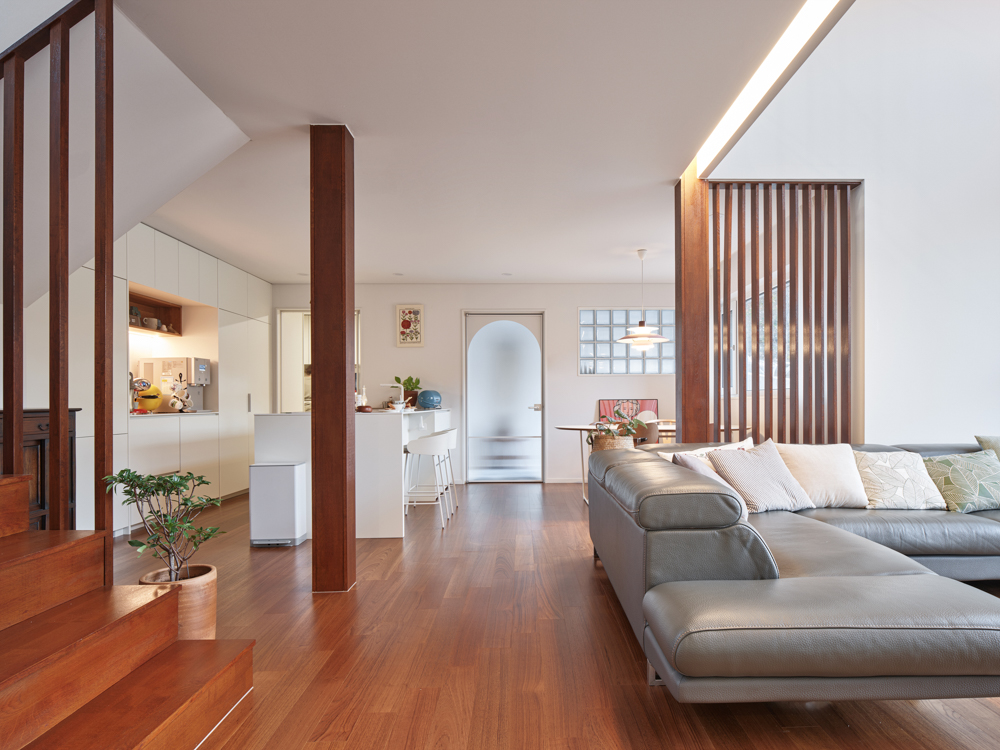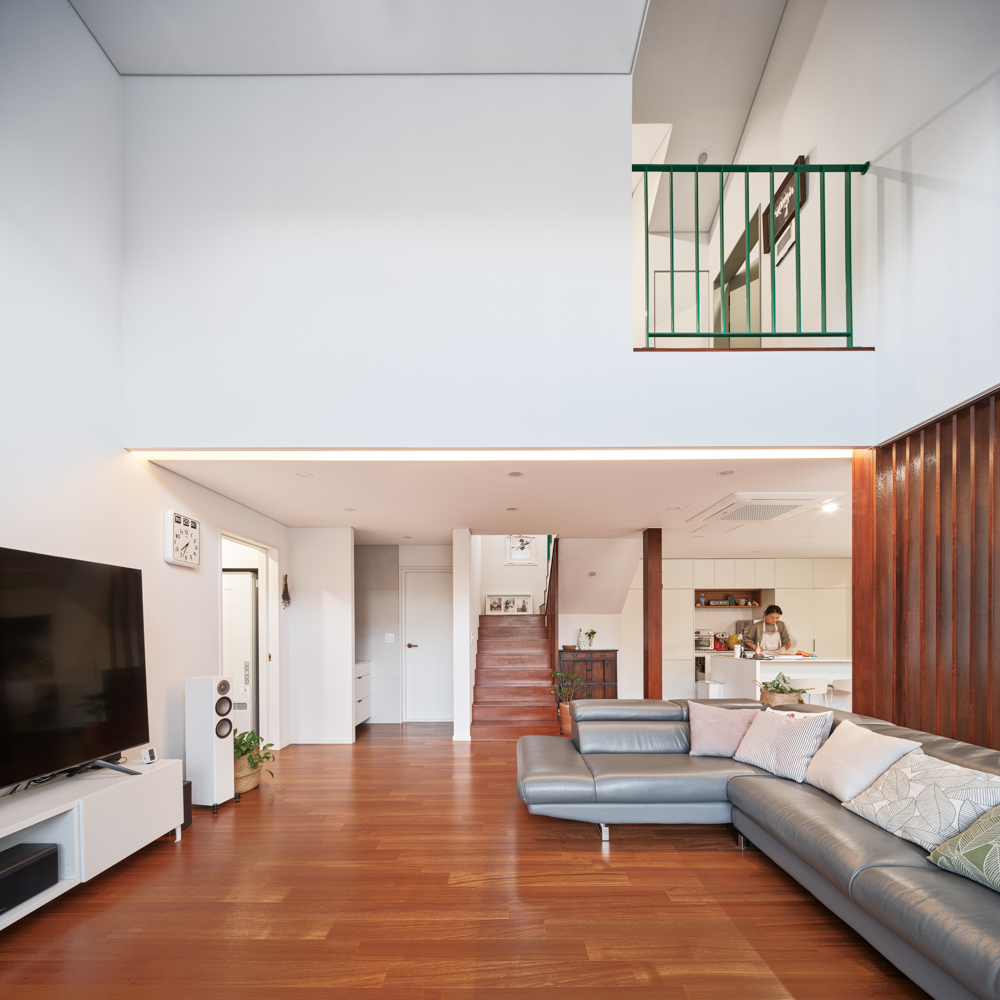각 공간은 천장 디자인과의 관계를 바탕으로 구획했다. 건물의 구조형식인 구조의 연장선 즉, 목재 루버를 통해 1층의 식당과 거실을 일차적으로 구분해 주었다. 그와 동시에 거실 천장을 높이고 주방 및 식당은 낮게 유지하여 공간 전환이 확연하게 느껴지도록 계획하였다.