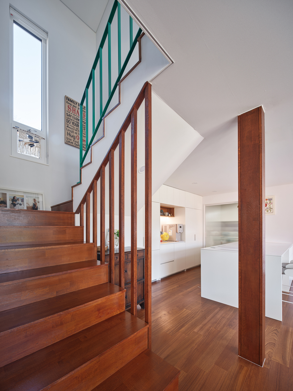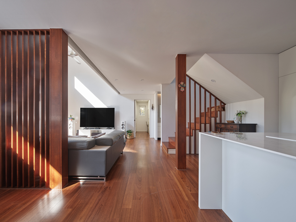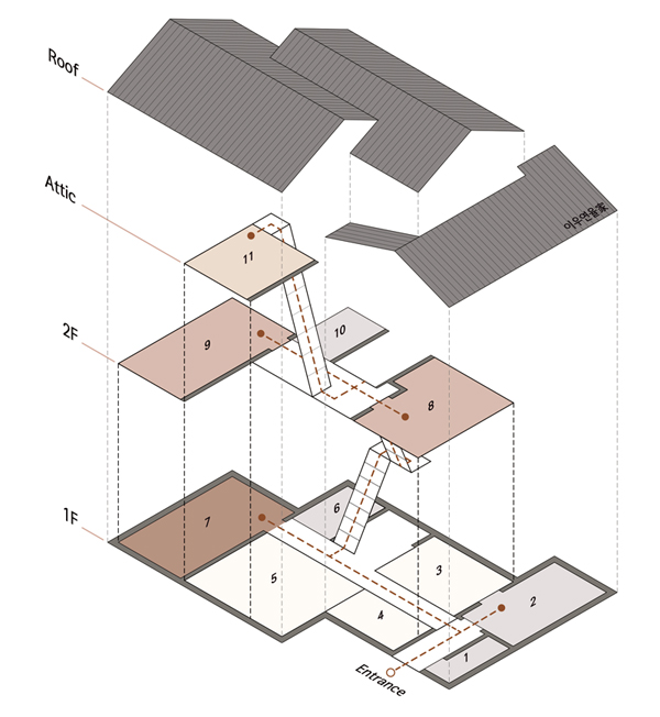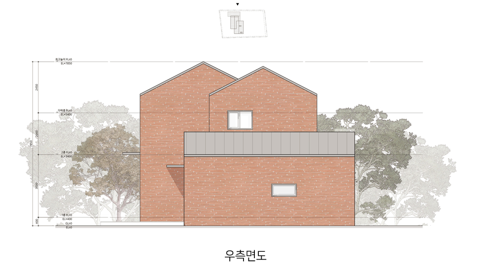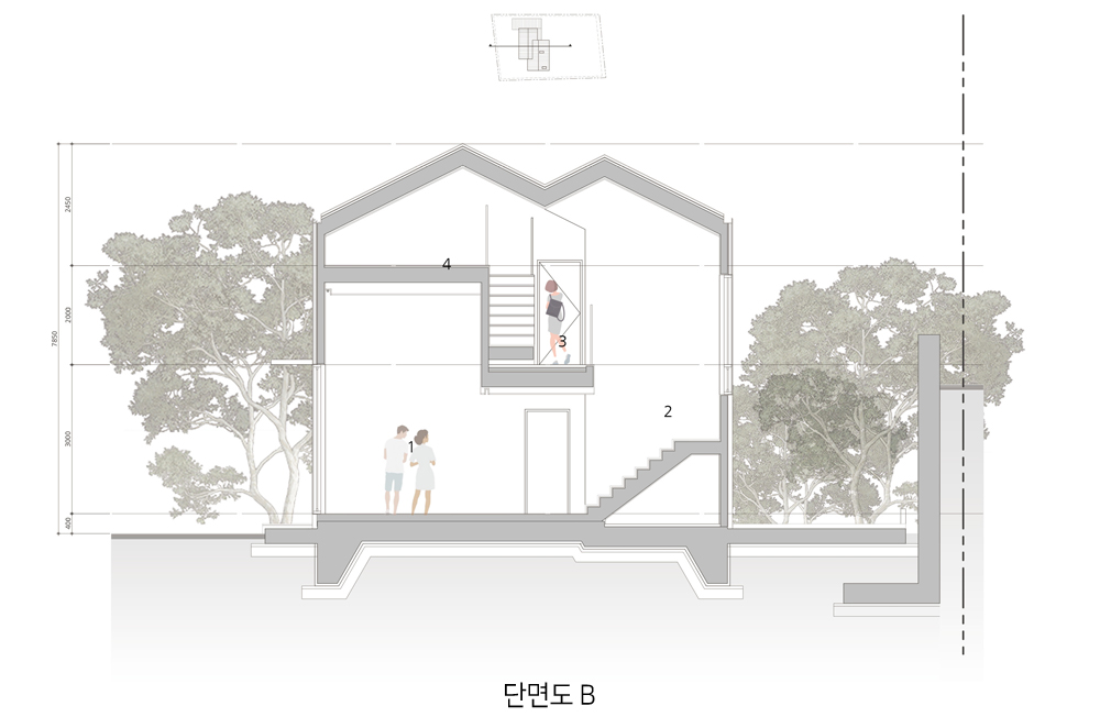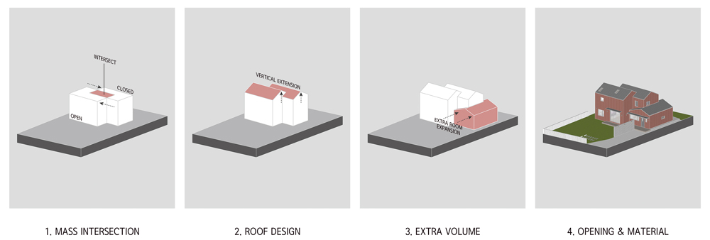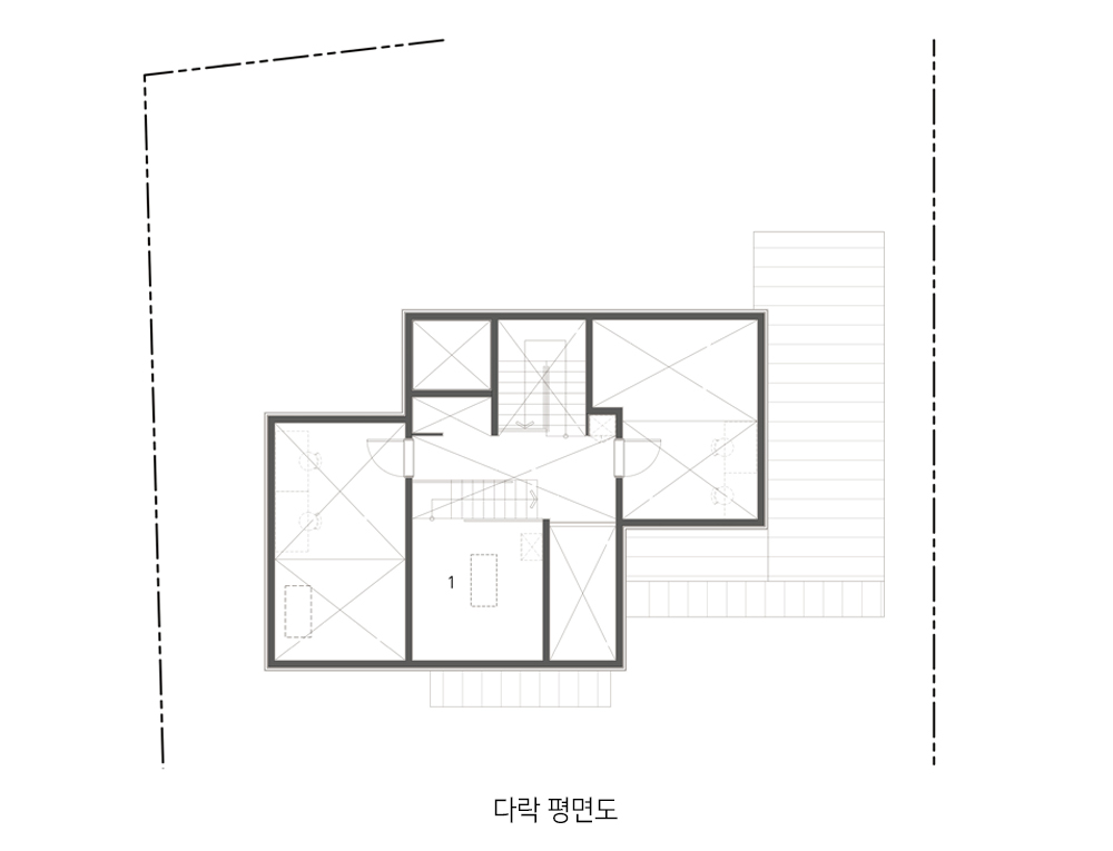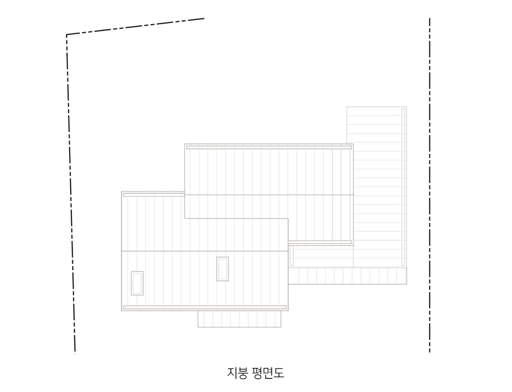 부모와 자녀의 서로 다른 라이프스타일을 고려해 각각 독립된 공간으로 구성한다는 계획이 건물의 형태를 결정했다. 초기에는 현관을 기준으로 명확하게 나뉜 두 개의 집을 구상했지만, 예산 절감과 공간 활용성을 위해 하나의 건물 안에서 각 공간을 분리 배치하기로 결정했다. 대신 지붕을 이용해 시각적으로 독립된 두 영역을 인지할 수 있게 했다. 서로 엇갈리게 중첩시킨 두 개의 박공지붕 덕에, 집은 하나의 건물이지만 개별적인 볼륨의 조합으로 느껴진다.