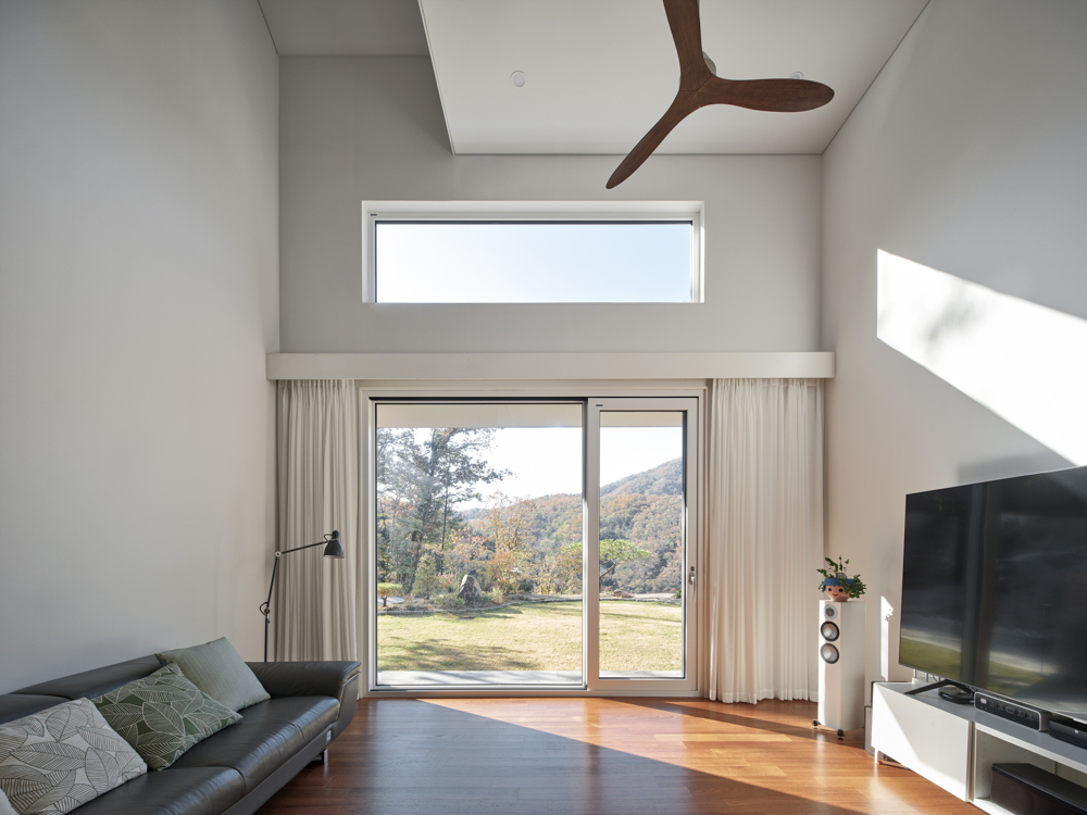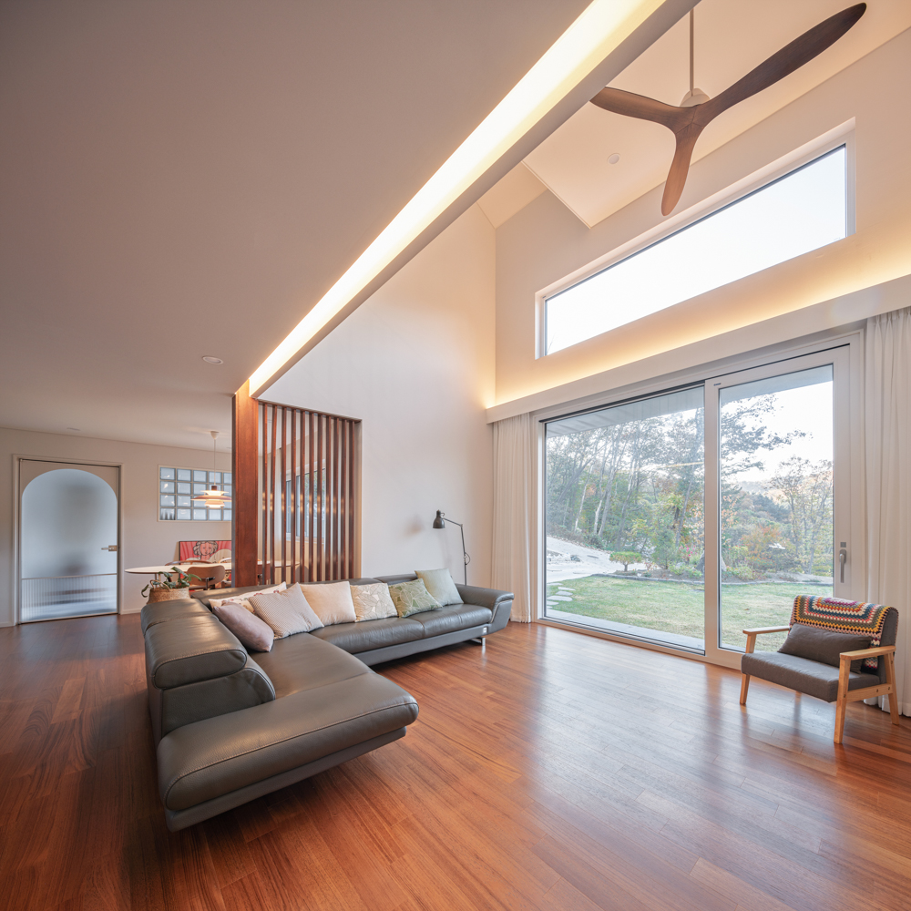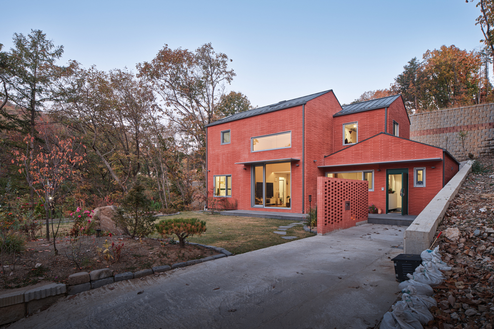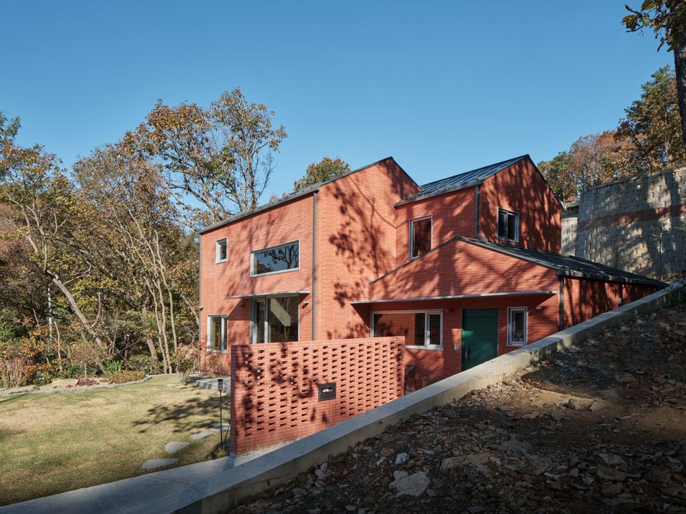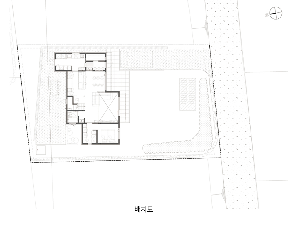 먼저 출입 편의 및 인접 대지와의 단차 보완을 위해 보강토 옹벽을 세워 평지로 만든 다음, 건물을 대지 안쪽으로 배치했다. 이러한 배치로 집은 남쪽의 넓은 마당과 북쪽의 프라이빗한 정원 두 개의 외부 공간을 가진다.