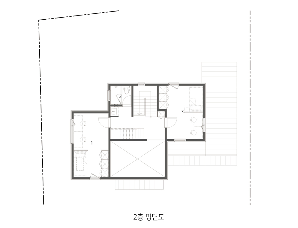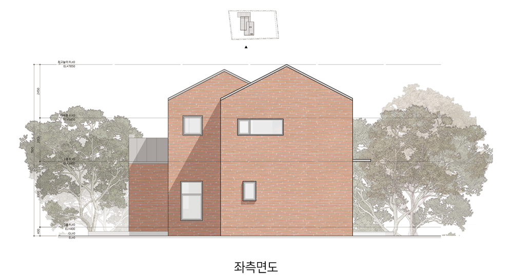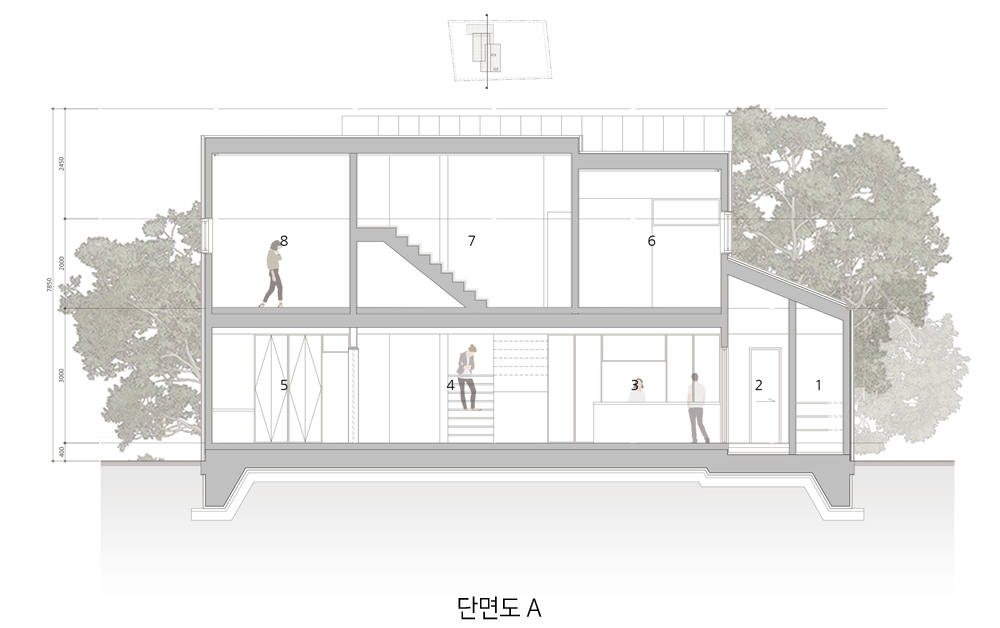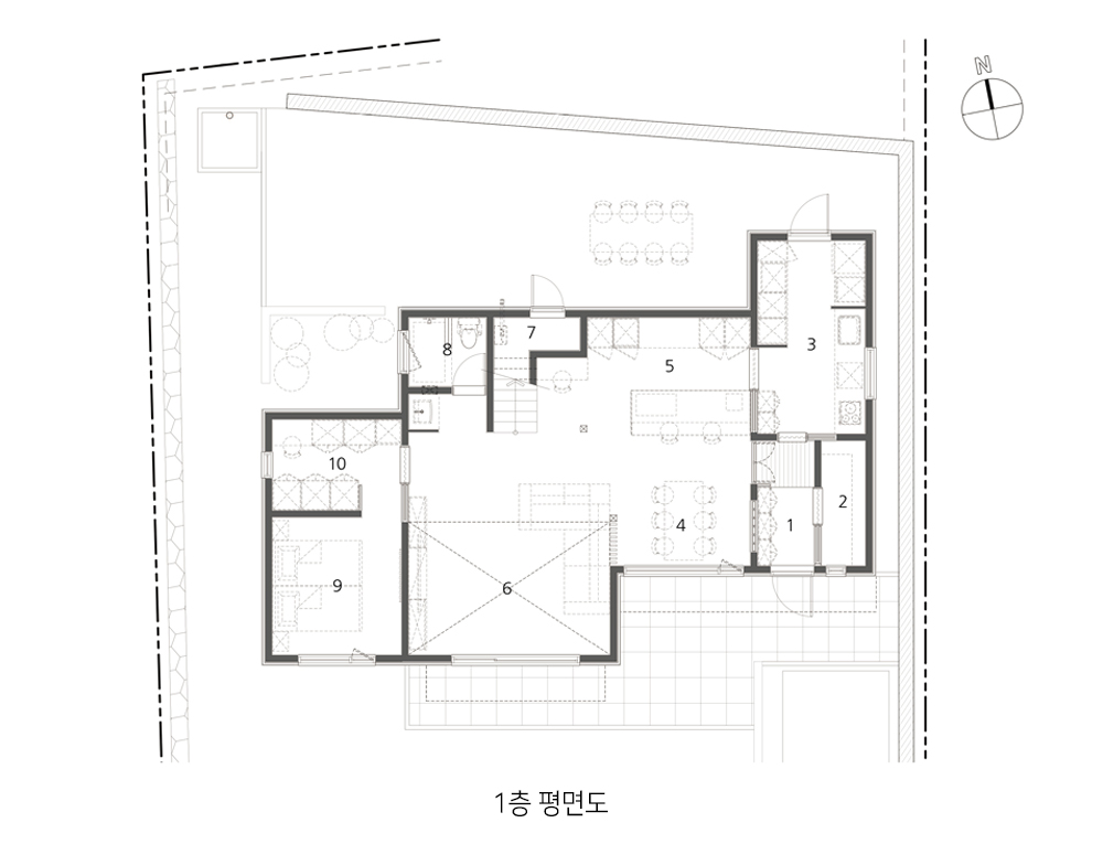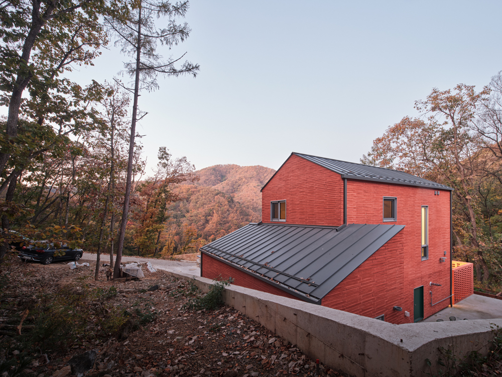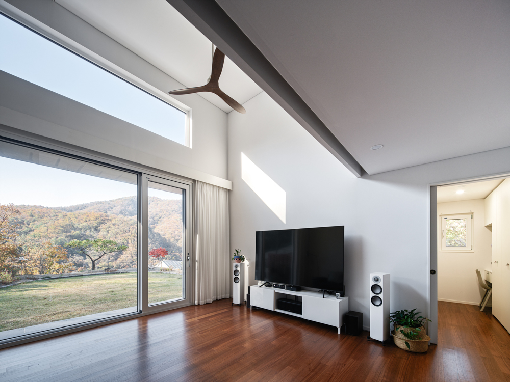 먼저 출입 편의 및 인접 대지와의 단차 보완을 위해 보강토 옹벽을 세워 평지로 만든 다음, 건물을 대지 안쪽으로 배치했다. 이러한 배치로 집은 남쪽의 넓은 마당과 북쪽의 프라이빗한 정원 두 개의 외부 공간을 가진다.