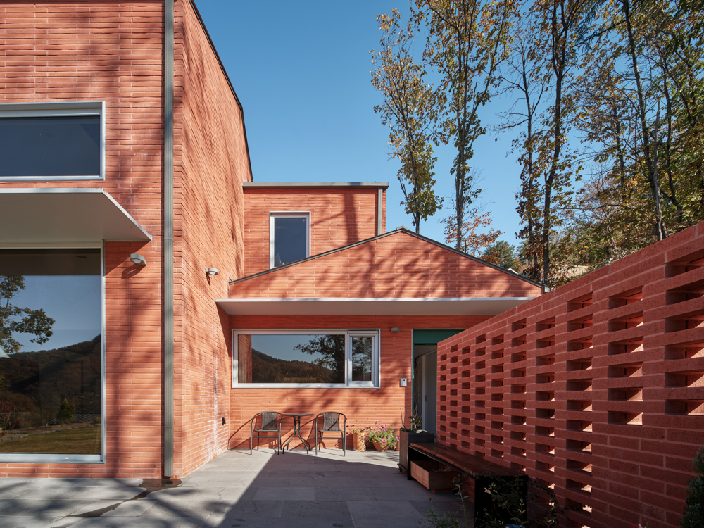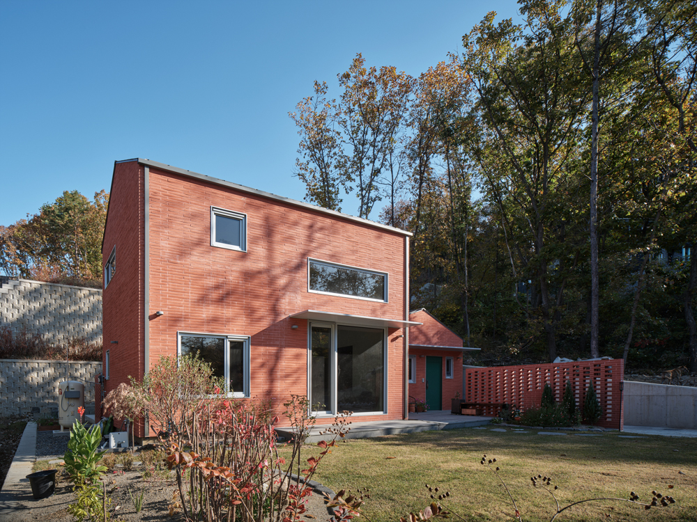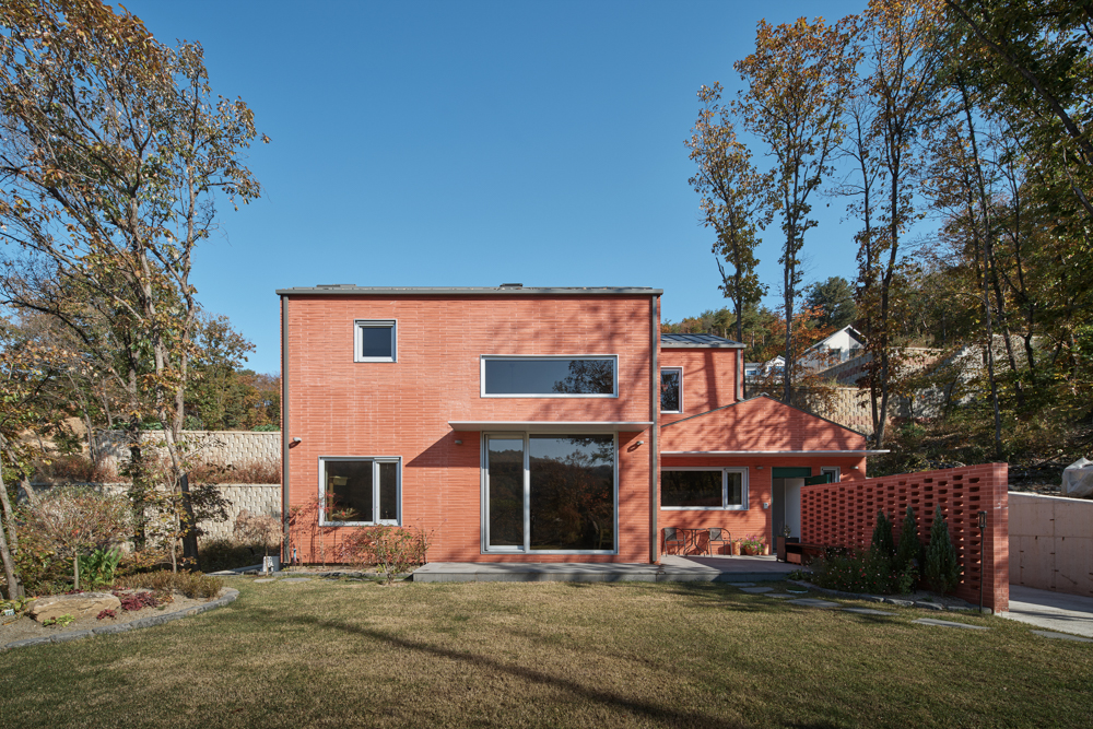 1층 욕실에서도 욕조에 앉아 큰 창을 통해 동쪽의 산 전망을 누릴 수 있다. 추후 주변 대지와 프라이버시 문제가 없도록 외부에 띄워쌓기한 벽돌 담장을 계획해 느슨한 차폐 효과를 주었다.