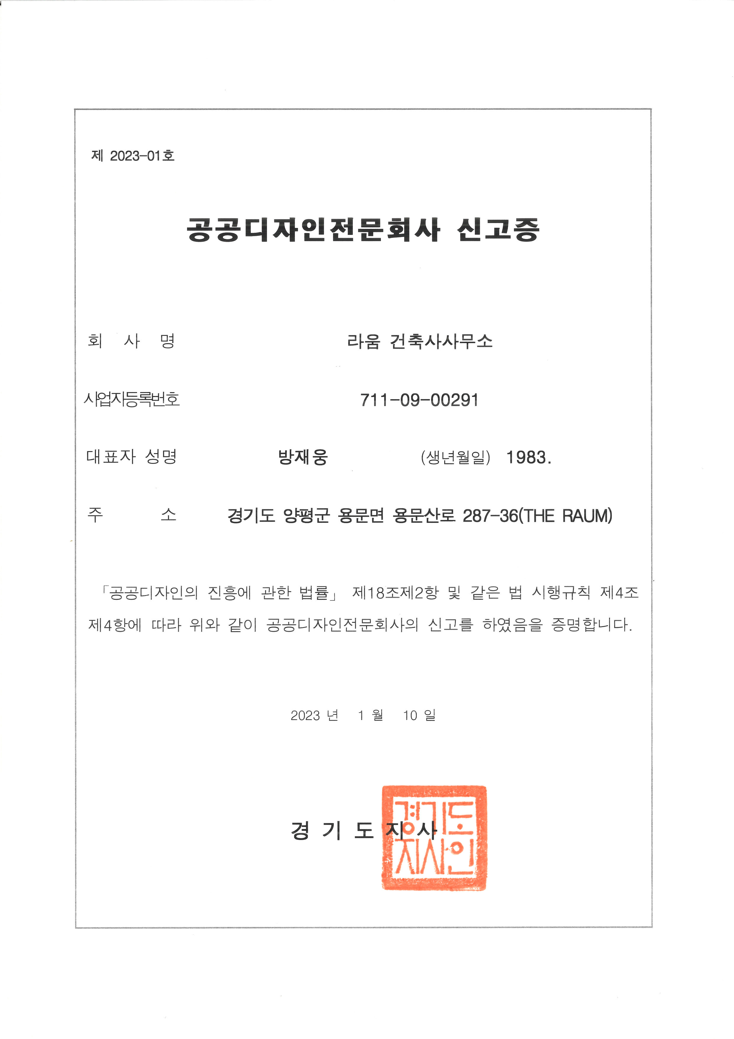 Certificates [경기도] 공공디자인전문회사 신고증 2023년 1월 10일 라움건축사사무소가 경기도의 공공디자인전문회사를 취득하였습니다. 공유하기 게시글 관리 라움 건축사사무소