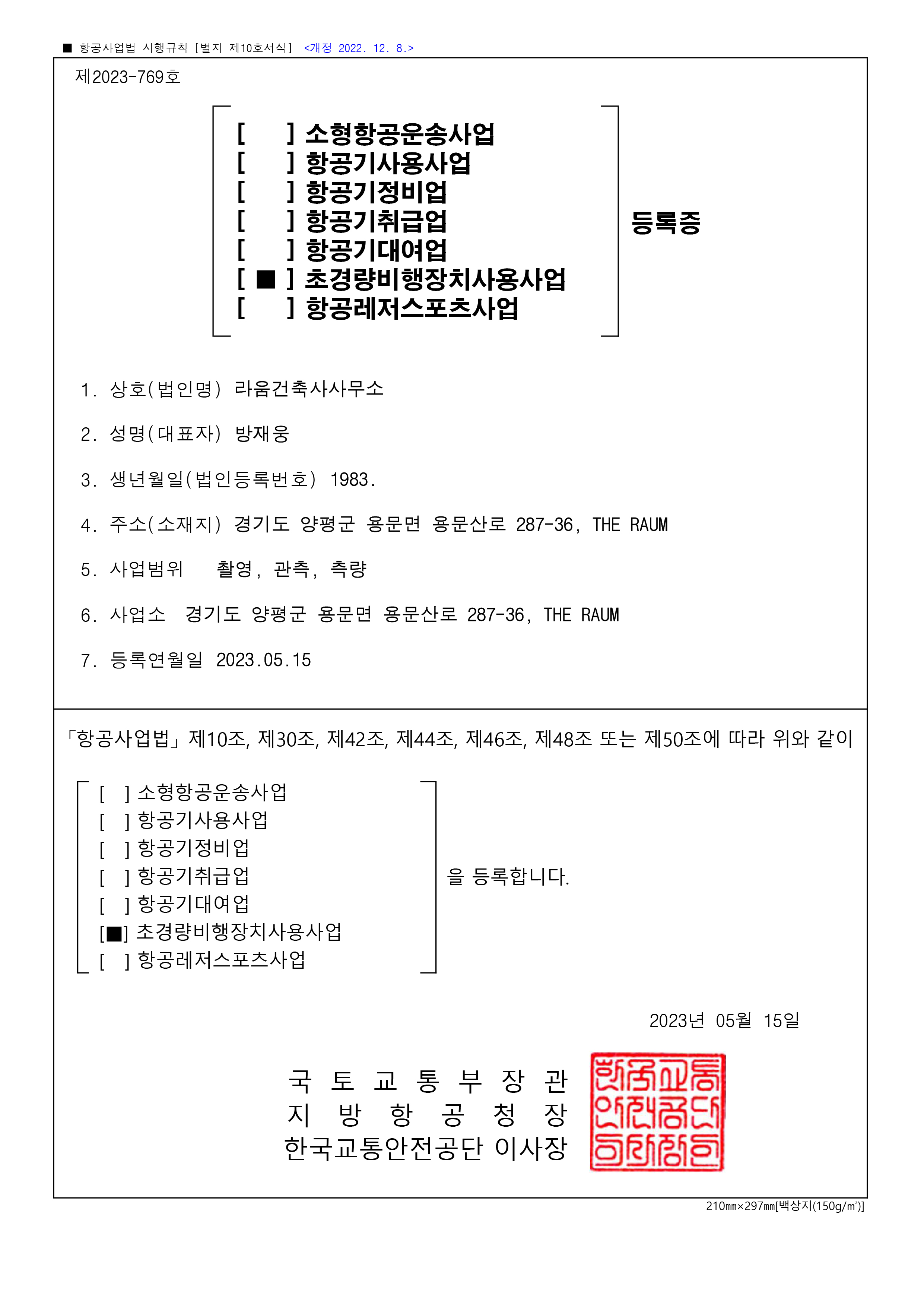 Certificates [한국교통안전공단] 초경량비행장치사용사업 등록증 2023년 5월 15일 라움건축사사무소가 초경량비행장치사용사업 등록증을 취득하였습니다. 공유하기 게시글 관리 라움 건축사사무소