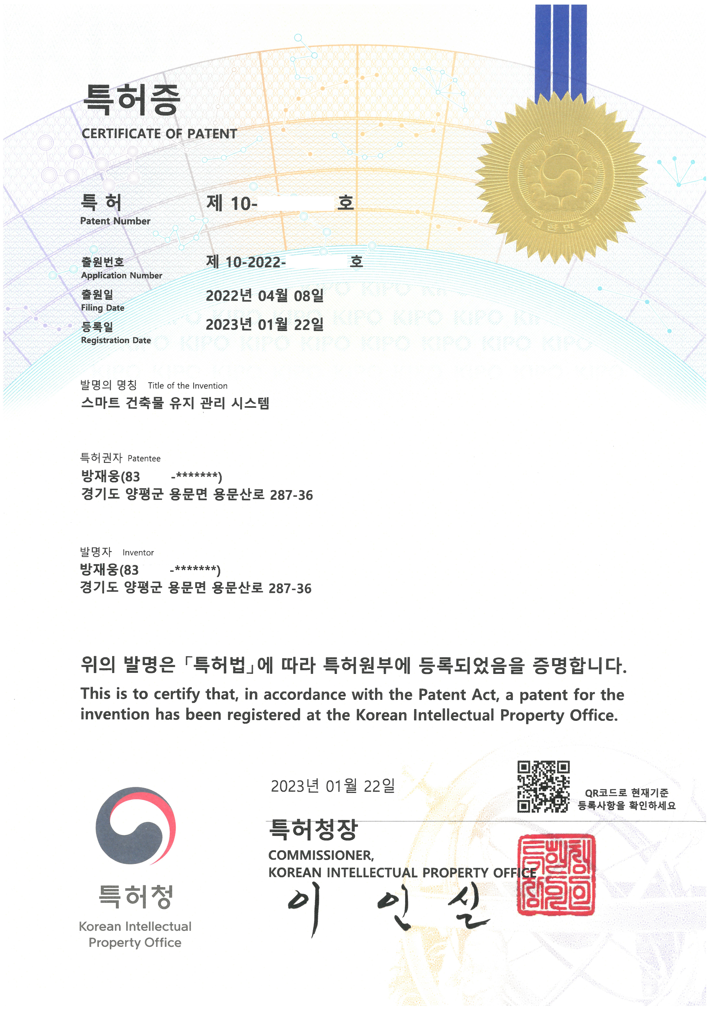 Certificates [특허등록] 스마트 건축물 유지 관리 시스템 2023년 1월 22일 스마트 건축물 유지 관리 시스템 특허가 등록되었습니다. 공유하기 게시글 관리 라움 건축사사무소