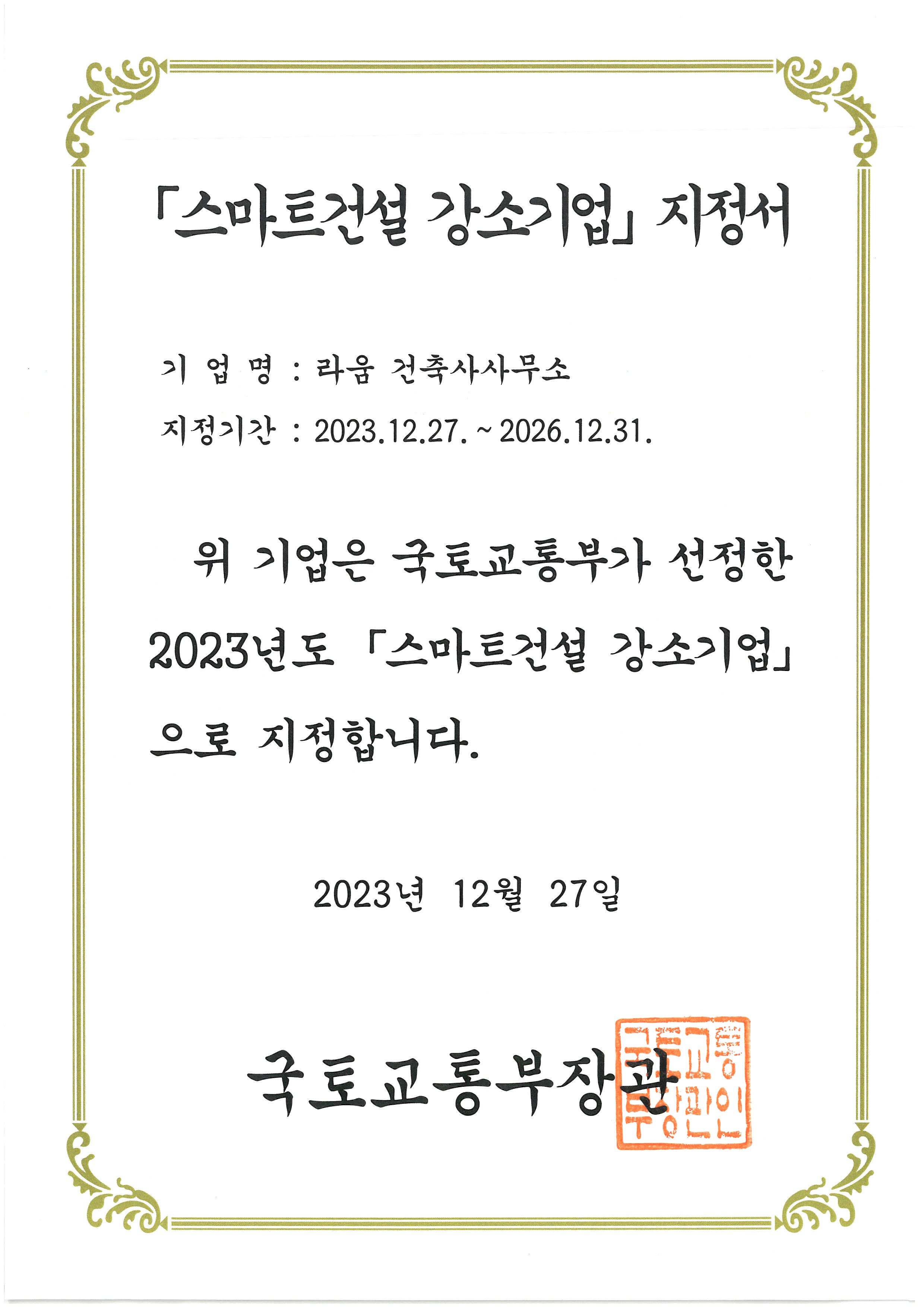 Certificates [국토교통부] 스마트건설 강소기업 2023년 12월 27일 라움 건축사사무소가 국토교통부 '스마트건설 강소기업'으로 지정되었습니다. 공유하기 게시글 관리 라움 건축사사무소