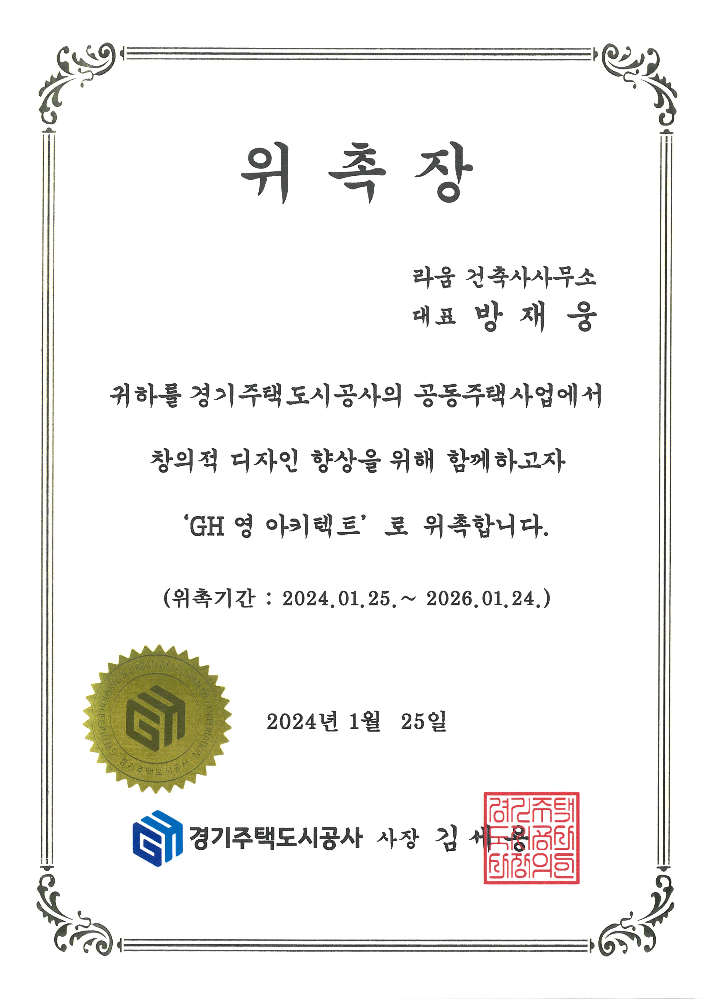 Certificates [경기주택도시공사] GH 영 아키텍트 2024년 1월 25일 경기주택도시공사로부터 "GH 영 아키텍트"로 위촉되었습니다. 공유하기 게시글 관리 라움 건축사사무소