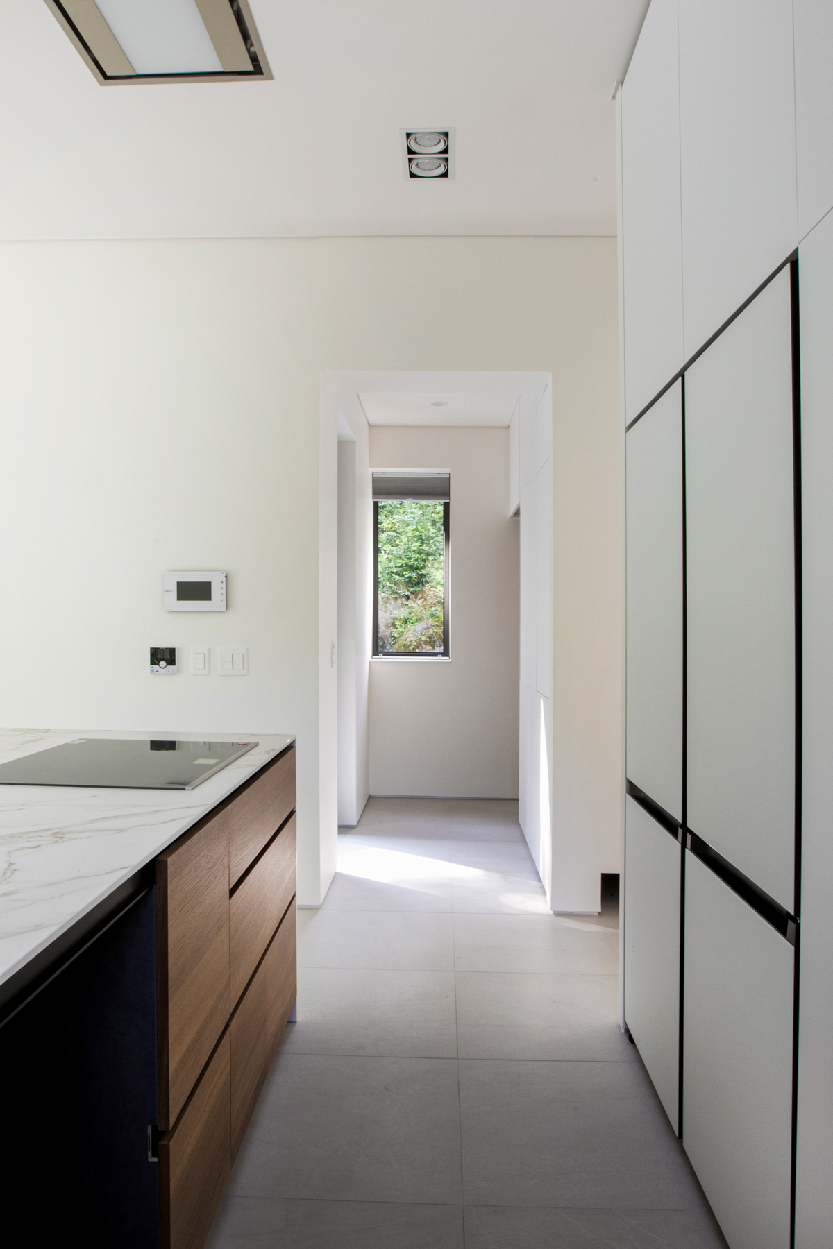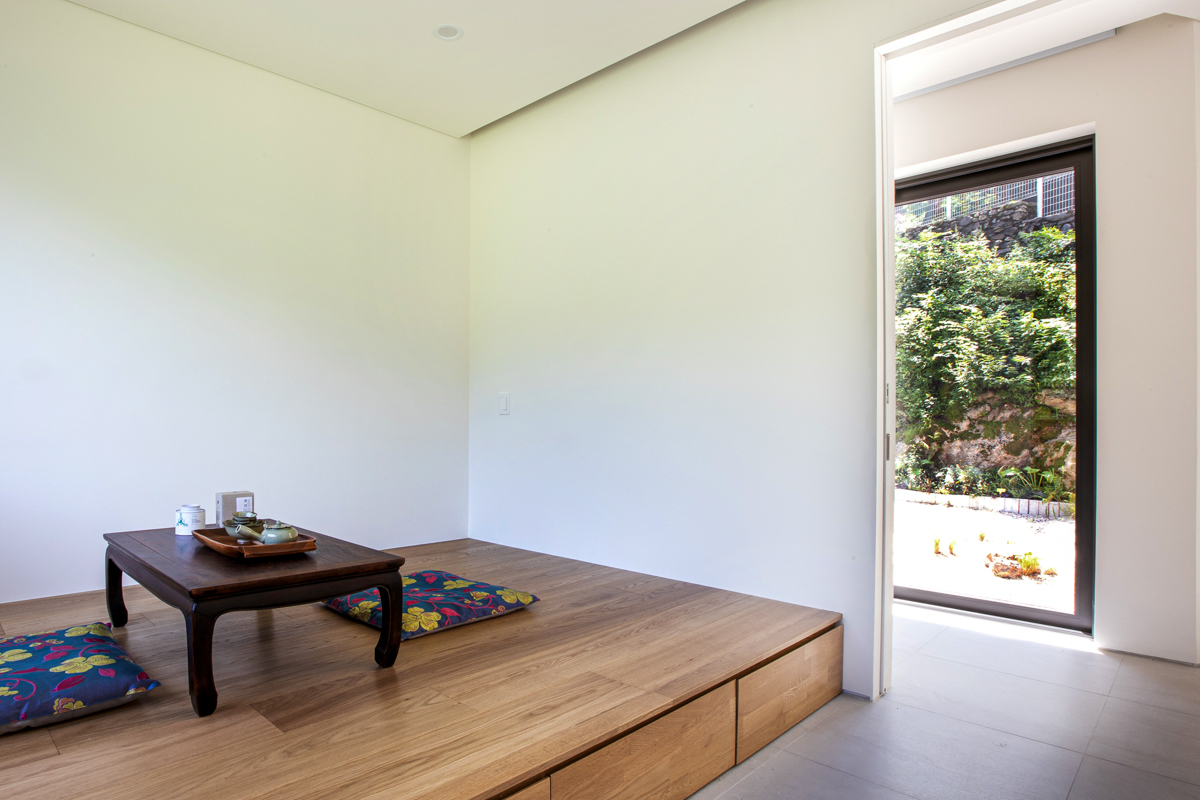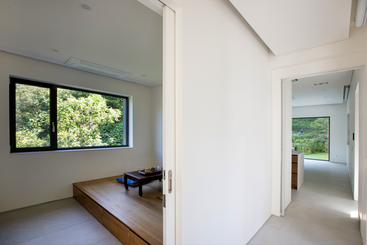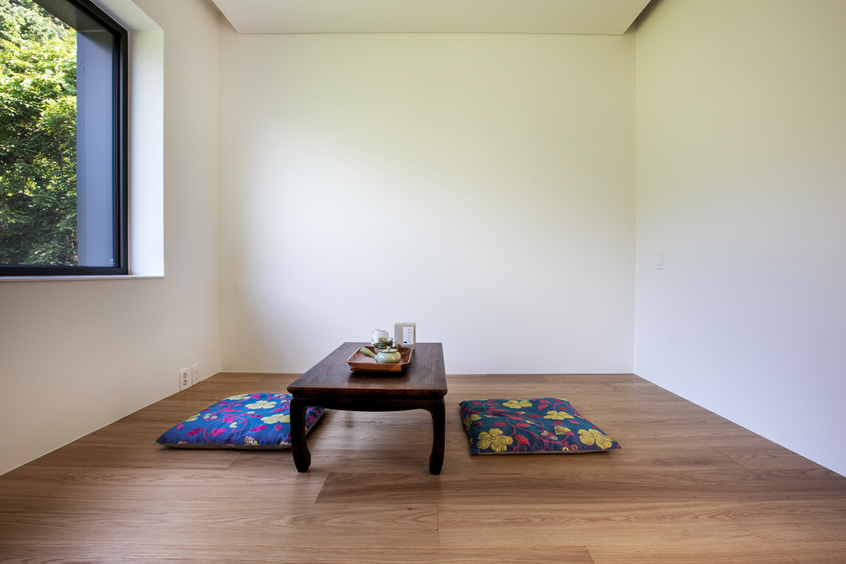 현관 우측 사무실은 후정을 향해 열려있다. 다른 두 공간에 비해 닫혀 있지만 업무에 집중하기에는 가장 효율적이고 적합하다. 현관에서 좌측으로 돌아서면 복도 왼편으로 또 다른 성격의 공간이 나타난다. 평상을 짜 넣은 이 공간에서 편안하고 따뜻한 분위기로 상담을 진행하게 된다. 산 전망을 바라보지만 내부가 과하게 노출되지 않아 상담 중 동물이 안심할 수 있도록 창호의 높이를 조절하였다. 내부 동선 끝에 위치하는 사무 공간은 가장 개방감 있는 공간으로 연출했다. 벽면의 큰 통유리 창, 다른 공간보다 높은 층고는 이동할 때마다 다양한 공간감을 선사한다.