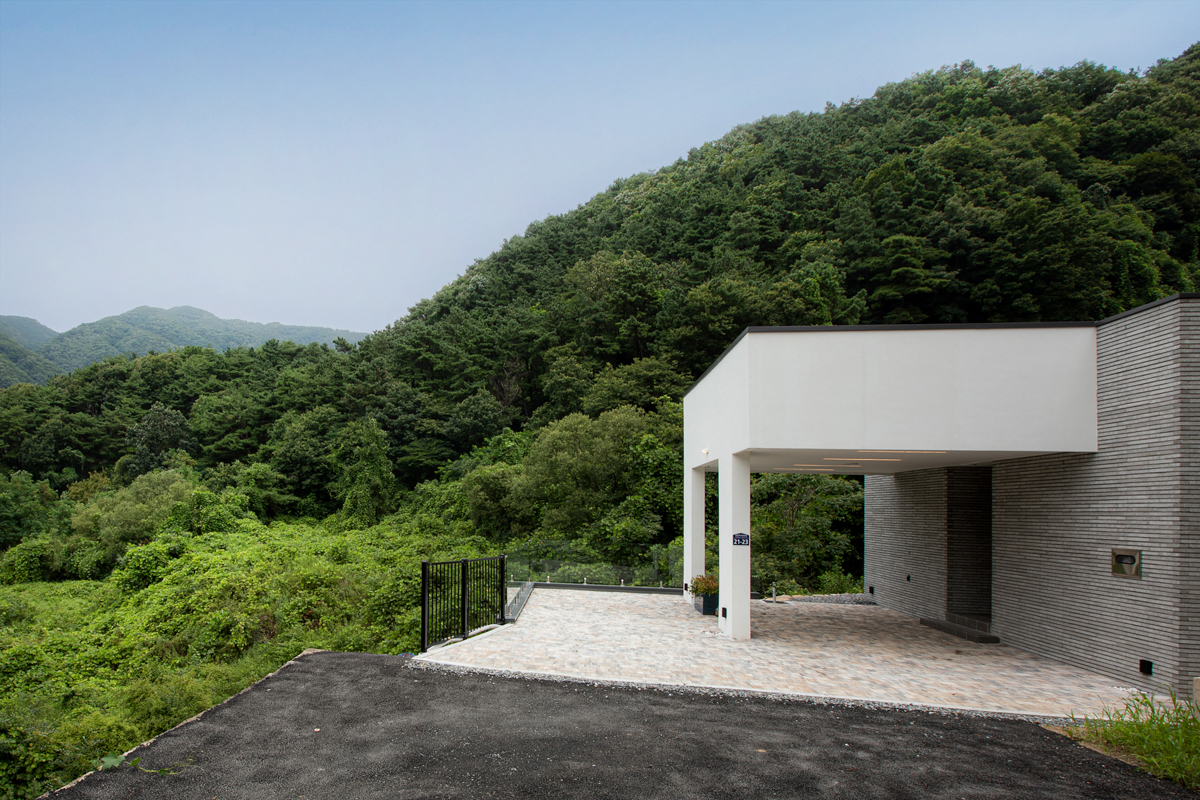 경사가 급하고 중간에 구거(개울)가 흐르는 대지 특성상 넓은 면적에 비해 실질적으로 건축이 가능한 영역은 넓지 않았다. 도로에 접한 면이 짧아 진입 공간은 이미 정해져 있었고, 도로에 가깝게 건축물을 배치하여 주차 진출입로와 내부로의 동선을 단축하여 정원 공간을 최대한 확보해주었다. 이로 인해 나머지 야외 공간에는 건축주의 취향을 담은 조경 계획이 가능했다.