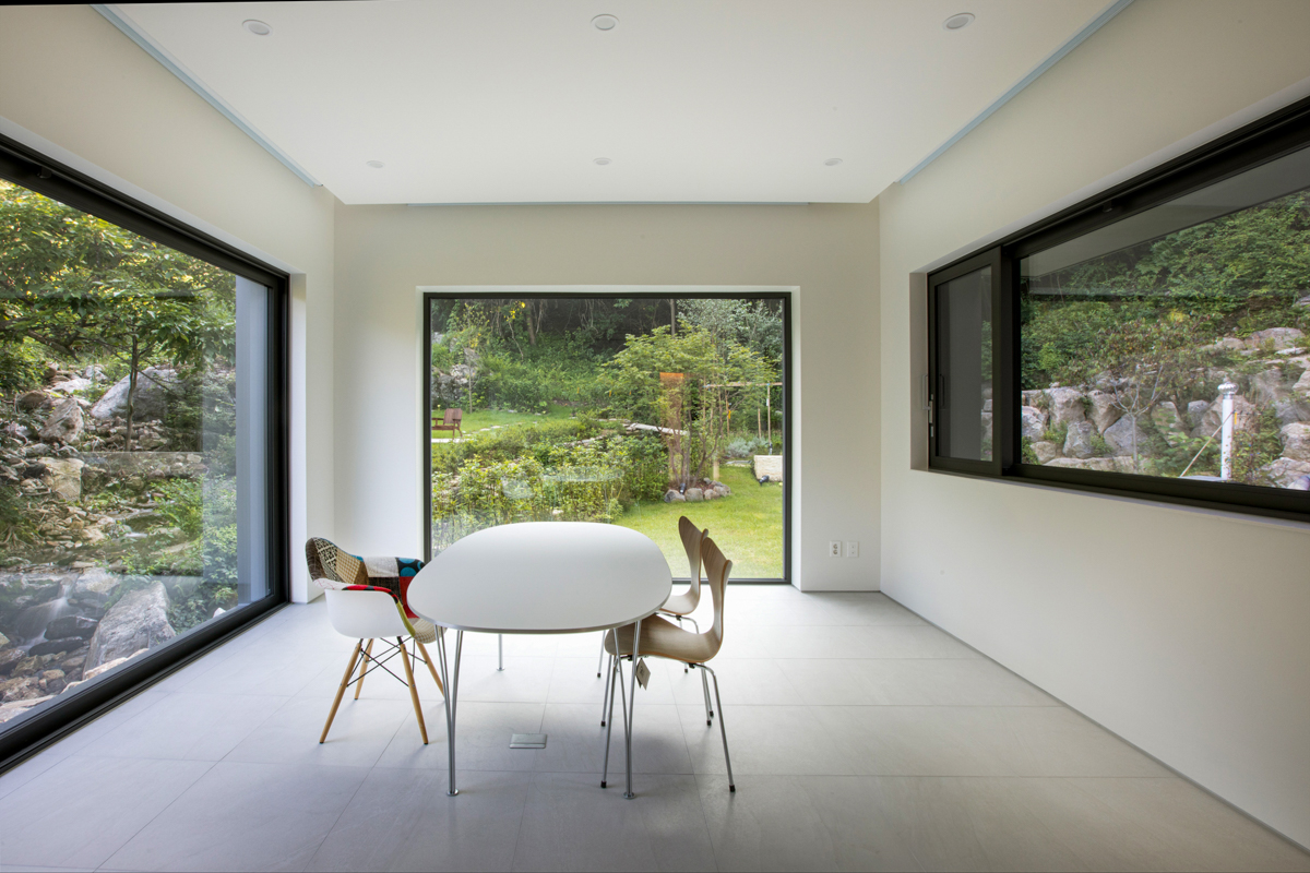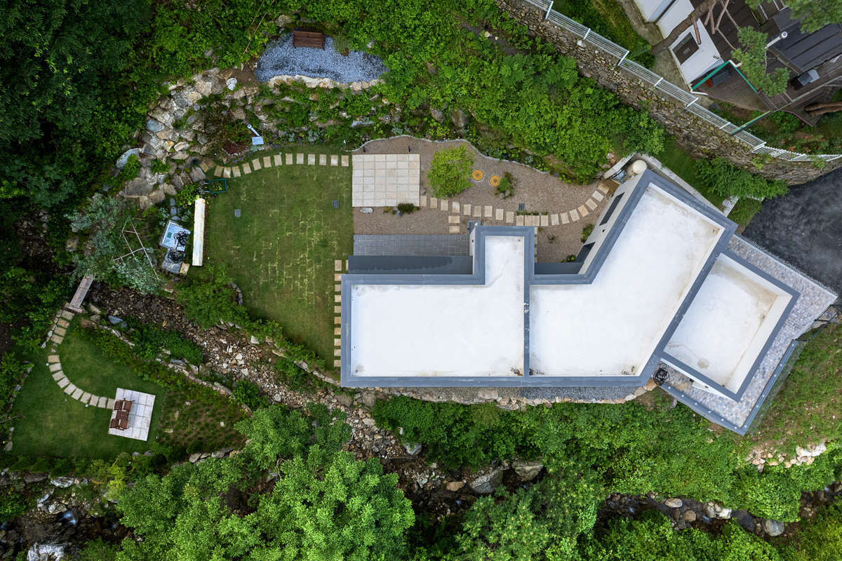 건축주는 급경사지와 구거(개울)로 분리되어있는 대지의 활용에 대한 고민이 많았다. 상담을 통해 영역별로 다양한 테마를 갖춘 사적인 정원으로 가꾸는 방향을 제안, 외부 조경 계획을 고려하여 건축 설계를 진행했다. 내부에서는 넓게 트인 환경을 최대한 활용해 산지와 정원을 전망할 수 있기를 바랐다.