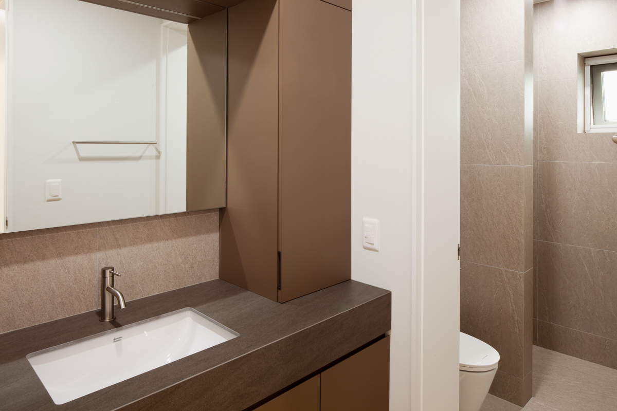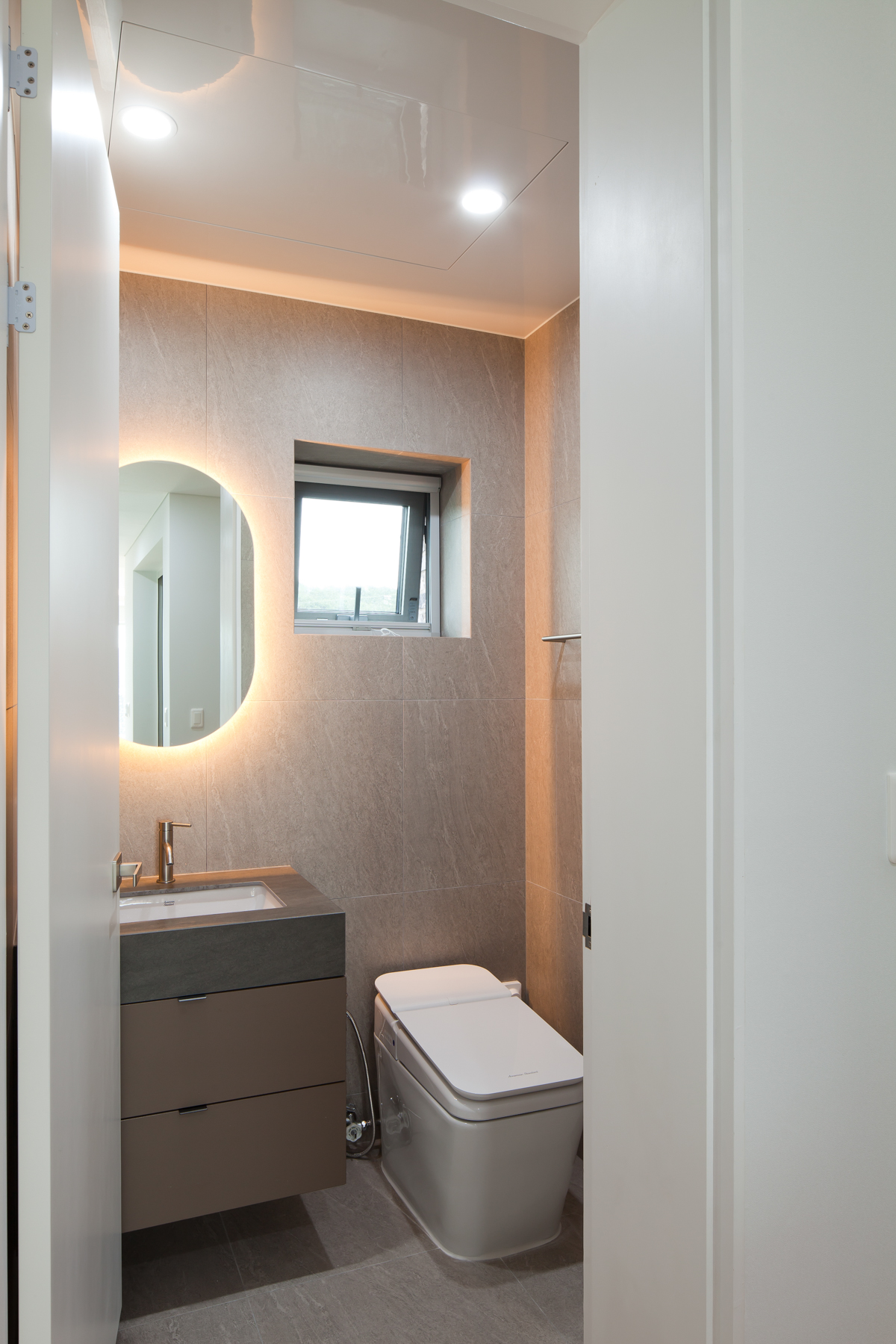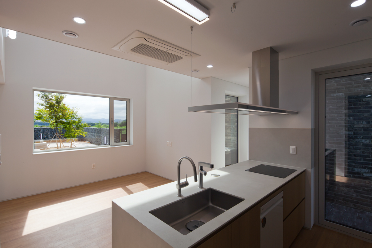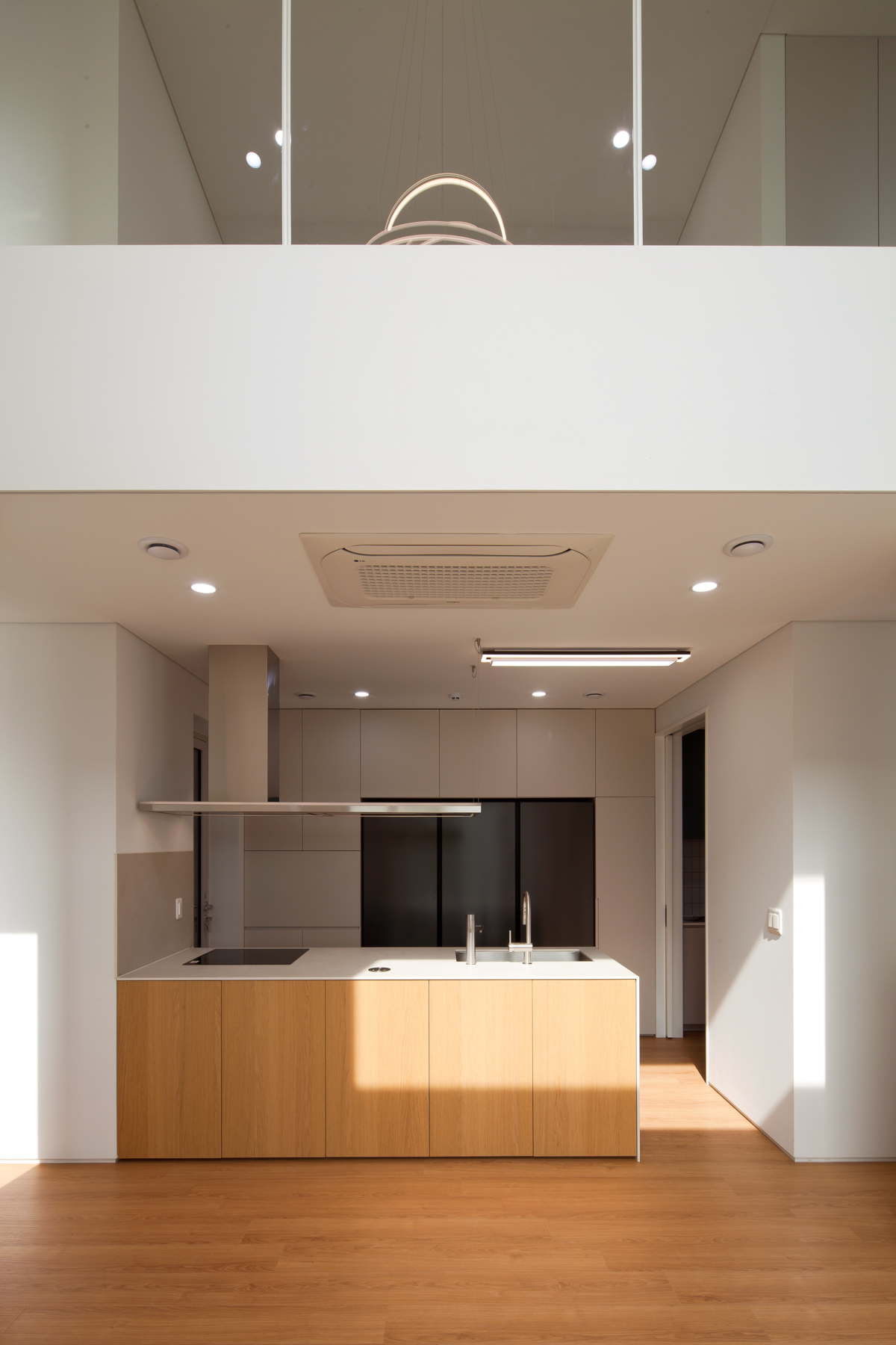 중간 매스는 비교적 차분한 공간으로, 손님과 함께 차와 다과를 즐길 수 있도록 1층에 주방, 식당을 배치했다. 공적, 사적 영역이 미묘하게 뒤섞인 이곳에선 각 실의 연결을 중점적으로 계획했다. 식당 상부를 오픈하여 2층 가족실과 연계하는 동시에 개방감과 쾌적함을 제공하고, 식당과 거실은 명확하게 분리되어 있지만 서로 마주 보는 방향으로 넓은 창을 내어 각각의 공간과 연계된다.