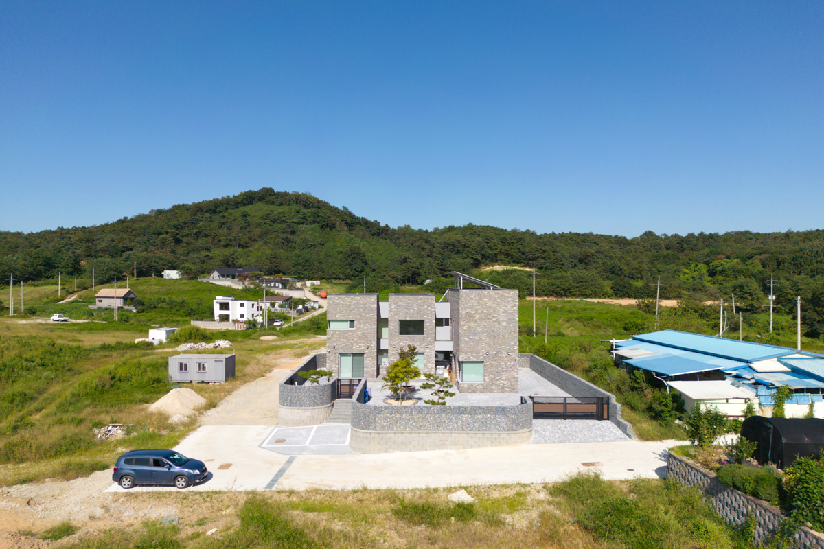전면 도로보다 1.5m가량 높은 곳에 조성된 대지에는 보강토 옹벽으로 인한 단차가 존재했다. 필지 자체는 잘 구획되어 있고 자연의 중심에 있어 원경이 좋은 대지지만 주변 환경 개선을 위한 도로포장, 다짐 등 토목작업이 아직 마무리되지 않은 상황이었다.