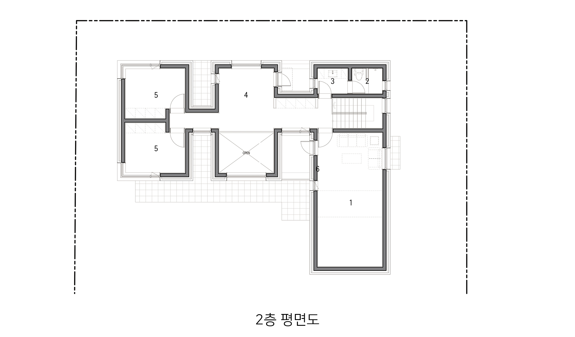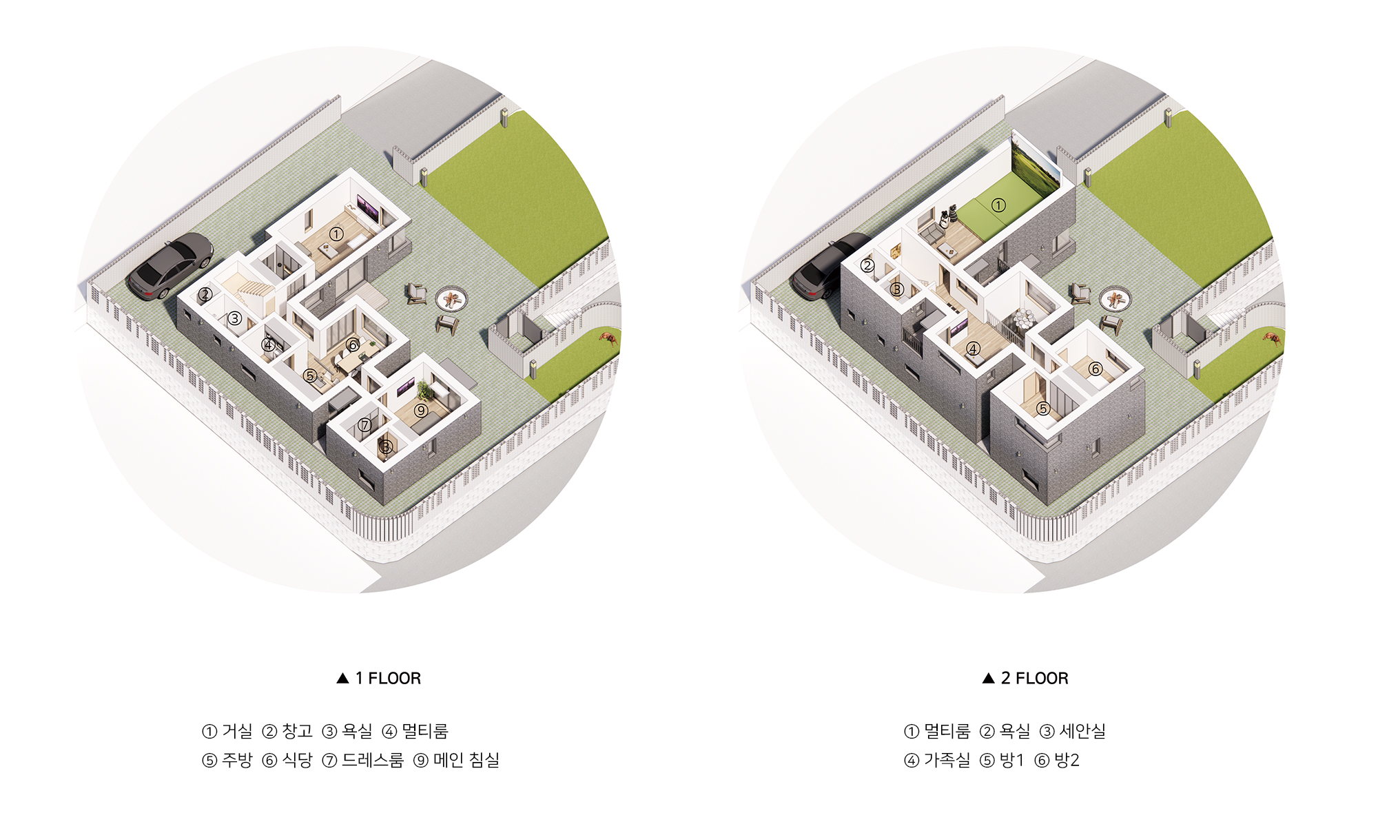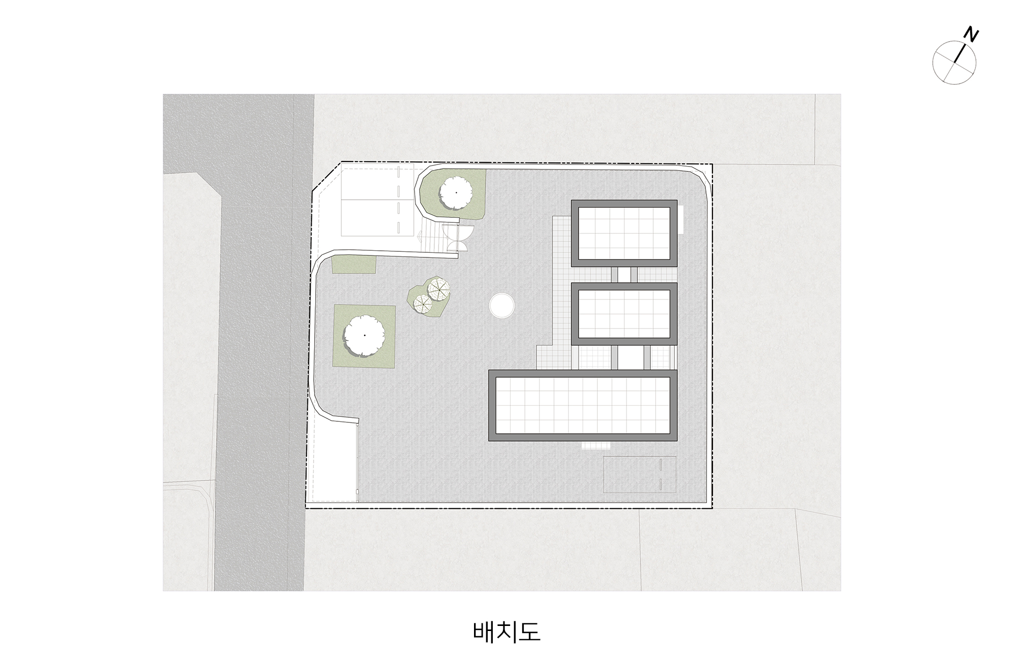 계획은 공간 이용자를 건축주 부부와 손님으로 구분하는 데 중점을 두었다. 외부는 손님의 주차 영역을 옹벽 아래에, 건축주의 주차를 건물 옆에 계획하여 불필요한 동선 없이 바로 현관 출입이 가능하게 해 편의성을 확보하였다. 내부 또한 현관에서 가장 가까운 곳에 손님과 함께하는 공간을, 가장 안쪽에 사적인 침실 영역을 두어 의도적으로 공간 사이의 위계를 조성했다.