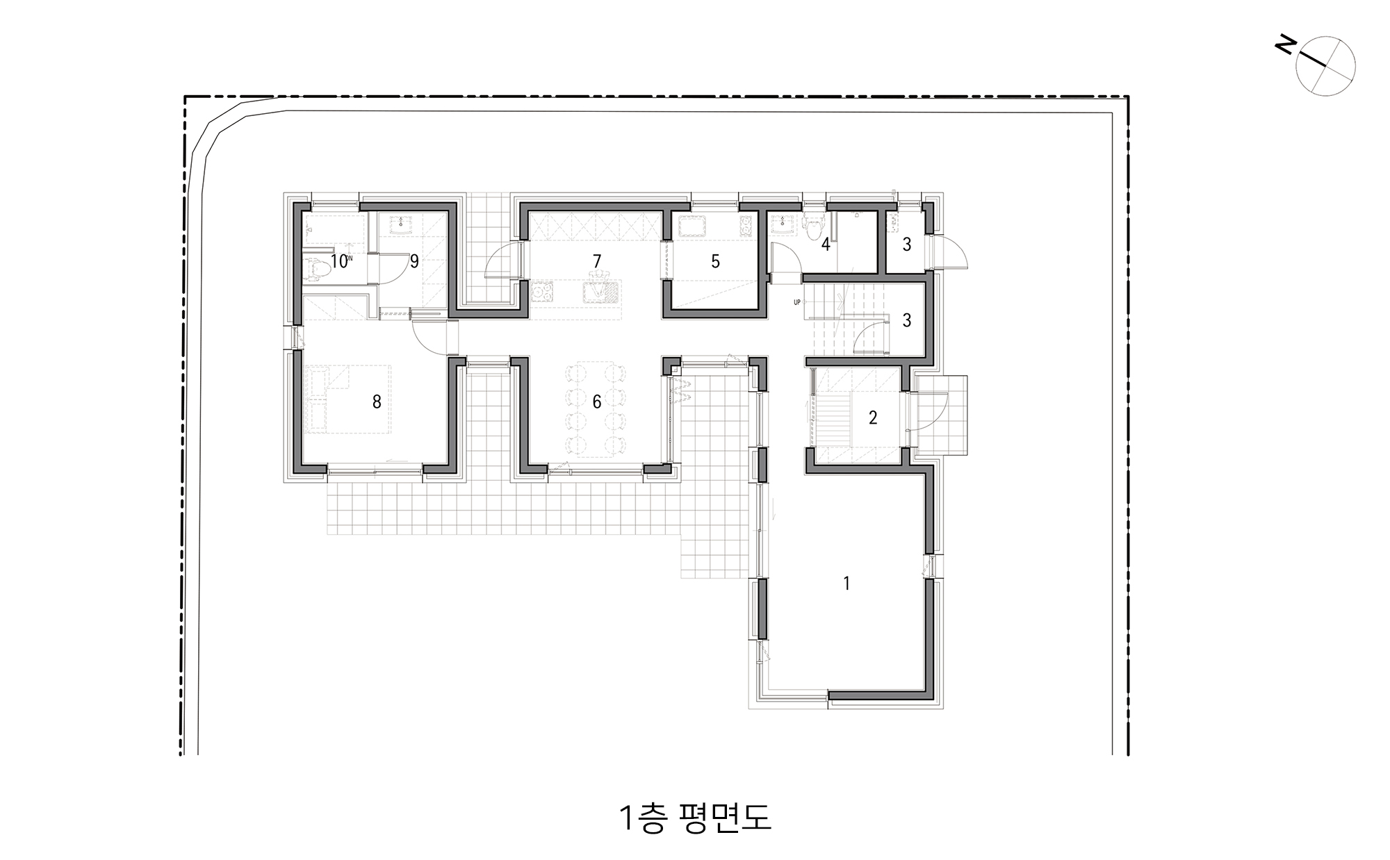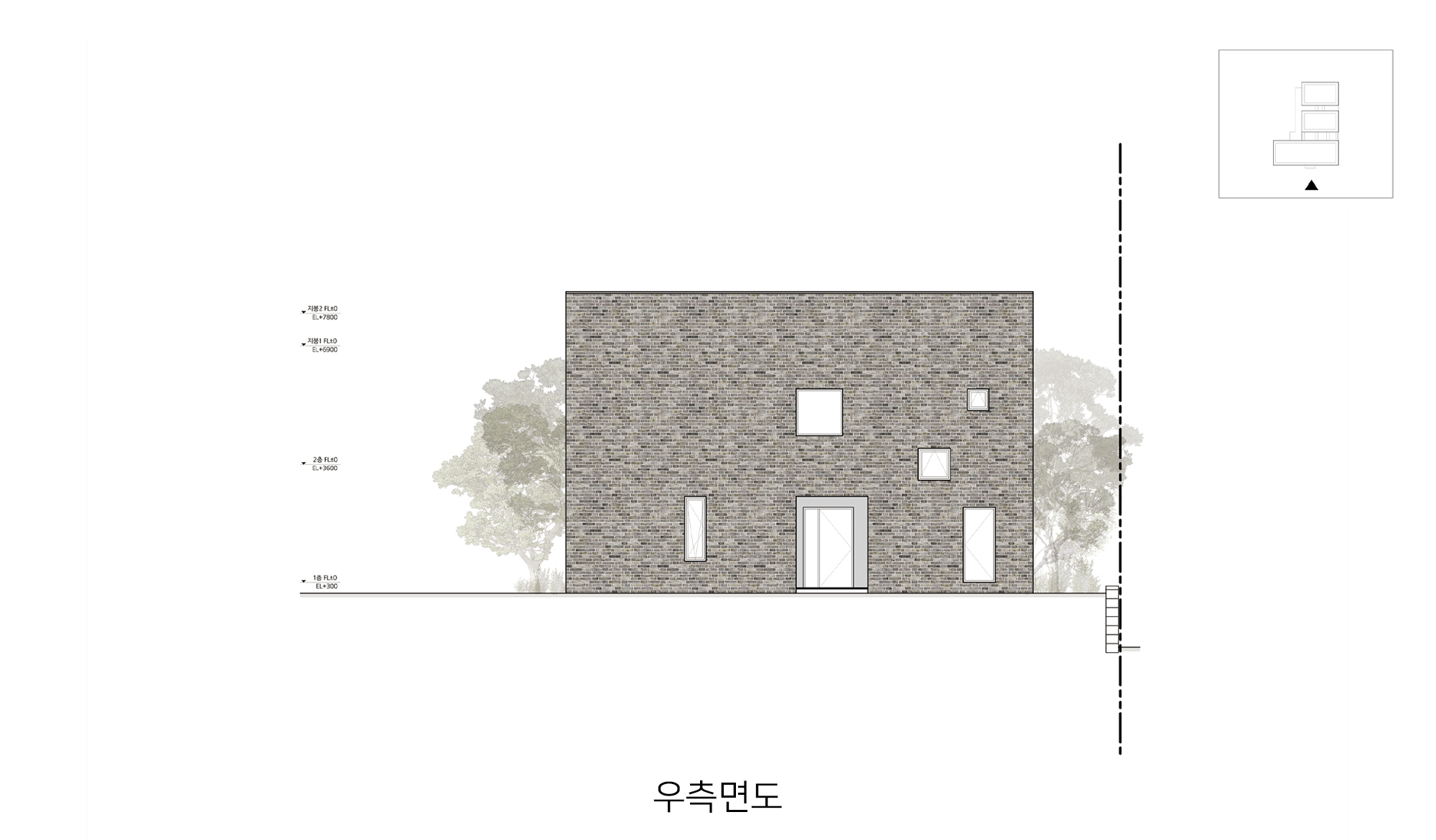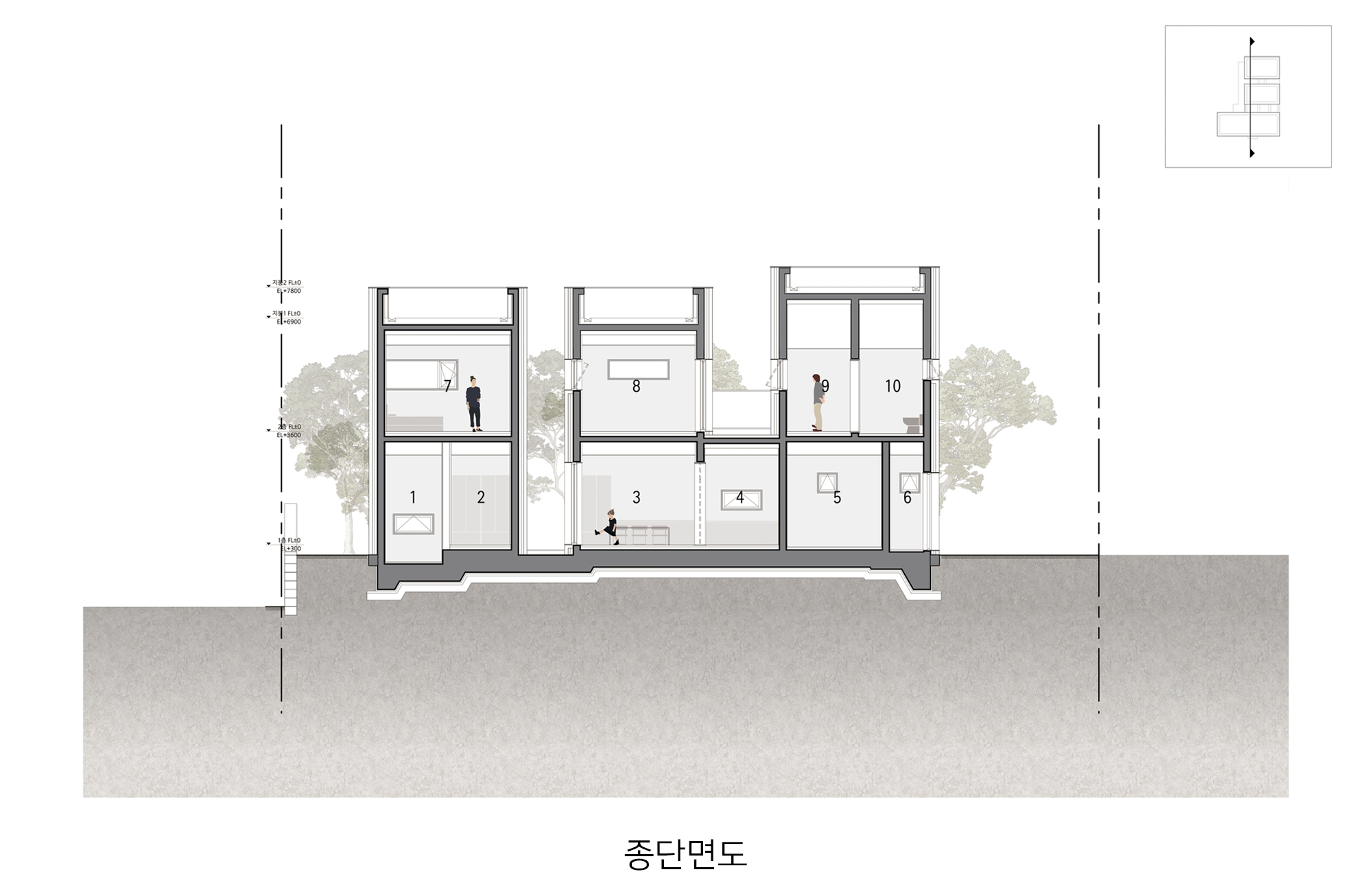 계획은 공간 이용자를 건축주 부부와 손님으로 구분하는 데 중점을 두었다. 외부는 손님의 주차 영역을 옹벽 아래에, 건축주의 주차를 건물 옆에 계획하여 불필요한 동선 없이 바로 현관 출입이 가능하게 해 편의성을 확보하였다. 내부 또한 현관에서 가장 가까운 곳에 손님과 함께하는 공간을, 가장 안쪽에 사적인 침실 영역을 두어 의도적으로 공간 사이의 위계를 조성했다.