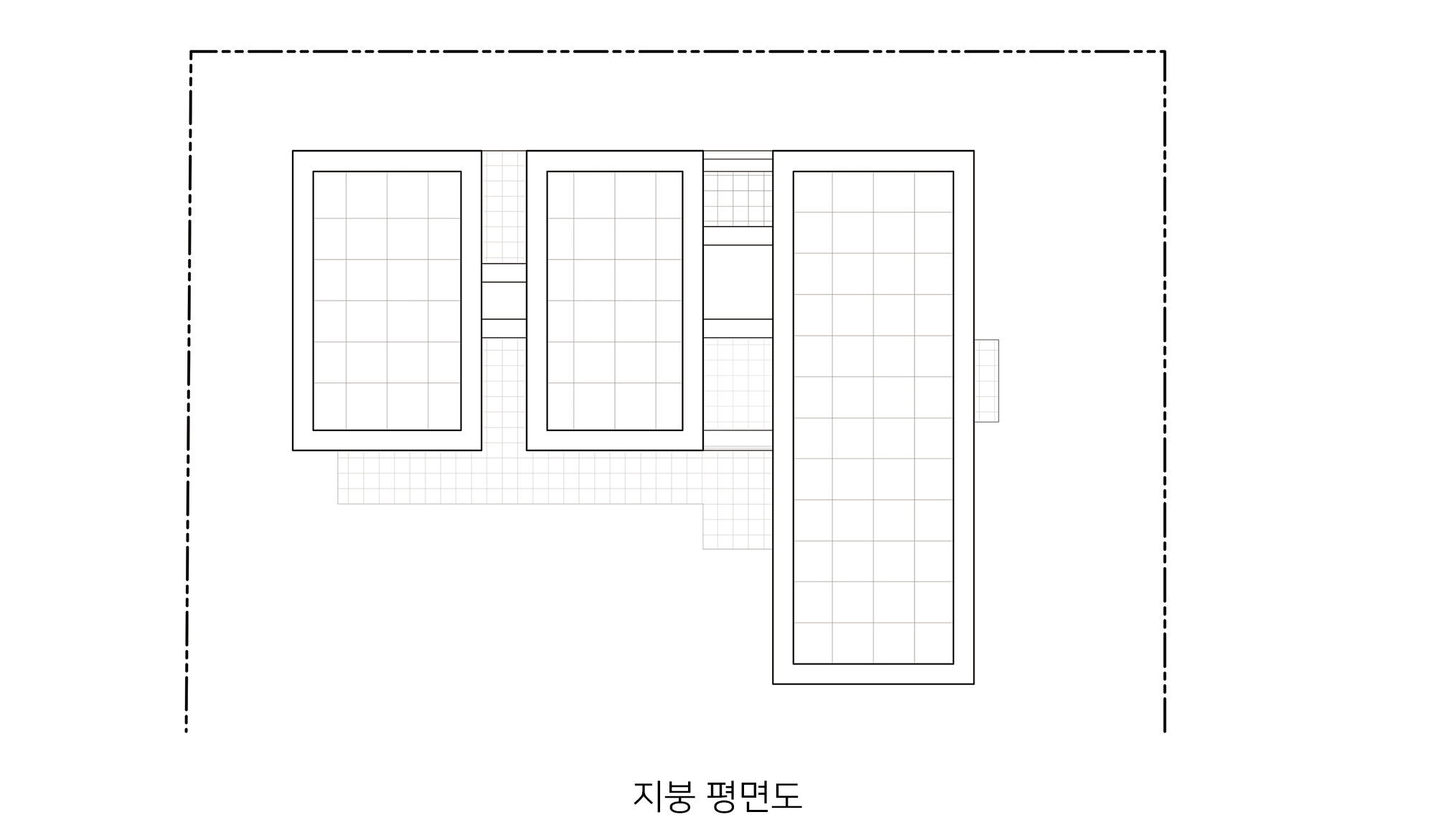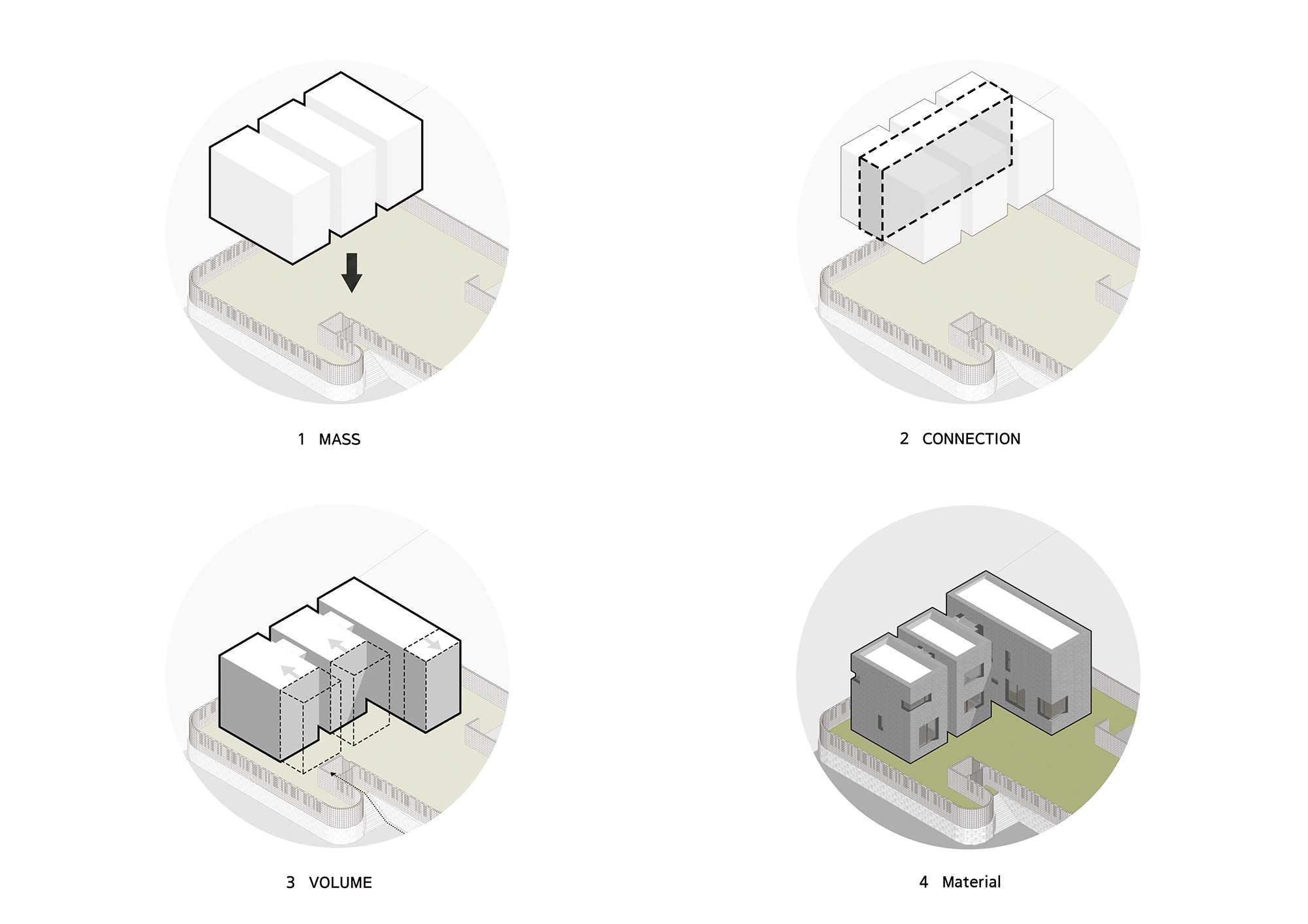 건물은 크게 3개의 매스로 나뉜다. 3개의 매스는 공간의 성격에 따라 가장 동적인 영역에서 가장 정적인 영역 순으로 평행하게 배치하였고, 각 매스 안에서는 공간이 수직적으로 나뉘지만 유사한 성격의 공간을 매치시켜 일관성이 유지된다. 전이 공간으로써 매스를 연결하는 짤막한 중간 복도는 곳곳에 둔 창호를 통해 사이사이 재미있는 공간 전환을 일으킨다.