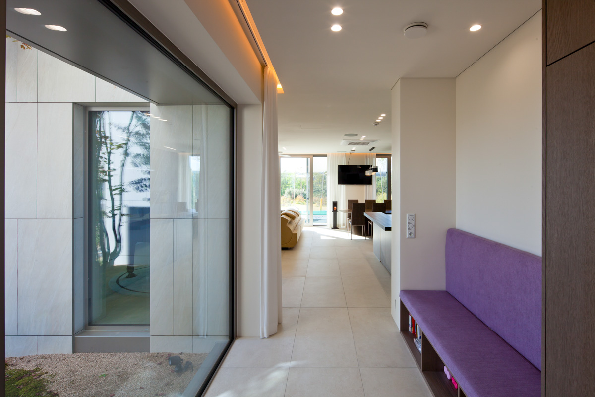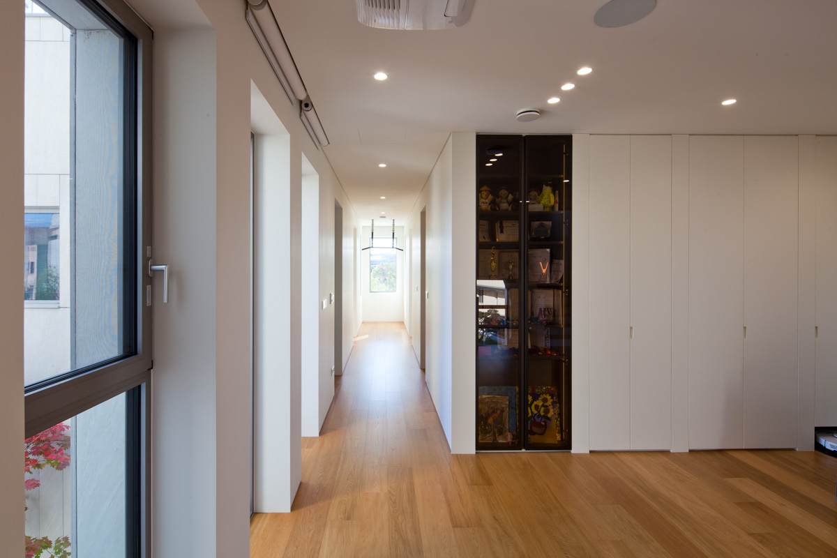 에너지 절감과 중정을 효과적으로 조성하기 위해 남쪽 면을 최대로 확보하였고, 이와 동시에 내부 실과 공용공간이 외부에 직접 노출되지 않도록 계획했다. 복도 공간은 직접 노출되지 않고, 주택 내에서 중정의 역할을 할 수 있도록 높은 조경과 가족의 추억이 담긴 오브제를 배치하여 단순한 정원이 아닌 가족의 공간이 되도록 구성했다. 결과적으로 이 공간은 적절한 채광과 차폐 효과를 동시에 갖춘 하나의 켜가 되었다.