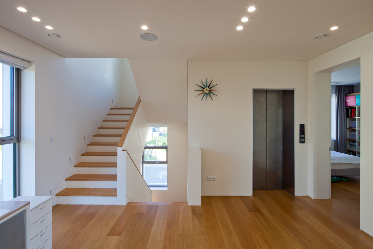 건물의 입면은 외벽과 창호 면적을 늘려 남향의 채광을 확보하였고, 인접 대지와의 프라이버시를 고려하여 루버 및 타공 패널, 슬라이딩 벽체 등 다양한 차폐 요소를 접목했다. 또한, 다양한 기술 요소를 반영하기 위한 지열냉난방 배관, 방송설비, 가스 배관, 빗물 저류 공간 등의 설비 공간과 주택 공간을 효율적으로 배치하고자 평면과 입면에 대해 고민하며, 덕트 공간과 점검 공간을 최적화했다.