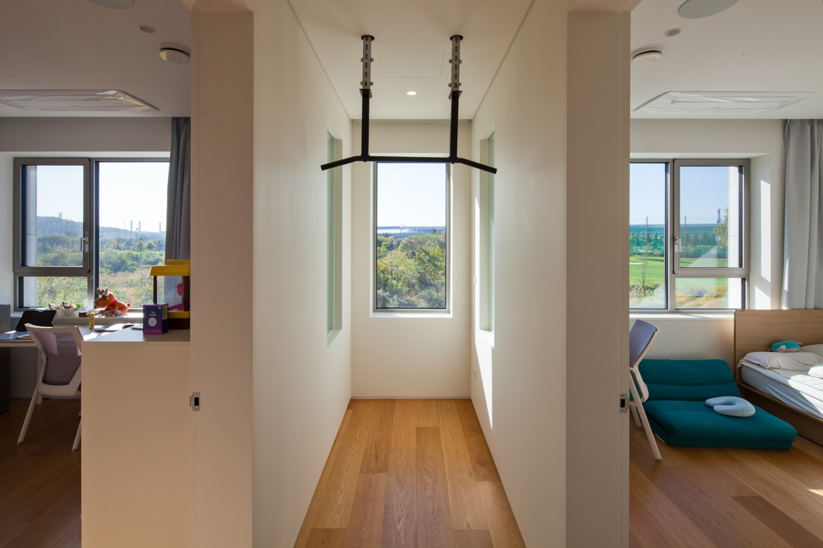 자녀 방은 동향 또는 서향으로 배치하였고, 아이들이 성장하면서 공간 활용이 달라질 것을 고려하여 맞붙은 두 방을 추후 하나의 큰 공간으로 사용할 수 있도록 해체 가능한 건식 벽체로 계획했다.