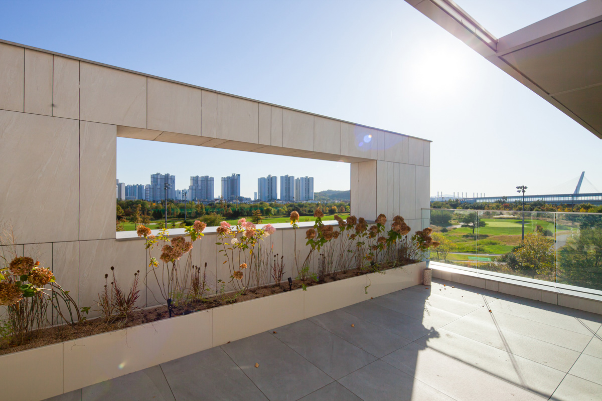 부부를 위한 3층 마스터룸의 테라스는 남향으로 조성하고, 프라이버시 보호를 위해 벽체를 올린 후, 액자 형태의 프레임을 두어 프라이버시와 개방감을 모두 확보하였다.
