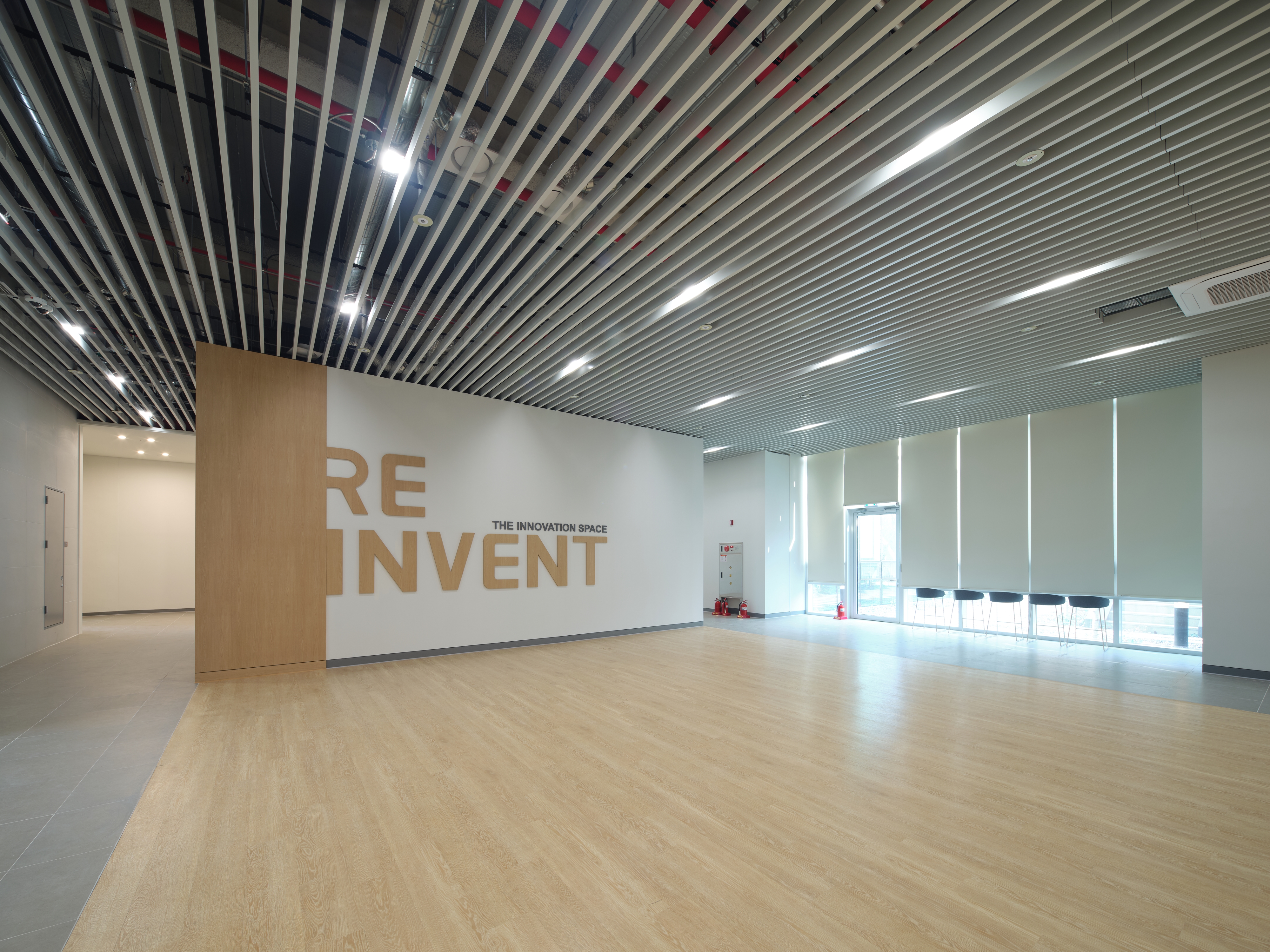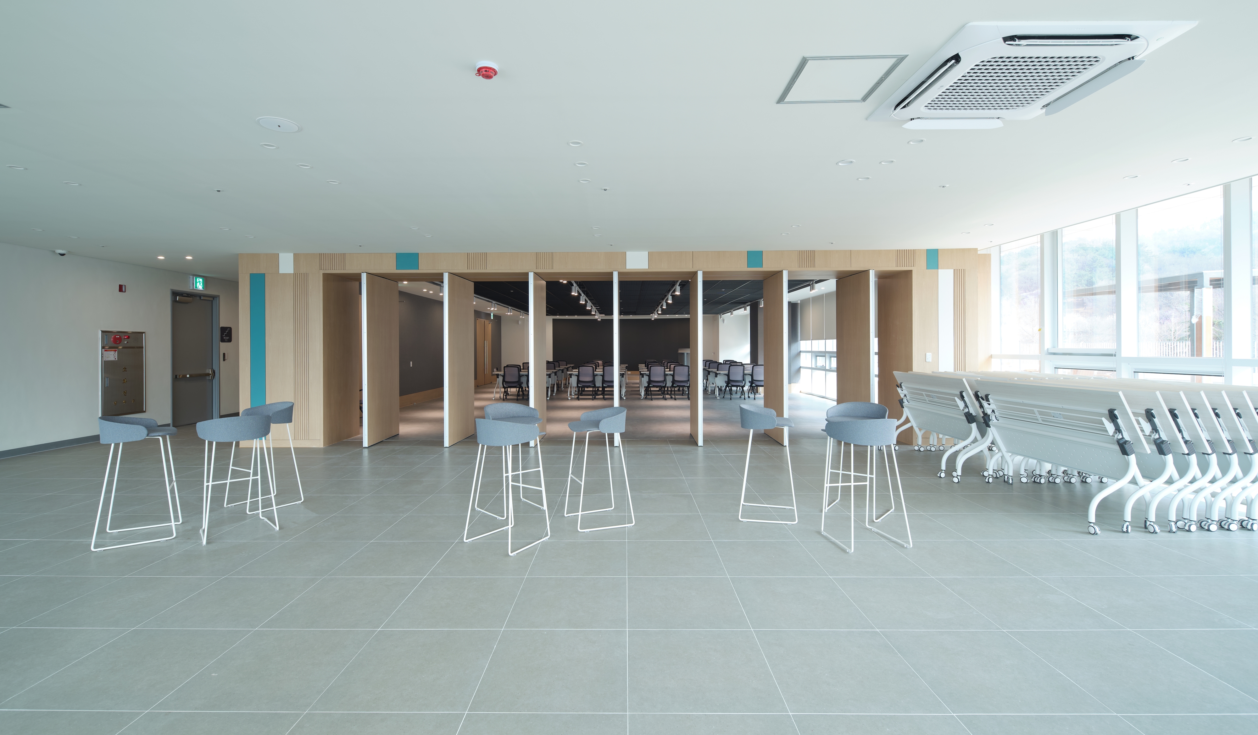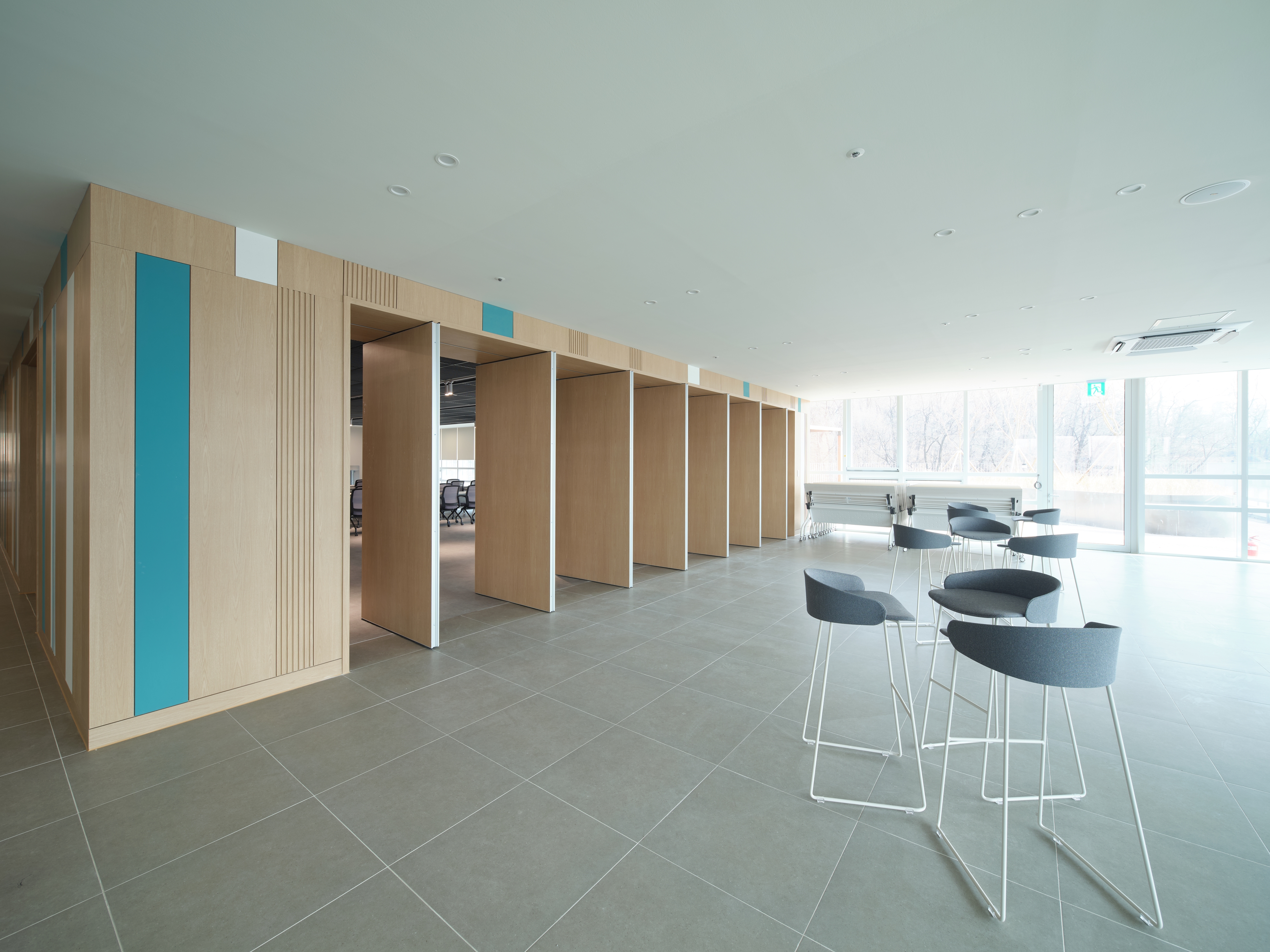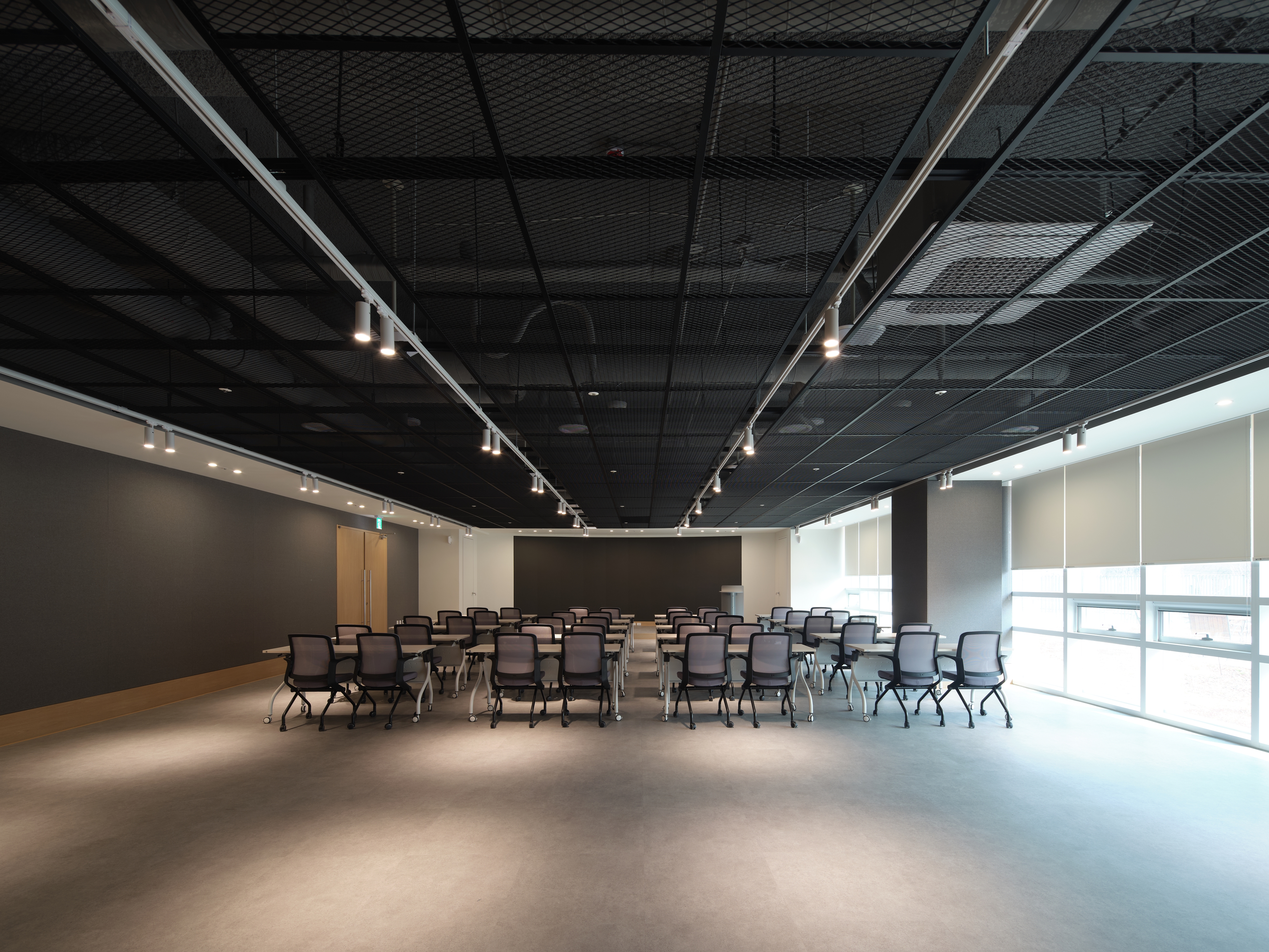 지상 3층 오픈라운지 2 경우, 회전 파티션을 계획했다. 따라서 3층의 대회의실과 자연스럽게 연계되는 디자인을 구체화하였다.
