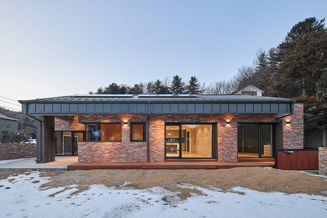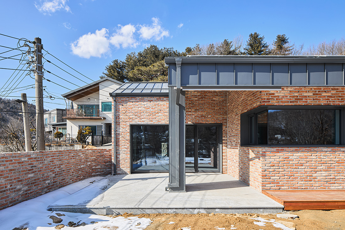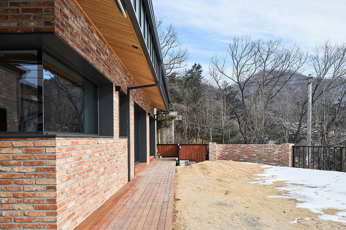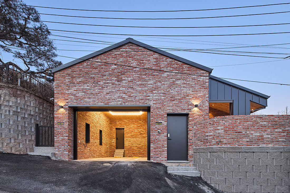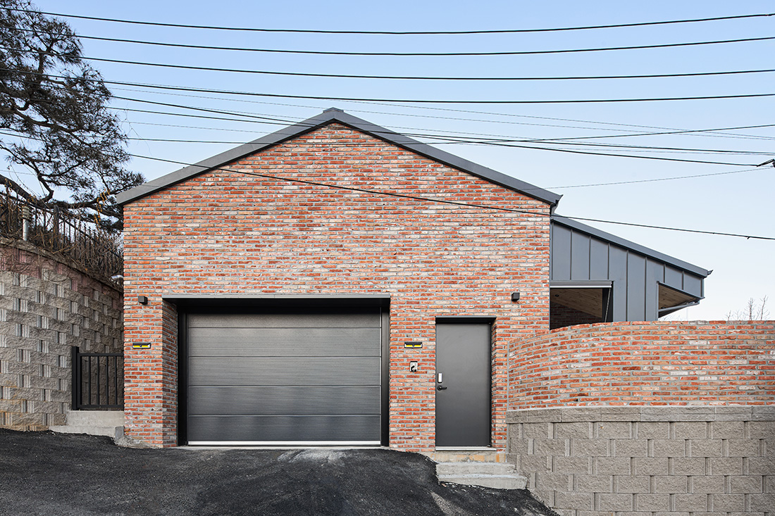 외관은 주변 마을과 자연스럽게 어울리도록 붉은 계열의 벽돌을 선택했다. 이 벽돌은 시간과 계절에 따라 색이 변하며, 해 질 녘에는 한층 깊은 톤으로 물든다. 차고 벽면까지 같은 재료를 이어붙여 실내와 외부가 단절되지 않고 흐르는 듯한 감각을 주었다. 집의 덩어리는 기능별로 나누고, 지붕선으로 하나의 형태로 묶어냈다. 차고에서 현관, 창고, 실내로 이어지는 흐름은 단순하지만 명확하고, 마치 길을 걷듯 자연스럽다.