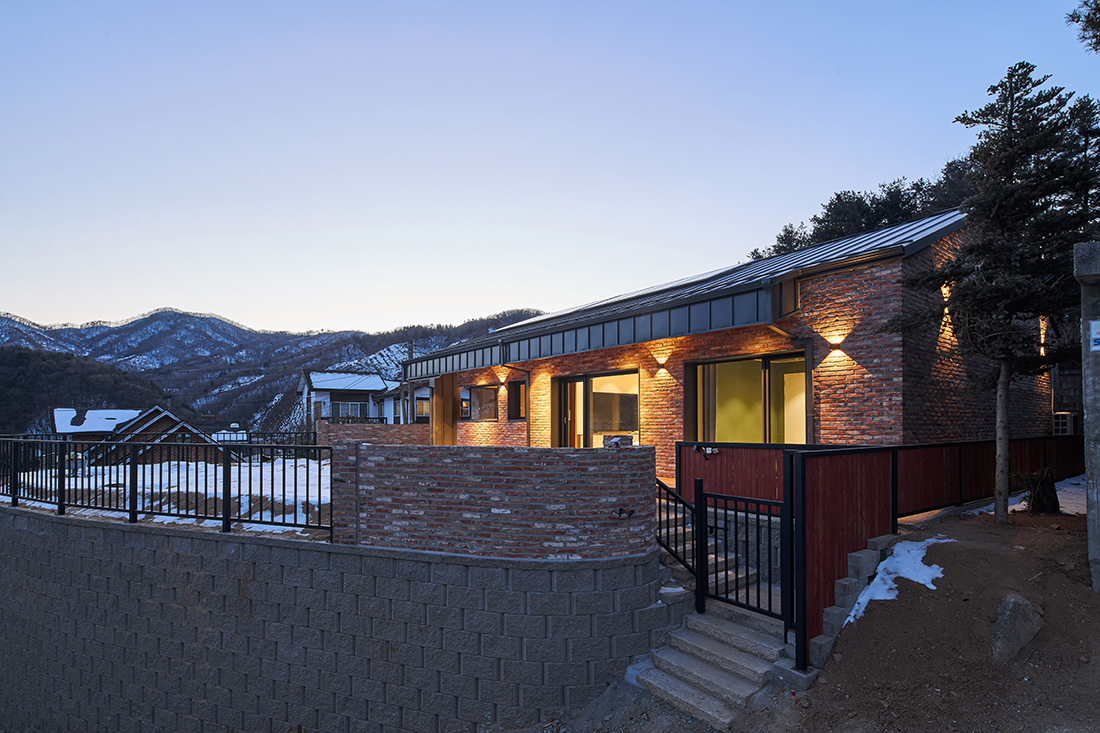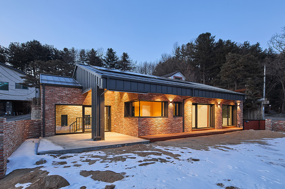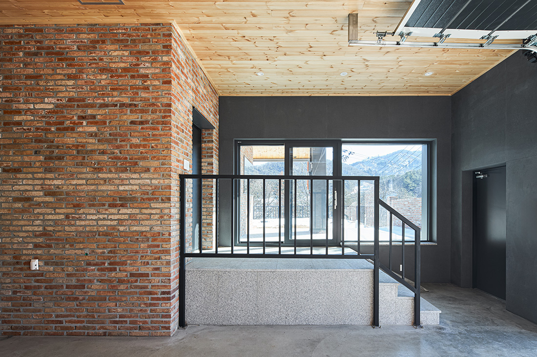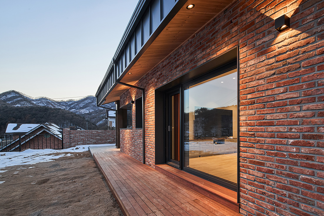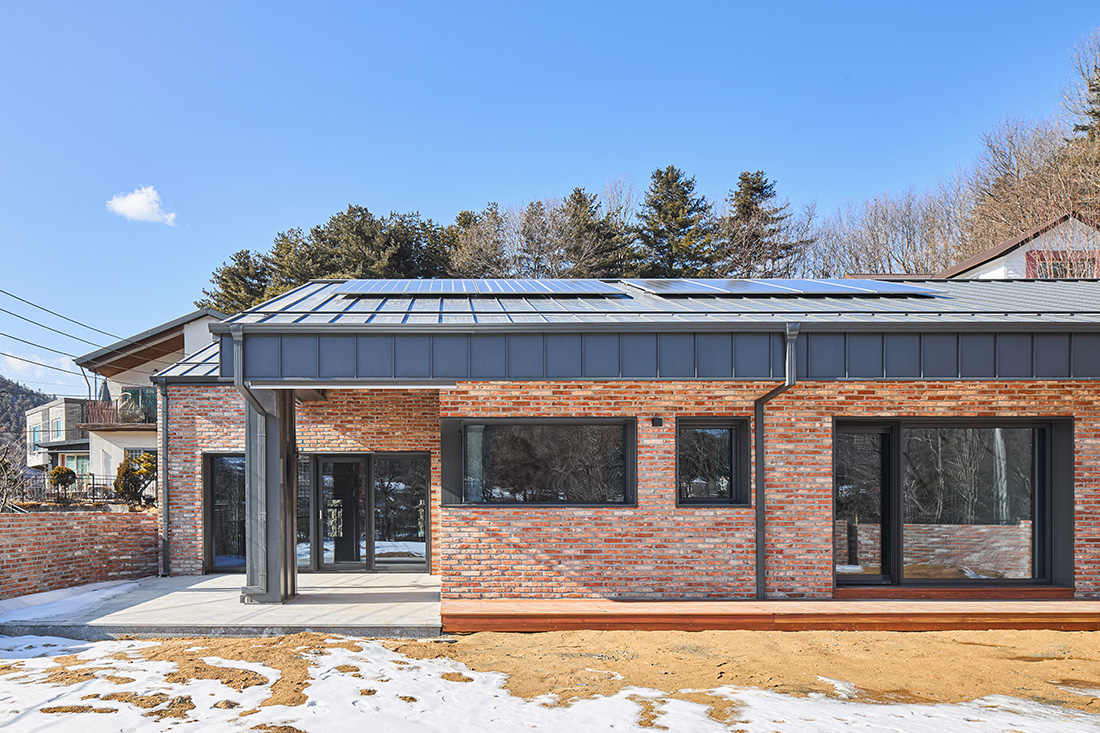 외관은 주변 마을과 자연스럽게 어울리도록 붉은 계열의 벽돌을 선택했다. 이 벽돌은 시간과 계절에 따라 색이 변하며, 해 질 녘에는 한층 깊은 톤으로 물든다. 차고 벽면까지 같은 재료를 이어붙여 실내와 외부가 단절되지 않고 흐르는 듯한 감각을 주었다. 집의 덩어리는 기능별로 나누고, 지붕선으로 하나의 형태로 묶어냈다. 차고에서 현관, 창고, 실내로 이어지는 흐름은 단순하지만 명확하고, 마치 길을 걷듯 자연스럽다.