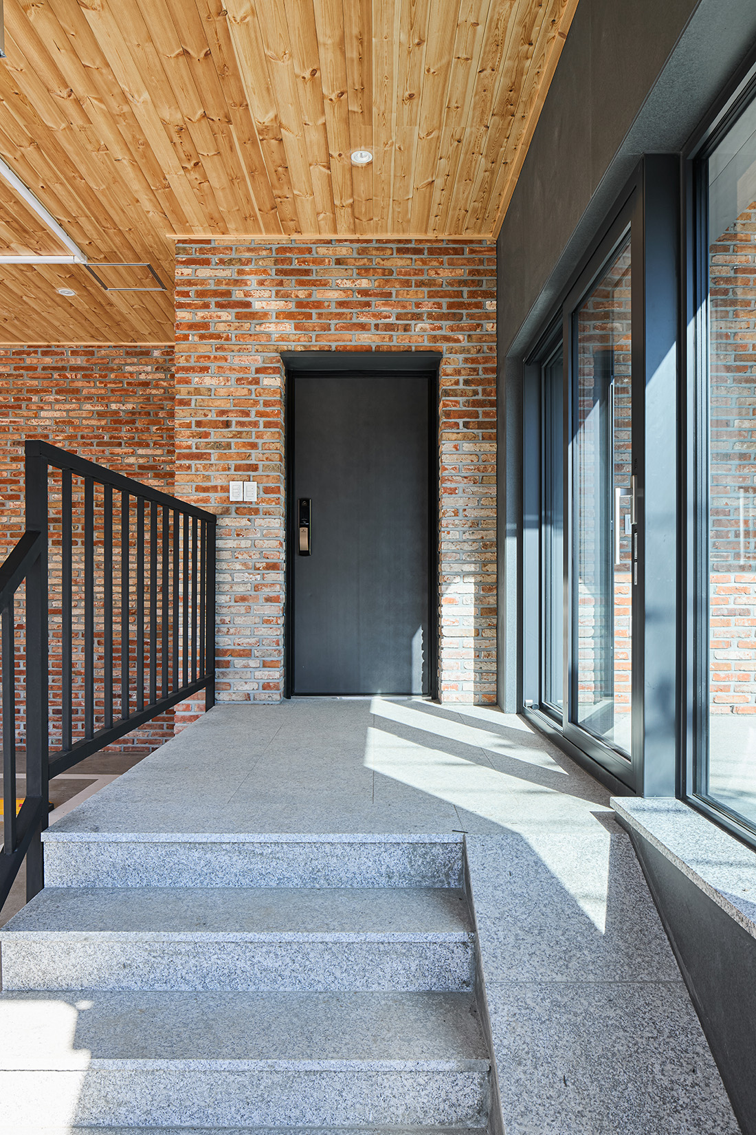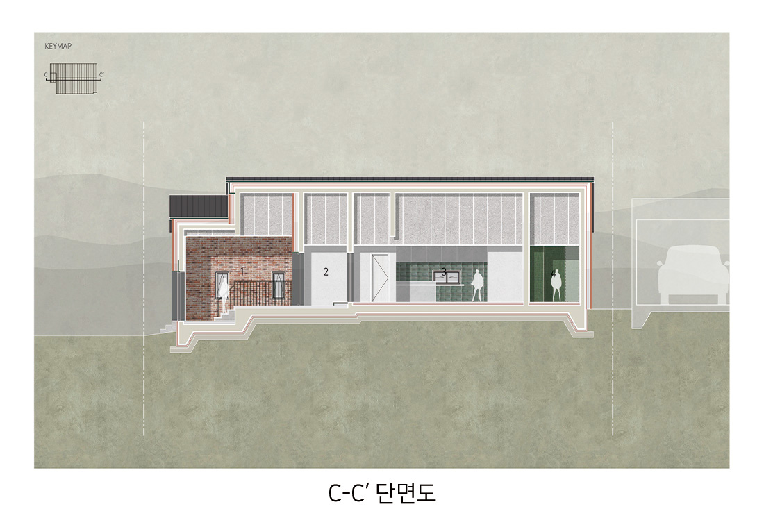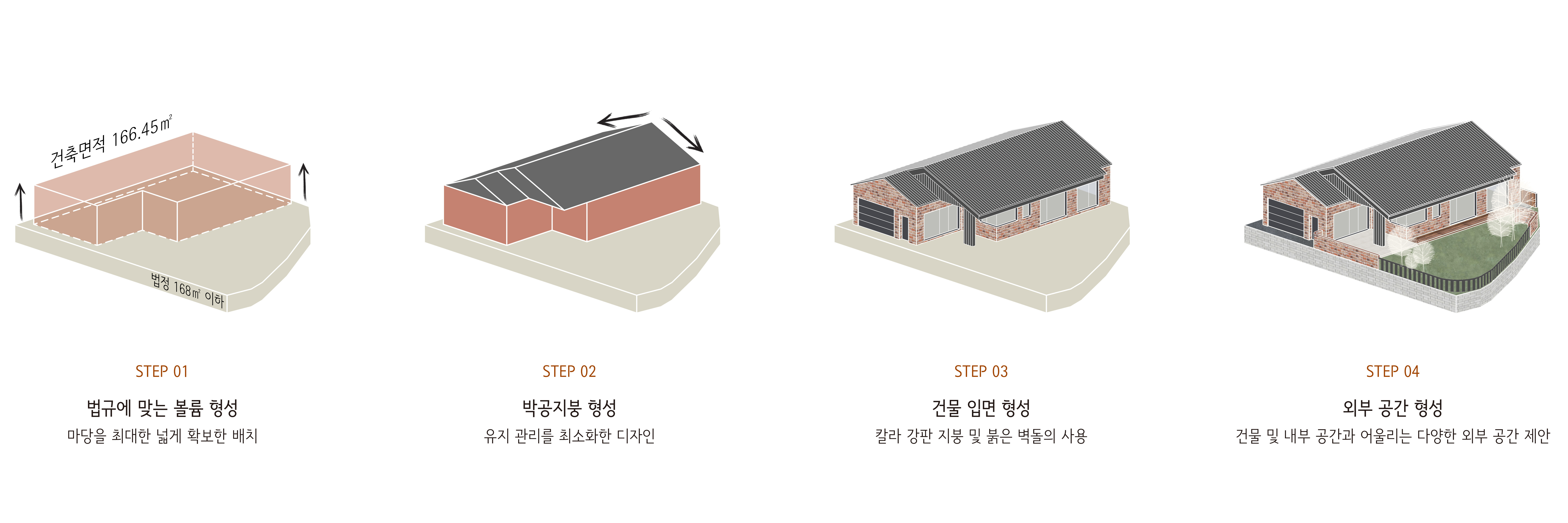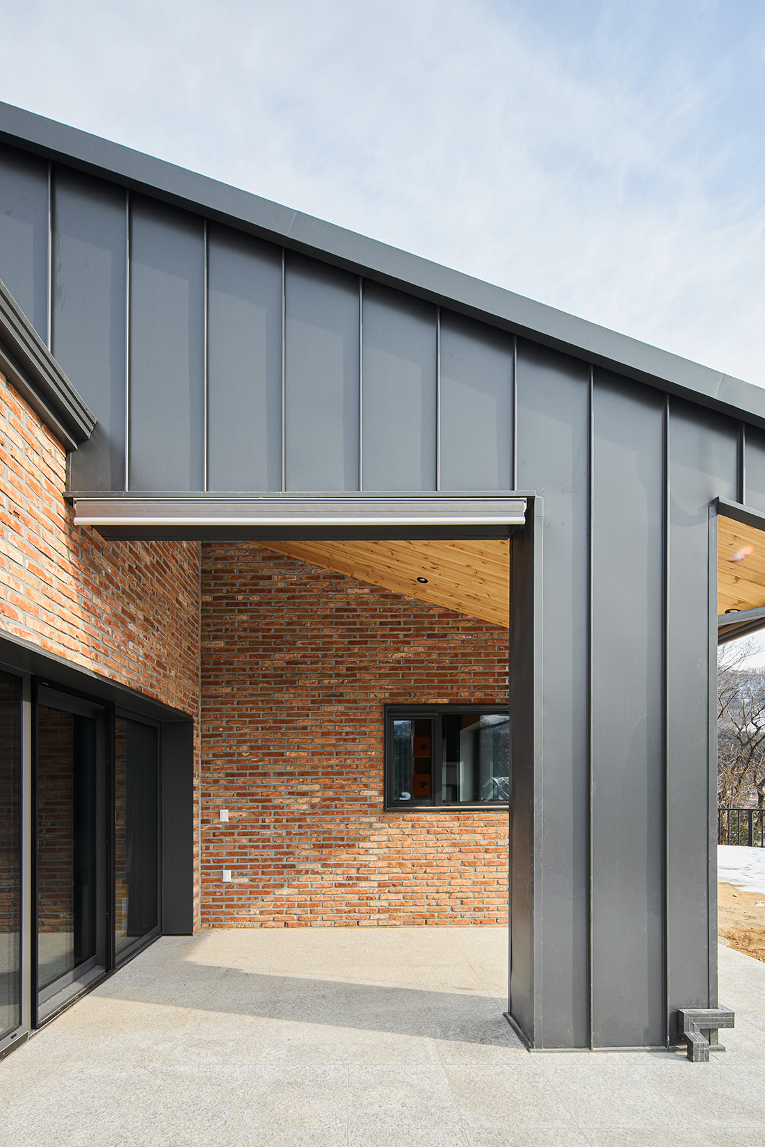 외관은 주변 마을과 자연스럽게 어울리도록 붉은 계열의 벽돌을 선택했다. 이 벽돌은 시간과 계절에 따라 색이 변하며, 해 질 녘에는 한층 깊은 톤으로 물든다. 차고 벽면까지 같은 재료를 이어붙여 실내와 외부가 단절되지 않고 흐르는 듯한 감각을 주었다. 집의 덩어리는 기능별로 나누고, 지붕선으로 하나의 형태로 묶어냈다. 차고에서 현관, 창고, 실내로 이어지는 흐름은 단순하지만 명확하고, 마치 길을 걷듯 자연스럽다.