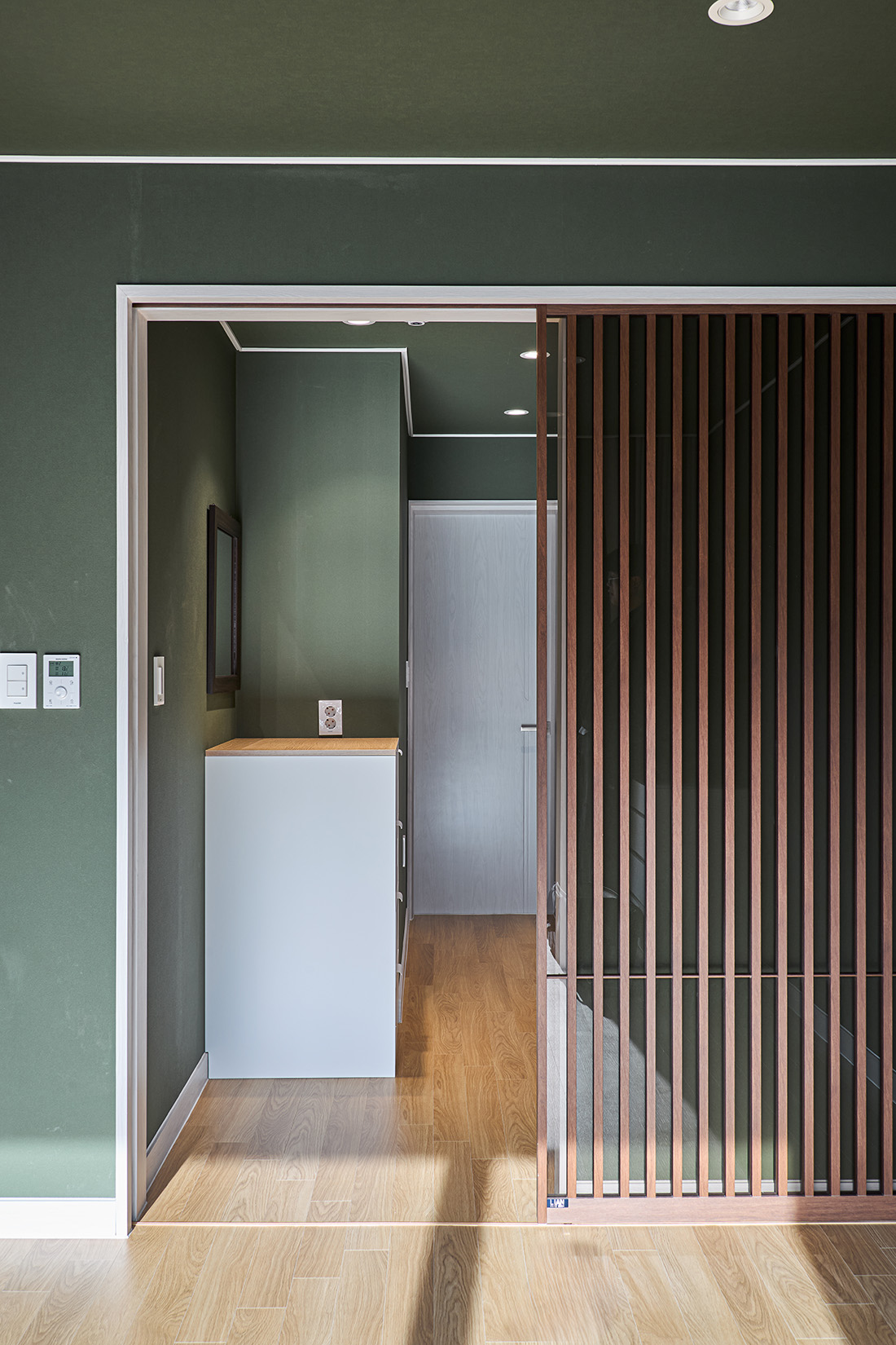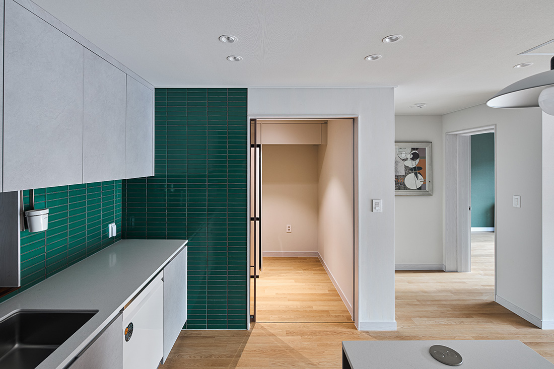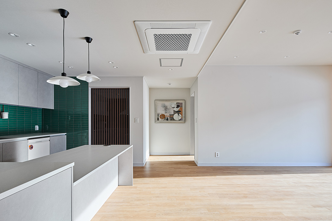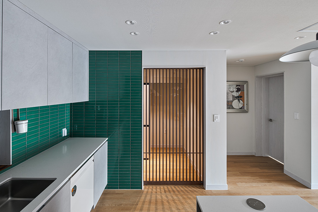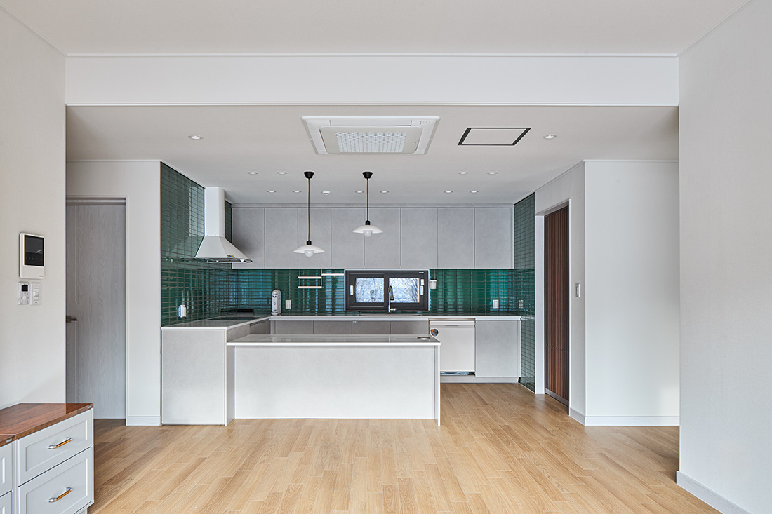 서재를 지나 거실로 들어서면 먼저 마당과 거실이 맞닿은 풍경이 눈에 들어온다. 거실의 대형 창은 사계절을 가리지 않고 자연을 끌어들이며, 봄에는 햇살이 바닥에 부드럽게 번지고, 겨울에는 눈발이 고요하게 내려앉는다. 부엌은 초록색 타일과 간살 슬라이딩 도어로 세련된 인상을 남기고, 흰색 가구와 어우러져 차분함 속에 포인트를 준다. 다용도실과 맞닿아 있어 요리와 집안일의 동선이 짧고 간결하다.