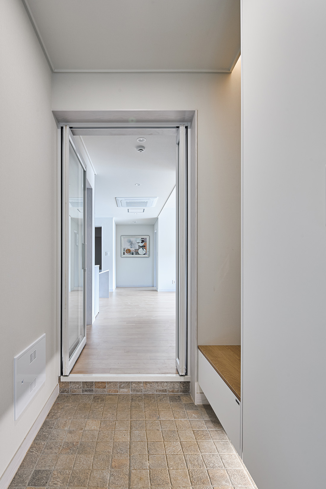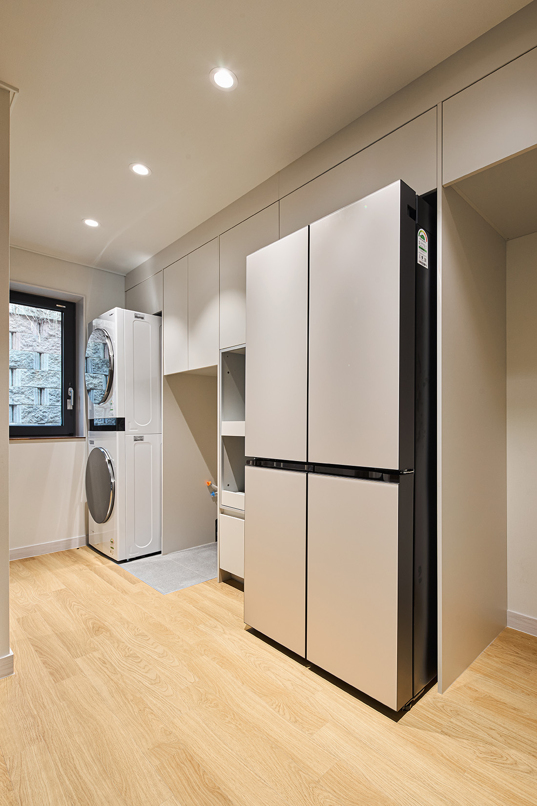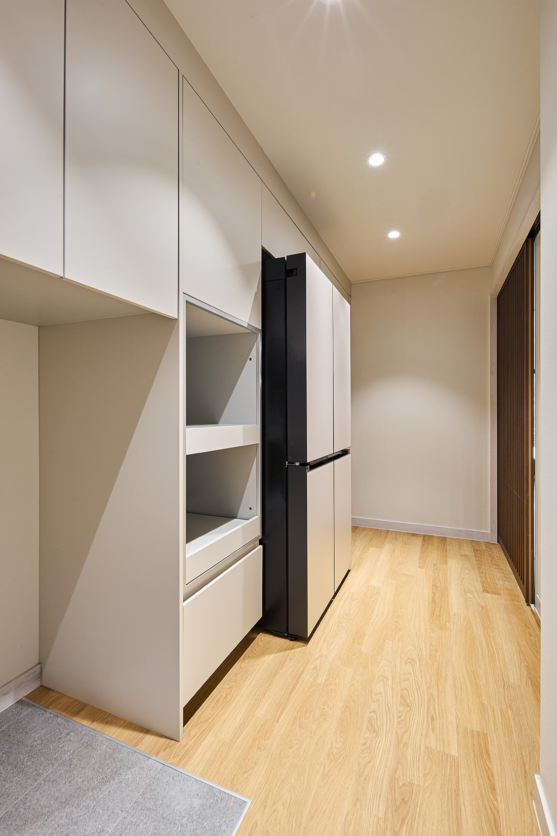 서재를 지나 거실로 들어서면 먼저 마당과 거실이 맞닿은 풍경이 눈에 들어온다. 거실의 대형 창은 사계절을 가리지 않고 자연을 끌어들이며, 봄에는 햇살이 바닥에 부드럽게 번지고, 겨울에는 눈발이 고요하게 내려앉는다. 부엌은 초록색 타일과 간살 슬라이딩 도어로 세련된 인상을 남기고, 흰색 가구와 어우러져 차분함 속에 포인트를 준다. 다용도실과 맞닿아 있어 요리와 집안일의 동선이 짧고 간결하다.