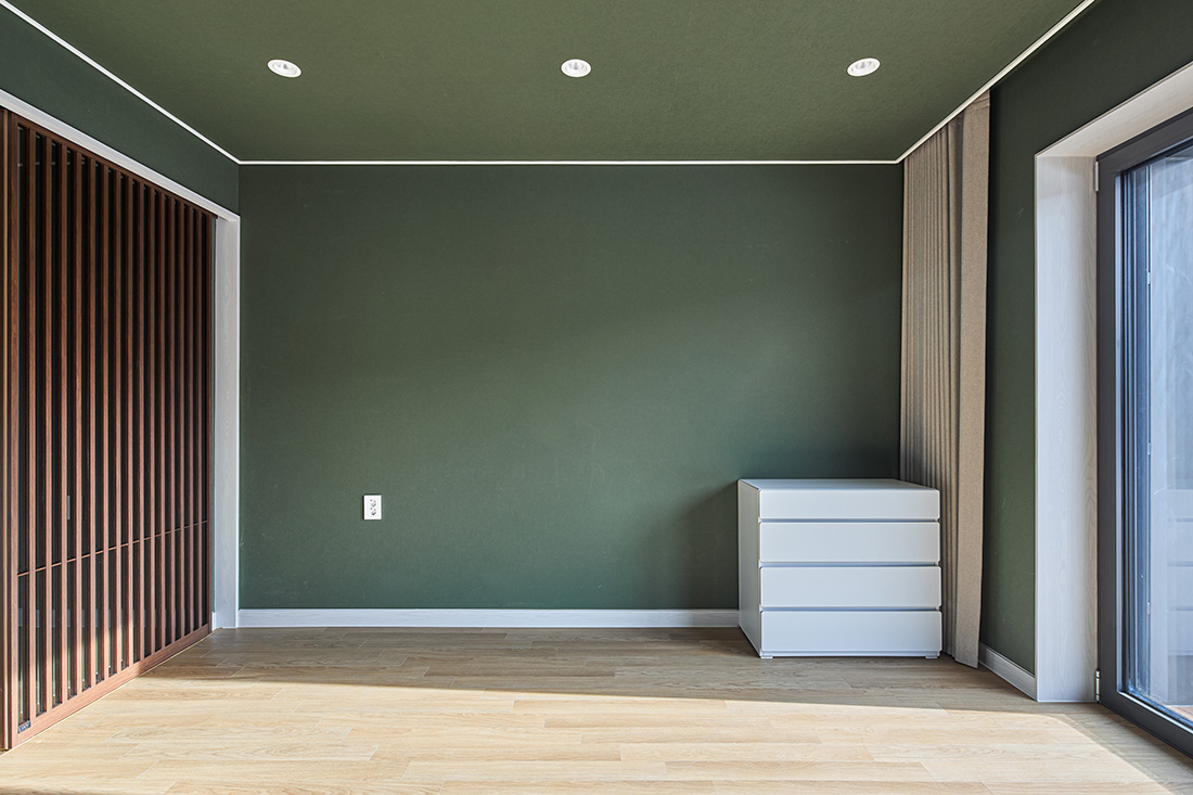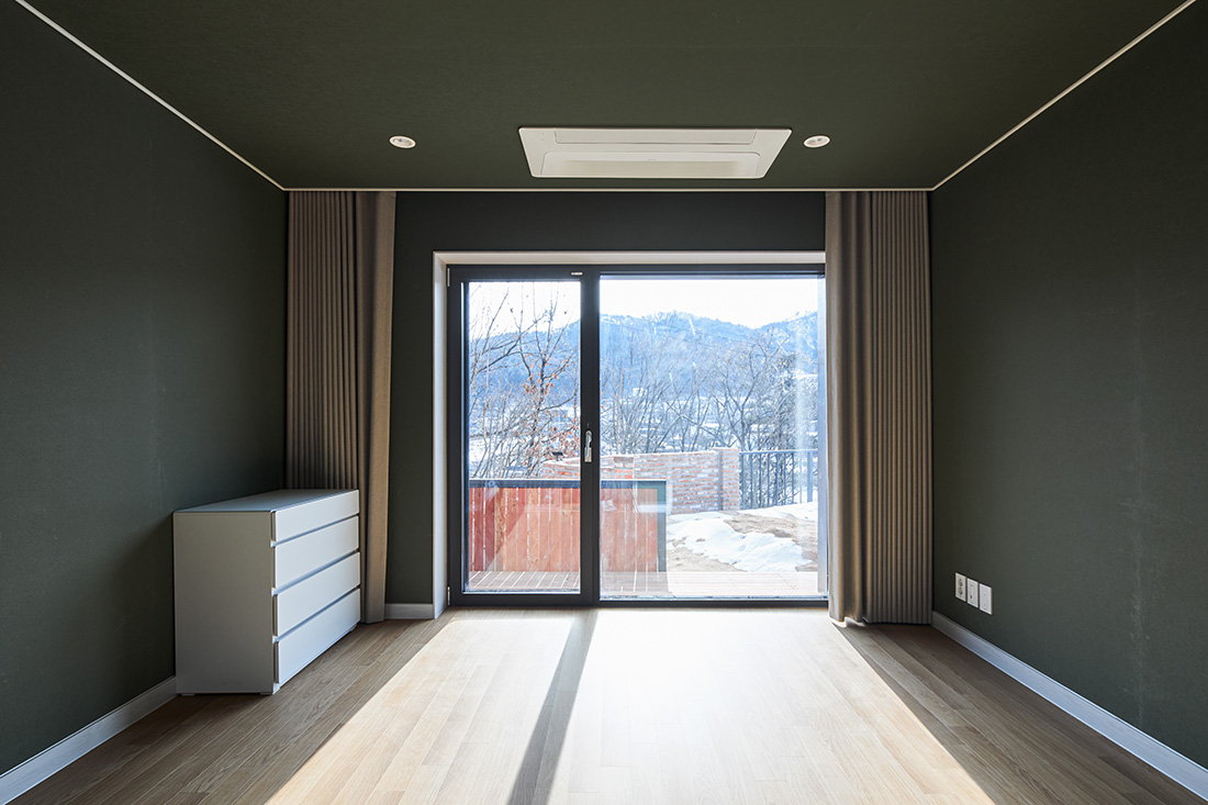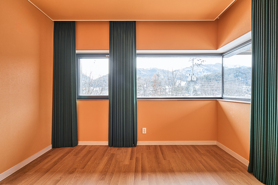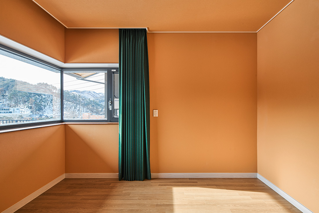 안방은 짙은 녹색 벽으로 감싸져 있어 들어서는 순간 마음이 가라앉는다. 바깥과 맞닿은 쪽에는 목재 펜스를 두어 시선을 차단하고, 드레스룸과 자연스럽게 연결해 사적인 영역이 이어진다. 2층에 해당하는 서재는 또 다른 성격을 지닌다. 오렌지색 벽과 천장은 따뜻한 긴장감을 주고, 짙은 초록 커튼은 강한 색 대비를 이루며 빛을 제어한다. 코너창에 서면 두 방향으로 펼쳐진 풍경이 한눈에 들어오고, 앉아서 책을 읽을 때는 시간의 흐름까지 느껴진다.