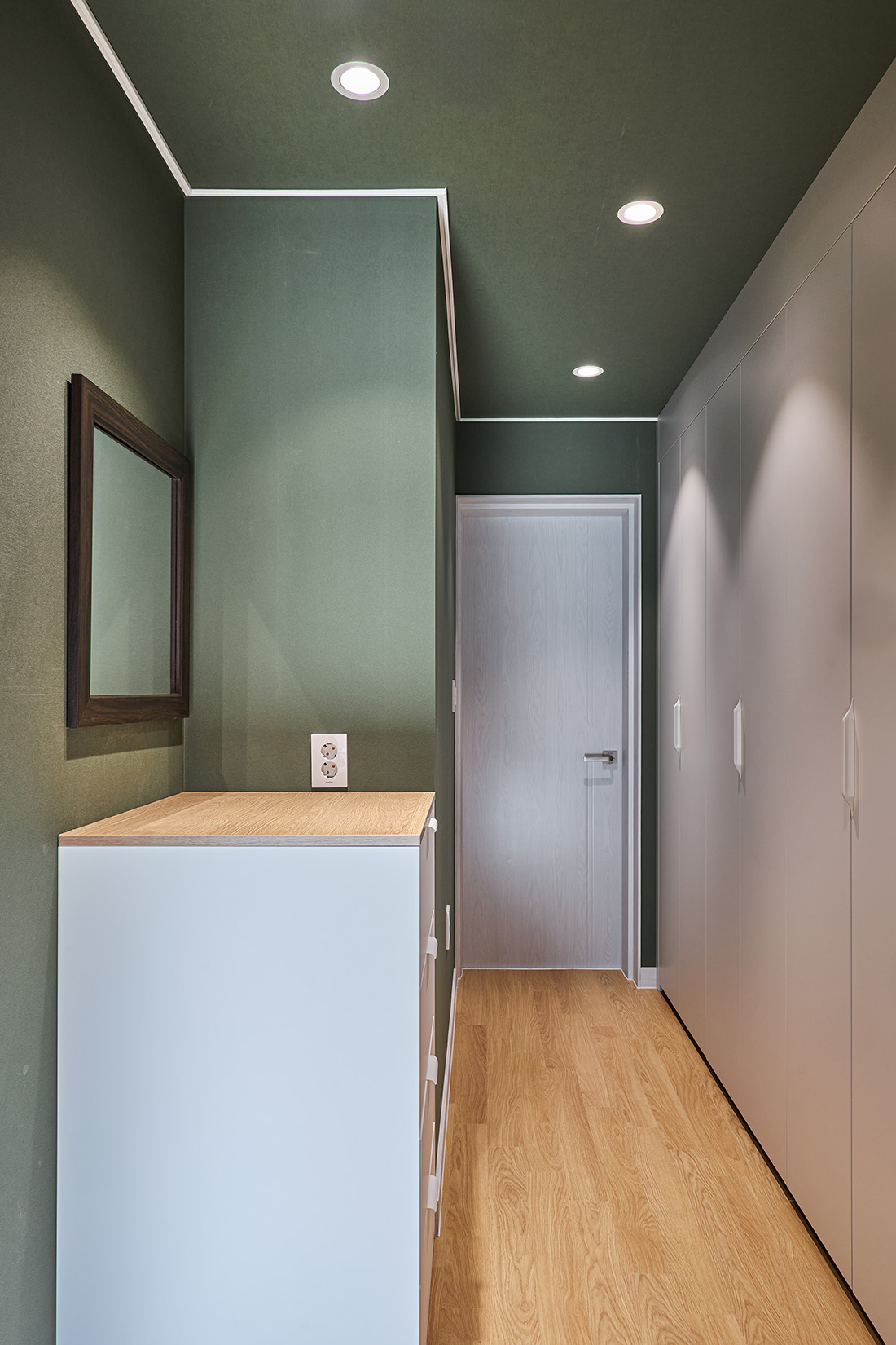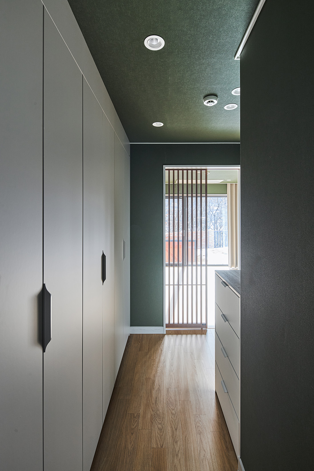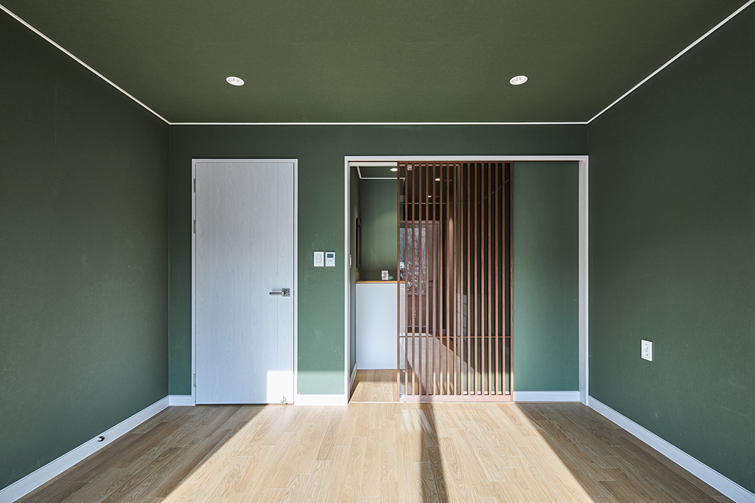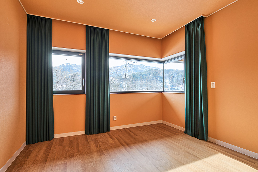 안방은 짙은 녹색 벽으로 감싸져 있어 들어서는 순간 마음이 가라앉는다. 바깥과 맞닿은 쪽에는 목재 펜스를 두어 시선을 차단하고, 드레스룸과 자연스럽게 연결해 사적인 영역이 이어진다. 2층에 해당하는 서재는 또 다른 성격을 지닌다. 오렌지색 벽과 천장은 따뜻한 긴장감을 주고, 짙은 초록 커튼은 강한 색 대비를 이루며 빛을 제어한다. 코너창에 서면 두 방향으로 펼쳐진 풍경이 한눈에 들어오고, 앉아서 책을 읽을 때는 시간의 흐름까지 느껴진다.