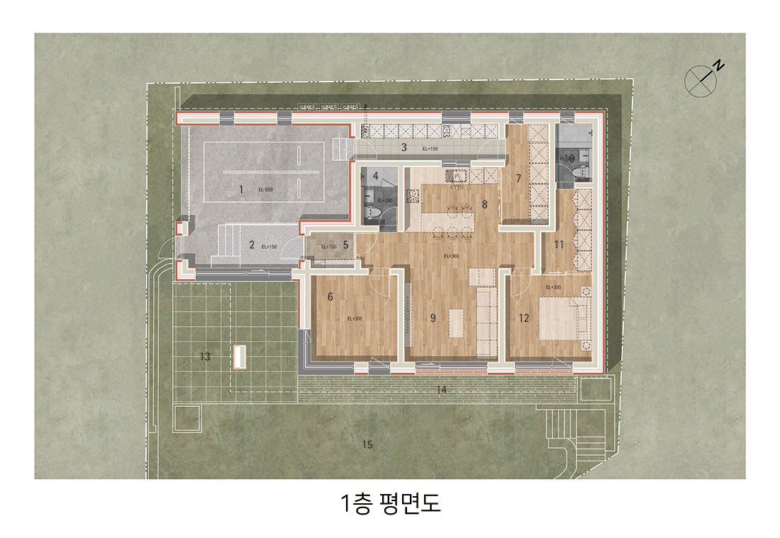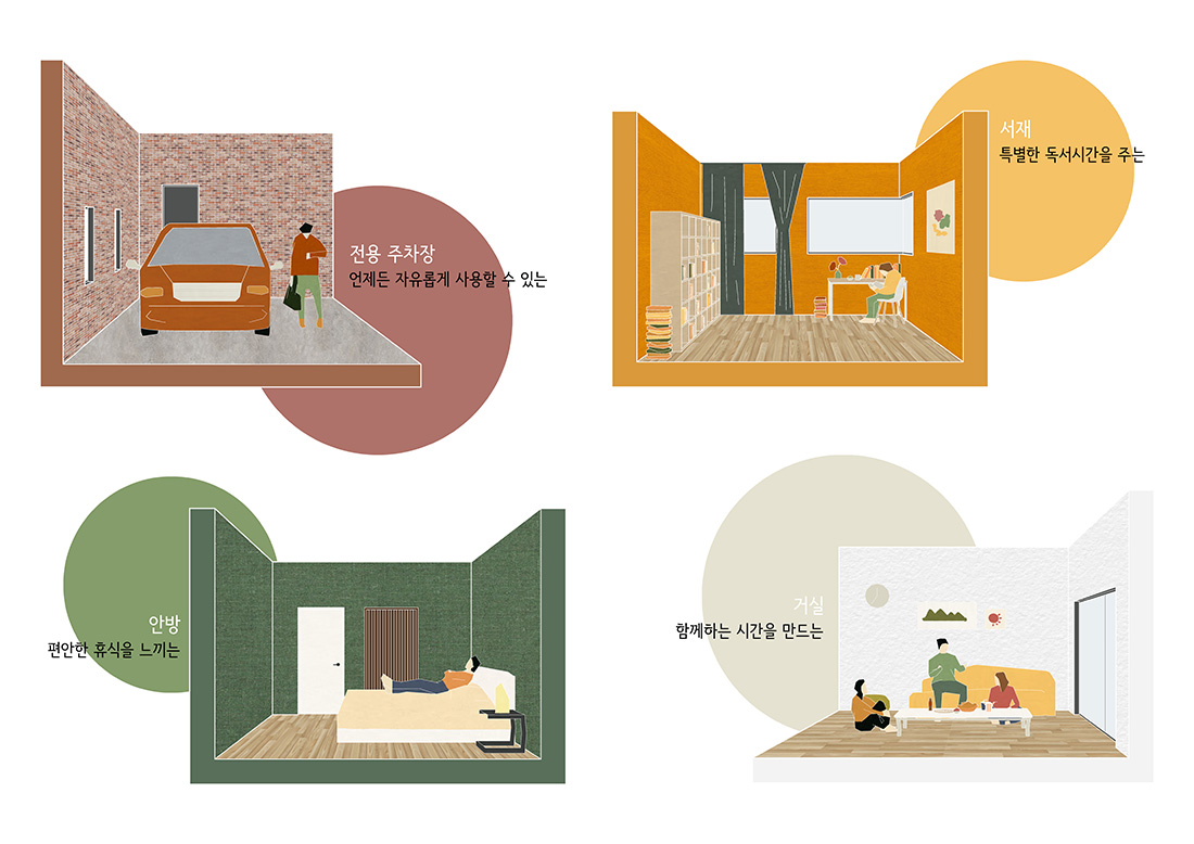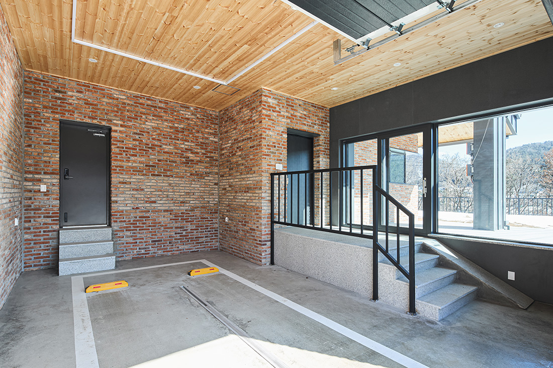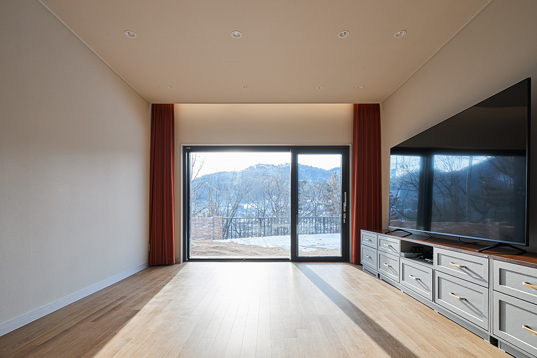 이 집은 단순히 머무는 장소가 아니라, 계절의 변화와 풍경을 온전히 느낄 수 있는 공간이 되어야 했다. 주차장에서 실내로 바로 진입할 수 있는 편리한 구조, 캠핑과 운동 장비를 보관할 수 있는 넉넉한 수납창고, 부엌과 다용도실이 효율적으로 연결된 동선, 내부에서 자연을 바라볼 수 있는 큰 창과 마당, 그리고 공간마다 감성을 불어넣는 색채와 조명이 필요했다.