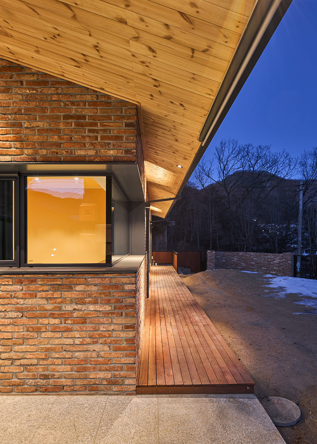 집 안과 밖에는 빛이 섬세하게 배치돼 있다. 지붕 아래 매입등은 은은하게 마당을 비추고, 벽부등은 리듬감 있게 집의 표면을 살린다. 따뜻한 색감의 전구는 밤에도 공간을 부드럽게 감싸며, 멀리서 보면 집이 조용히 숨 쉬는 듯한 인상을 준다.