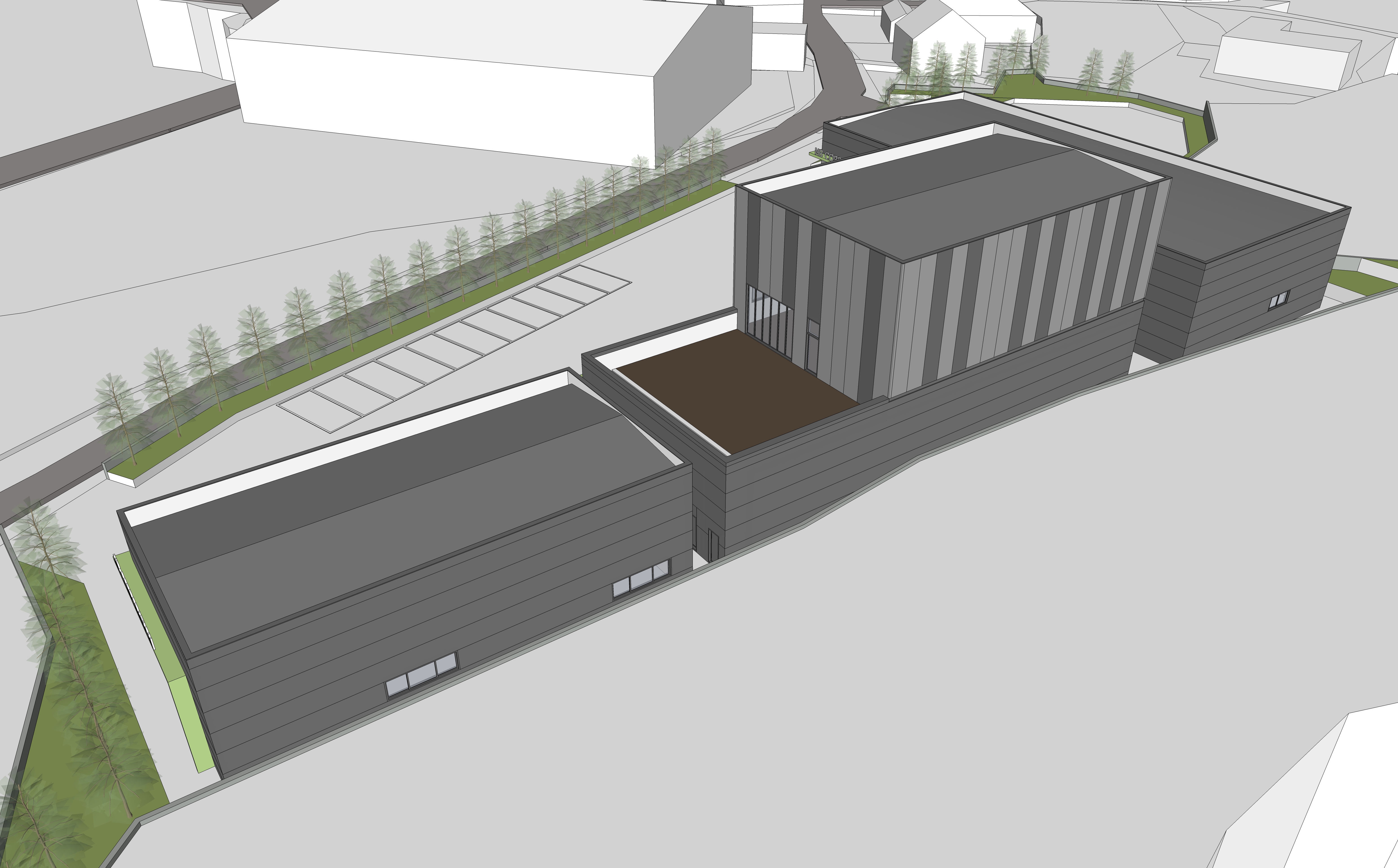 커피공장은 원자재 가공 -> 제조 -> 포장 등이 이루어져 출하되는 시스템에 충실하도록 원자재 보관창고, 제조공장, 출하 전 물품창고 총 3개의 동으로 구성했으며, 제조기계로 인한 높은 층고를 활용해 제조공장 2층에는 사무실 겸 커피 쇼케이스가 가능한 공간을 계획하였다.