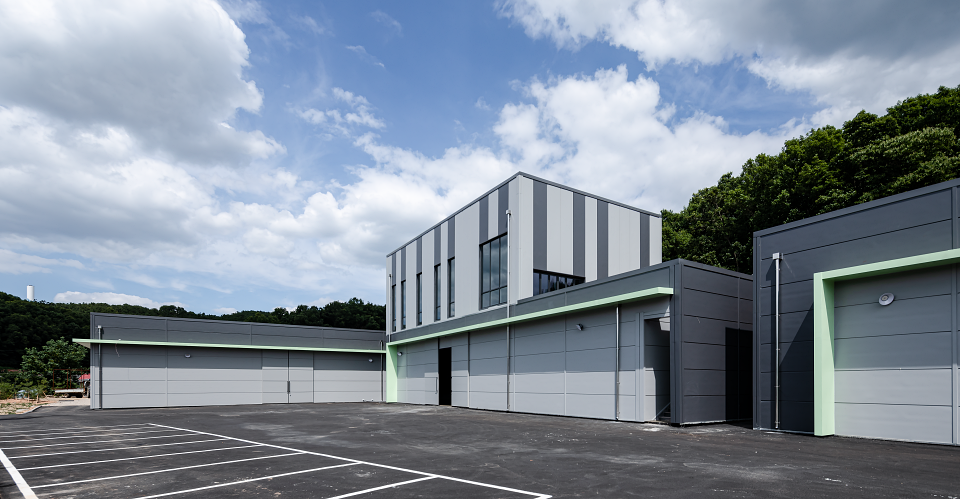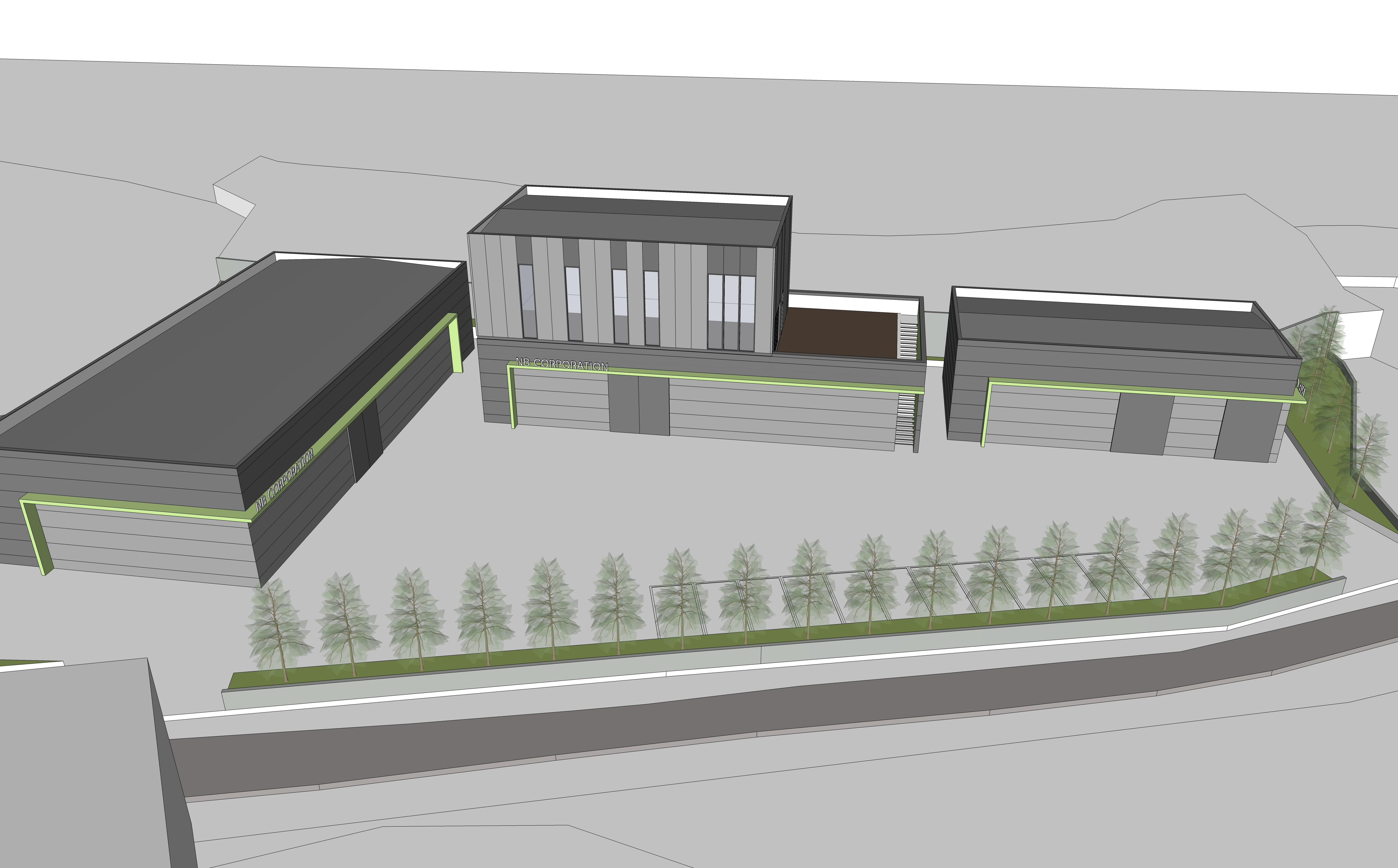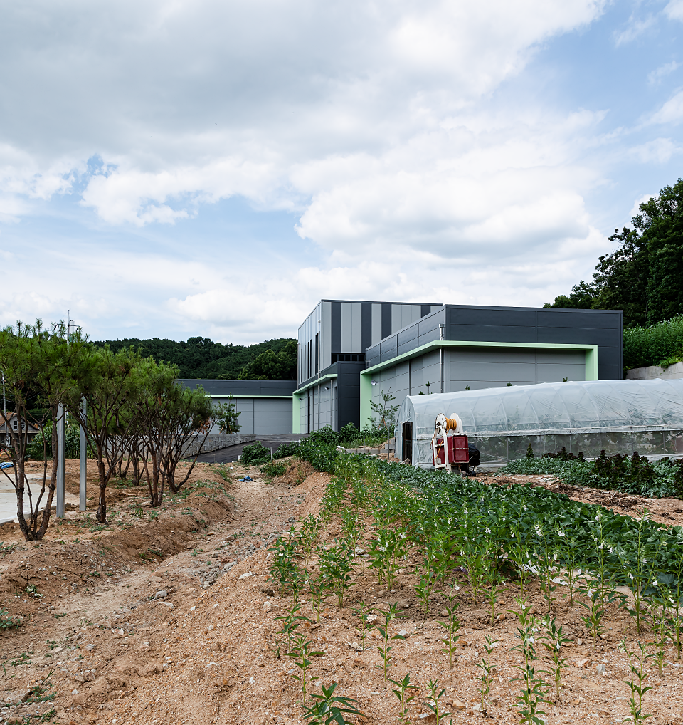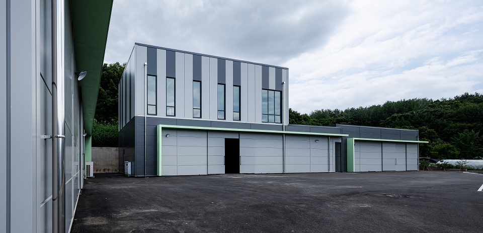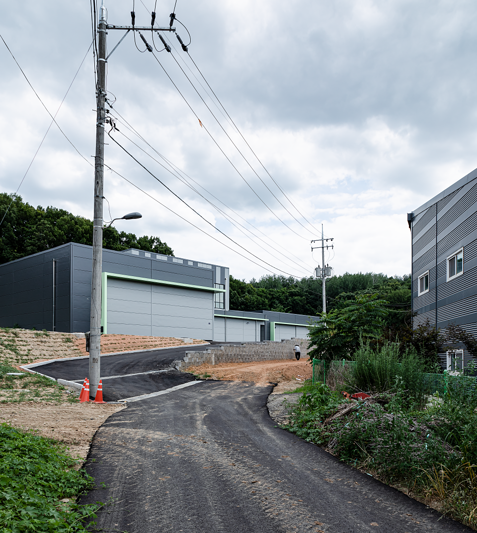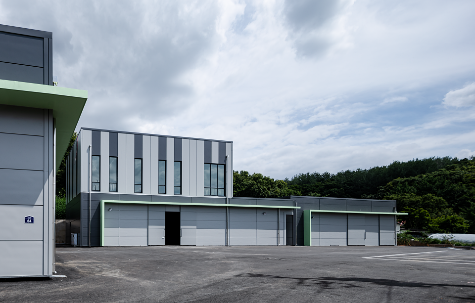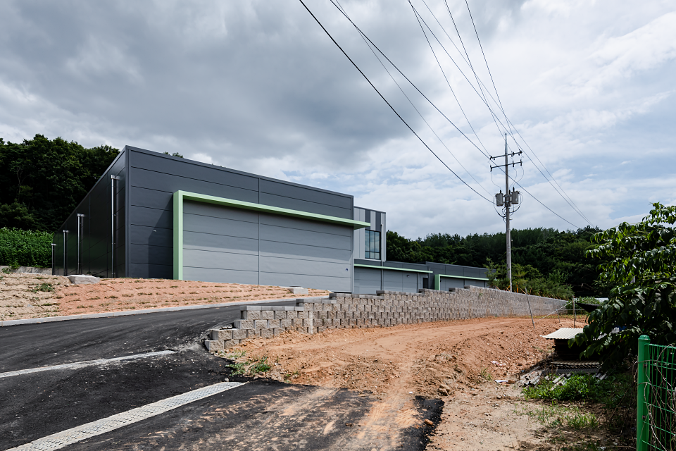 커피 제조 관련 사업 확장으로 기존에 임대로 사용하던 공장을 벗어나 제조공장과 보관창고, 사무실을 통합하여 신축하고자 찾아온 의뢰인은 물류가 차지하는 비중이 높다 보니 낙하IC와 근접하여 커피원두의 물류이동과 출하 시 물류이동이 원활한 위치의 땅으로 대지를 결정했다. 이곳에 정부지원을 통해 공장을 신축하고 싶어 한 의뢰인은 많은 예산을 들여 건물을 짓기는 어려운 상황이었므로 총 3개의 동으로 설립하되, 전체적으로는 모던하고 심플한 이미지로 디자인하였다. 특히 외부 마감 패널의 경우 의뢰인께서 기존 임대공장을 신축할 때의 경험과 단열재의 소중함을 알고 계셔서 일반 샌드위치 패널이 아닌 그라스울 패널을 사용하였다.