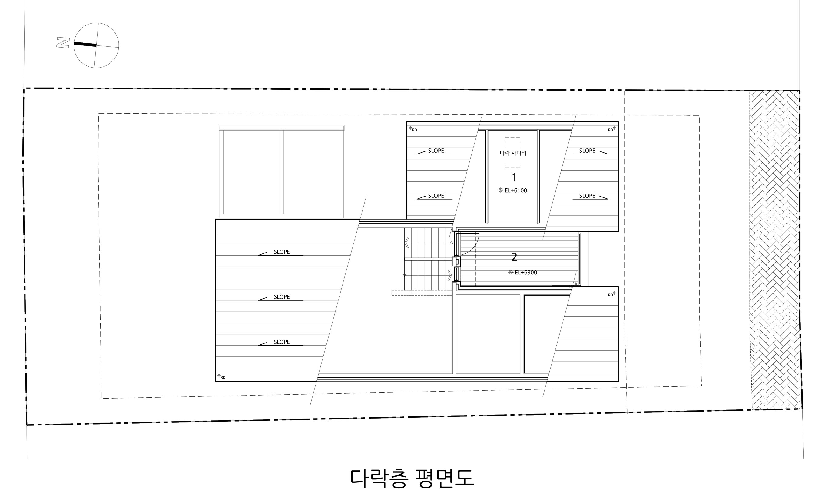 대지는 동서방향의 인접지와 0.2m의 단차가 있으며, 남북방향으로 1.0m의 대지 내 단차가 있는 경사지이다. 주변 대지와 같이 옹벽 등을 사용하여 대지를 새로 조성하는 것이 아니라 조망과 개방감 있고 경사진 현재 대지의 모습 그대로 유지하기를 원하신 건축주를 위해 조망이 좋은 북쪽에 거실을 배치하고, 동쪽의 매스를 비워 채광을 확보했다. 비워진 외부공간에는 마당과 거실의 전이 공간인 툇마루를 계획하여 거실의 채광 및 인접지로부터의 프라이버시를 확보했다.