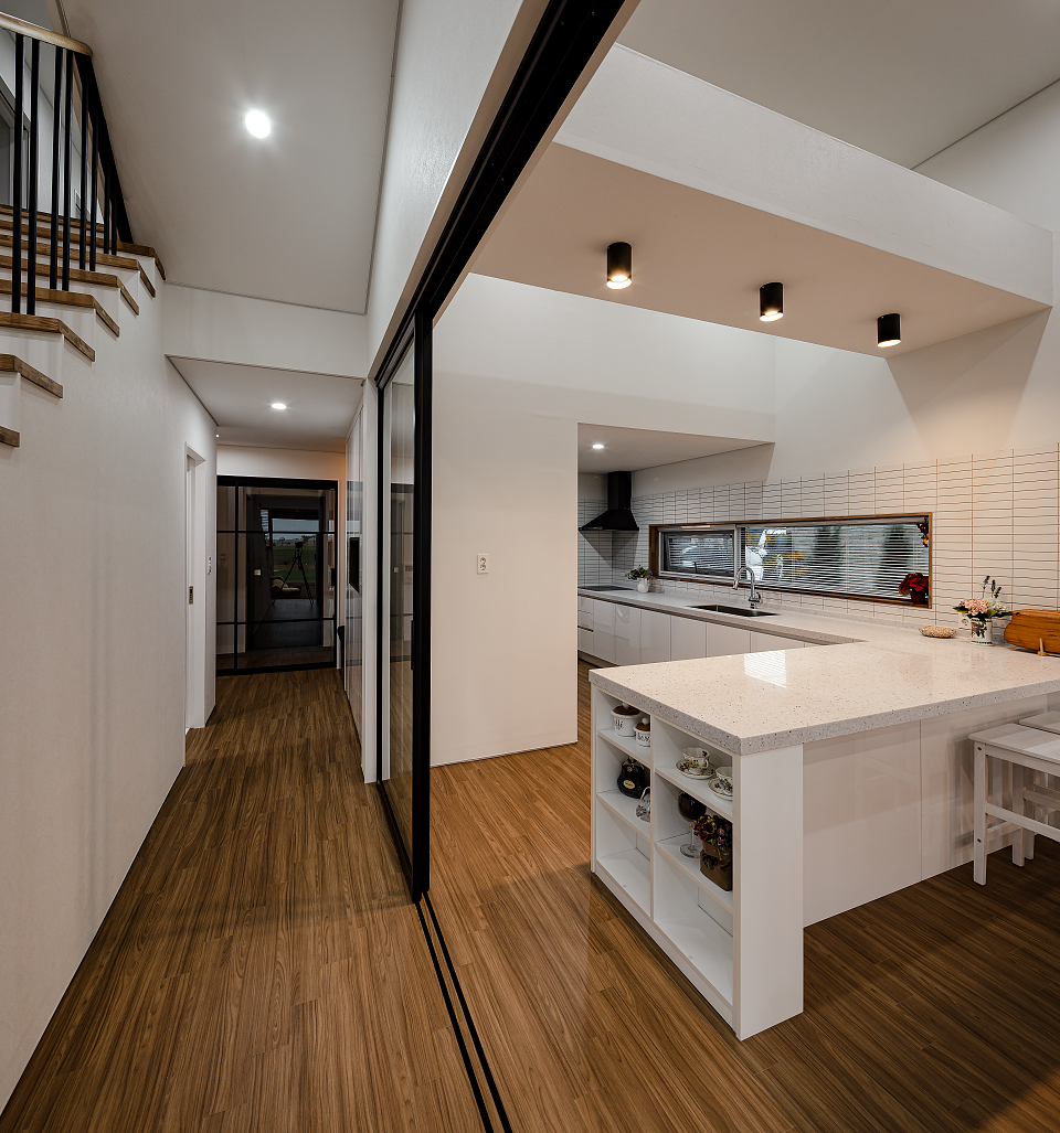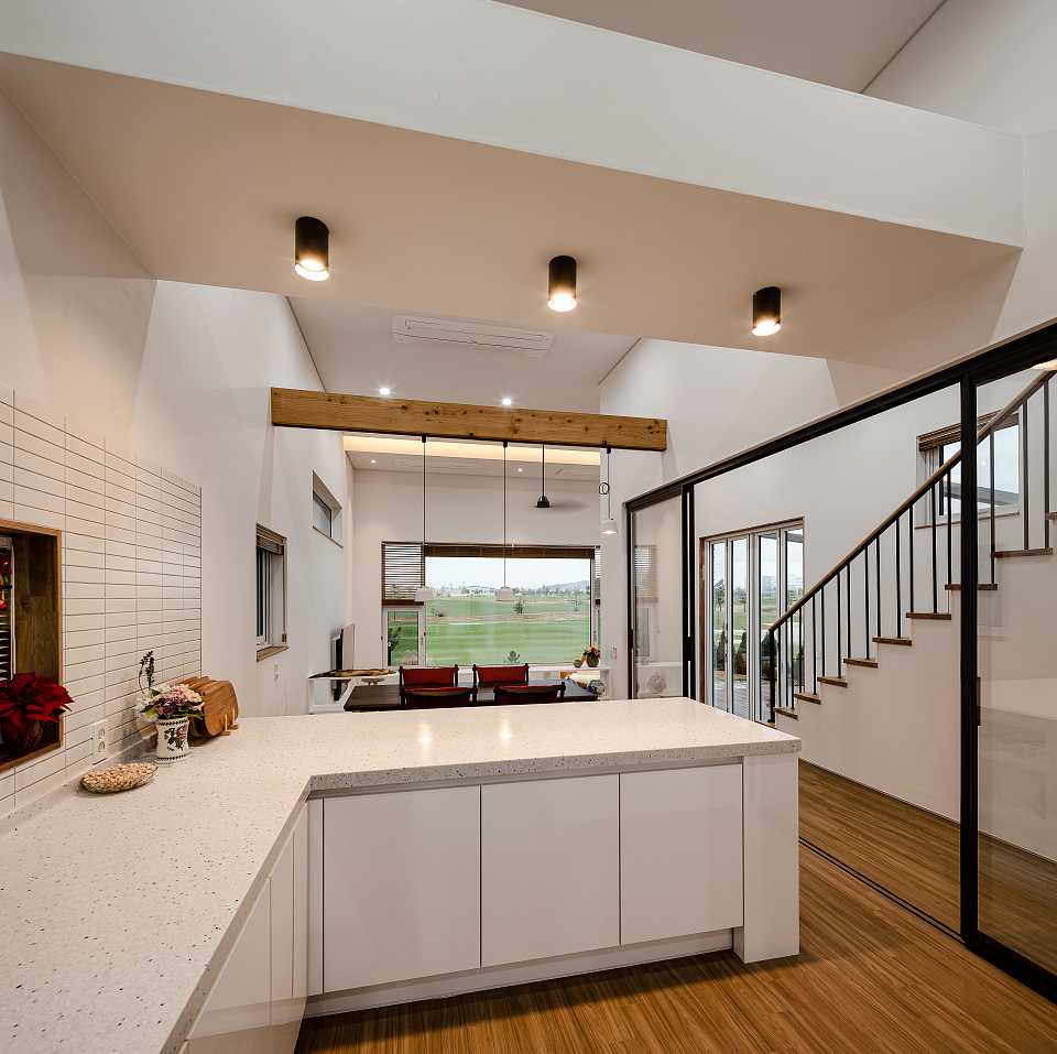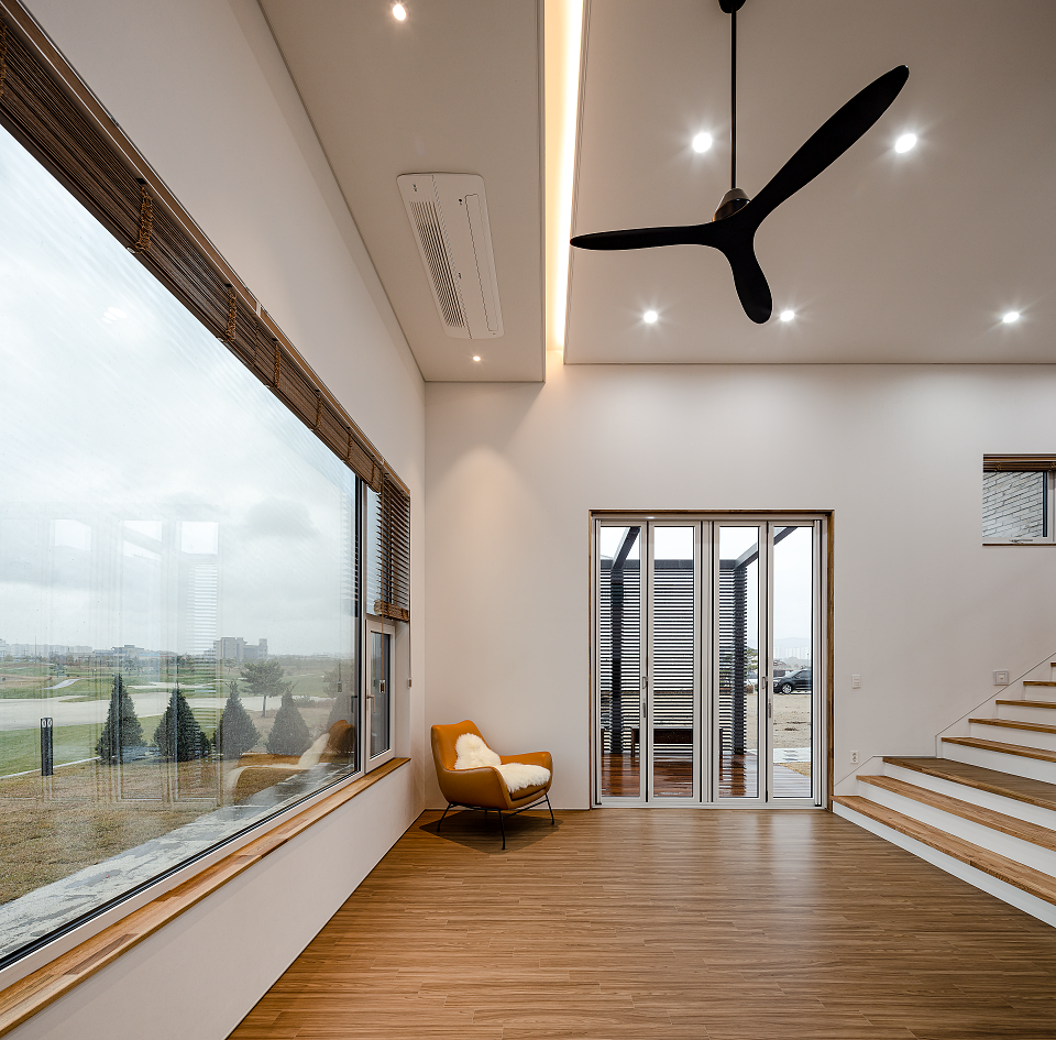 현관은 외부에서 건축물의 내부로 진입할 때 첫인상이 되는 부분이다. 세장한 대지에서 현관을 통해 북측의 골프장 조망까지 시선에 장애를 받지 않도록 계획을 하여 진입 시 개방감을 확보하였다. 좁은 복도를 지나 넓은 거실과 연결되는 공간 변화는 거실의 공간감과 개방감을 배가시키게 된다.