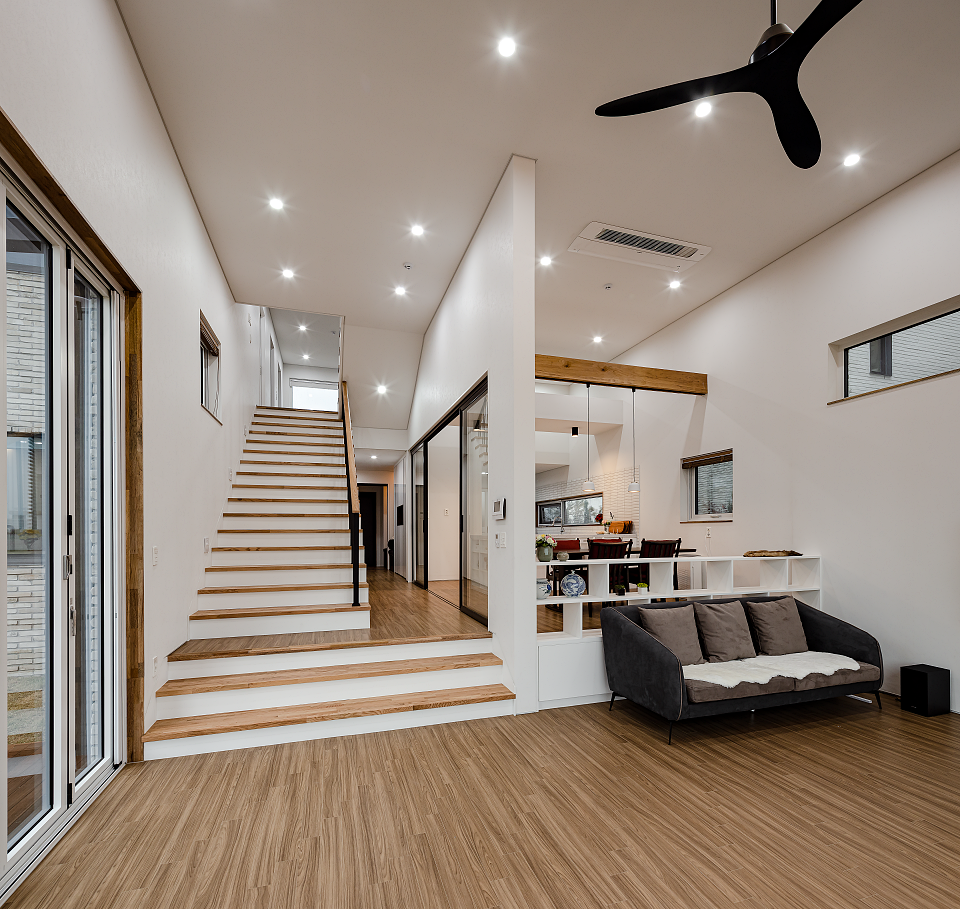 1층의 거실에서 일자 계단을 통해 2층의 자녀공간, 반 층 위에 위치한 거실 상부의 취미실(당구, AV룸), 거기서 또다시 반 층 위 자녀공간 상부의 옥외 데크까지 이어지는 스킵플로어 구조로 계획하여 각 실의 적절한 천정고를 확보하고 모든 공간에서 채광과 조망을 확보했다.