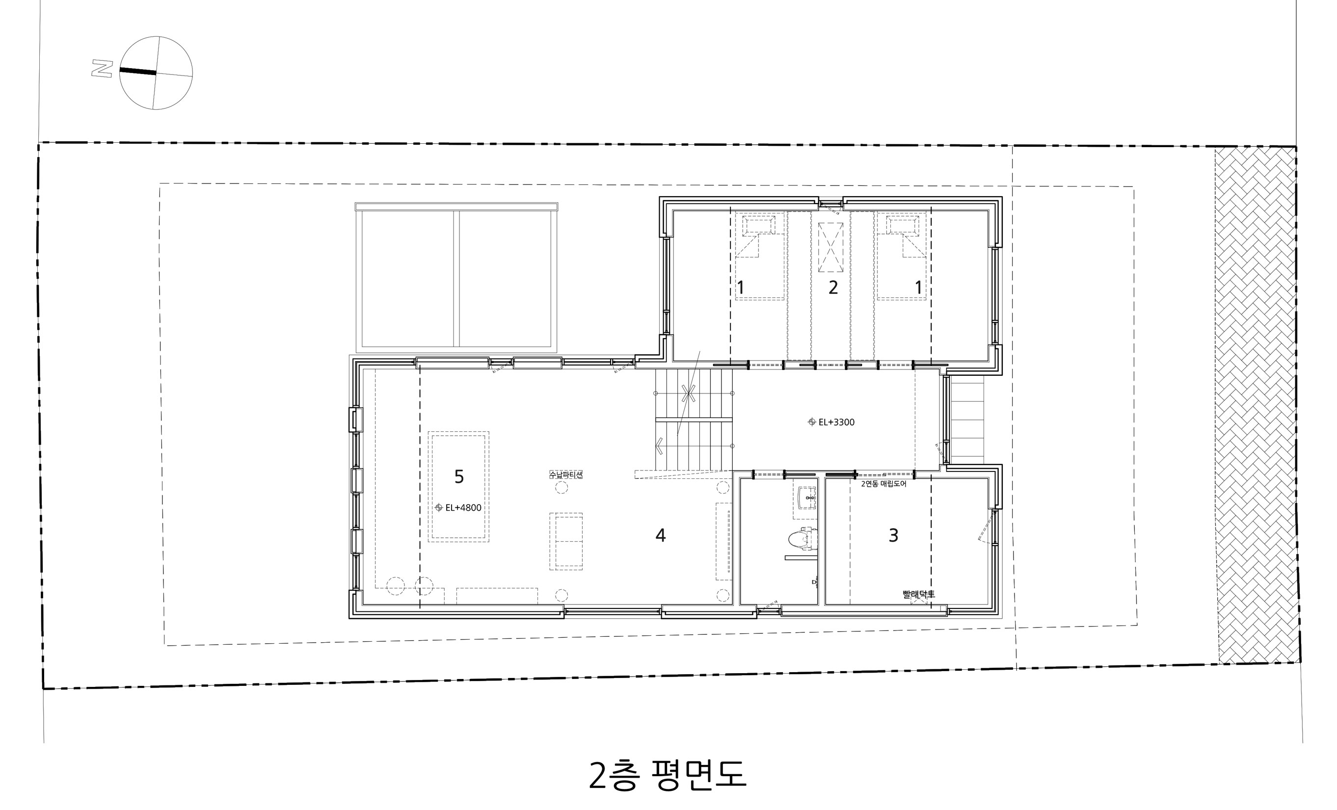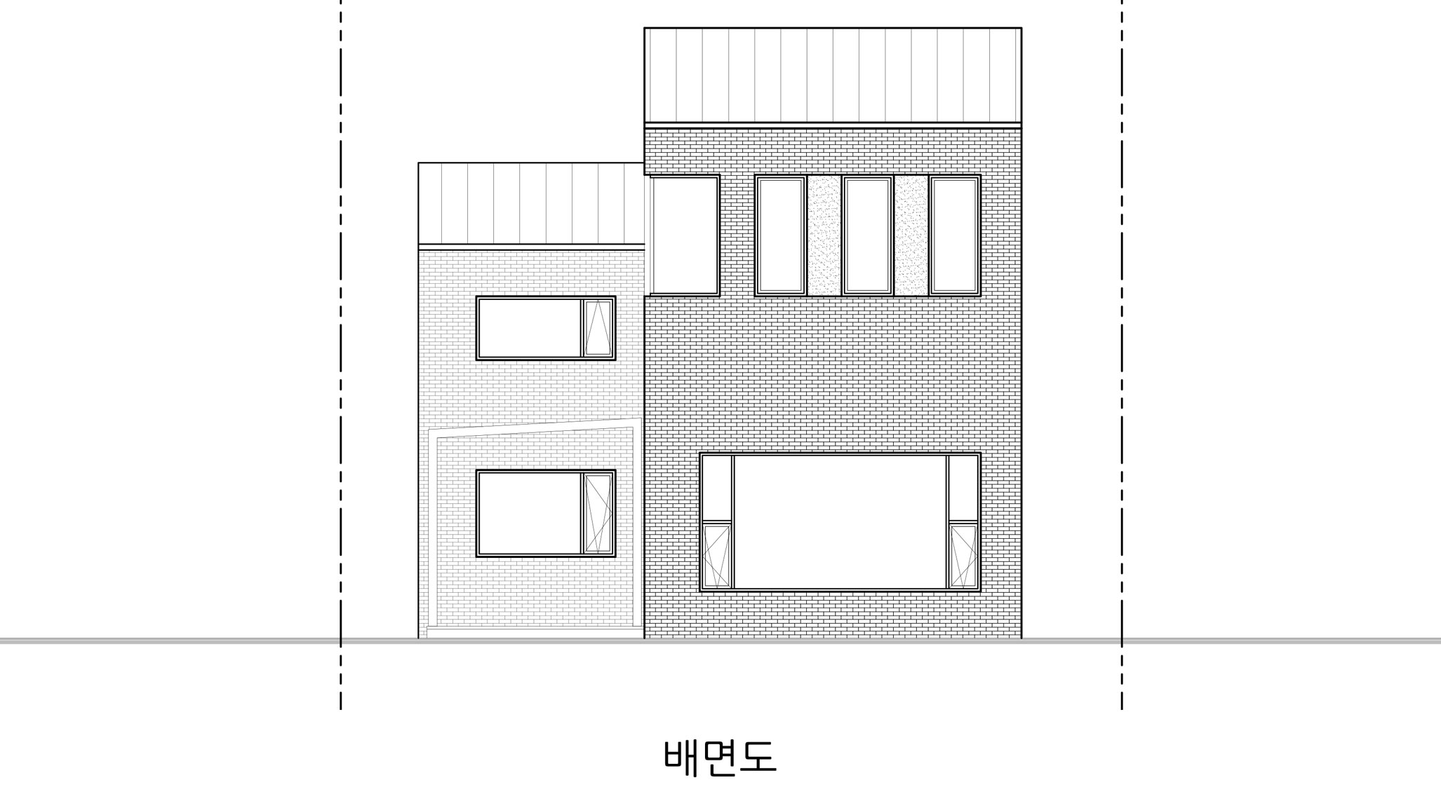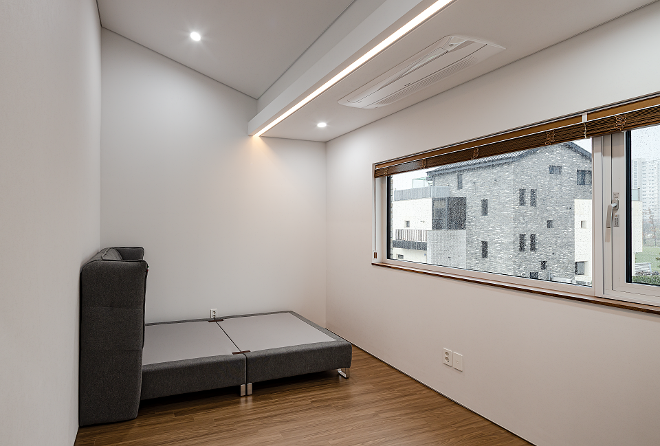 따라서 이격거리 적용으로 인해 생긴 진입도로로부터 건축물까지 7m의 전면 공간은 주차장과 진입 마당으로 계획하고 건축주가 요구한 각 프로그램(실)을 분석하여 전체적인 배치는 남북방향으로 하되, 계획 대지의 중심축을 기준으로 두 개의 매스로 분절하고 인접지와 접한 동서방향으로는 기능적으로 필요한 최소의 창을 계획하였으며, 부족한 남쪽의 채광은 두 개의 매스 중 동쪽의 매스를 덜어내어 프라이버시 및 동향의 채광을 확보하였다.