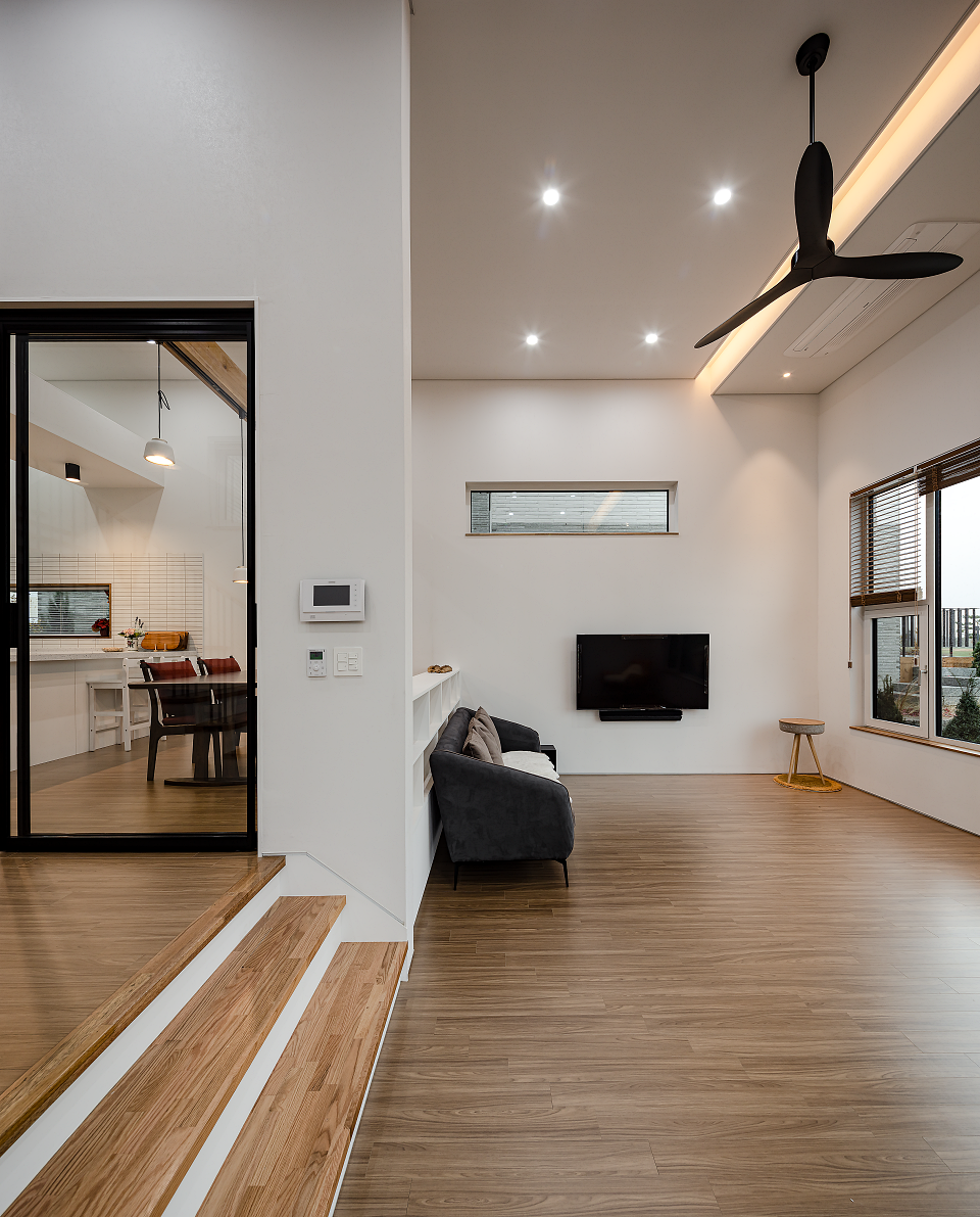 거실의 개방감을 위해 전면에는 큰 창을 계획하였고, 기존 대지의 경사를 활용하였기 때문에 1층 거실부에 단차가 자연스럽게 생성되고 각각의 실들을 반층씩 겹치는 방식인 스킵플로어(Skip Floor) 형태로 구성하여 거실의 높은 층고를 확보 및 개방감과 공간감을 극대화할 수 있었다.