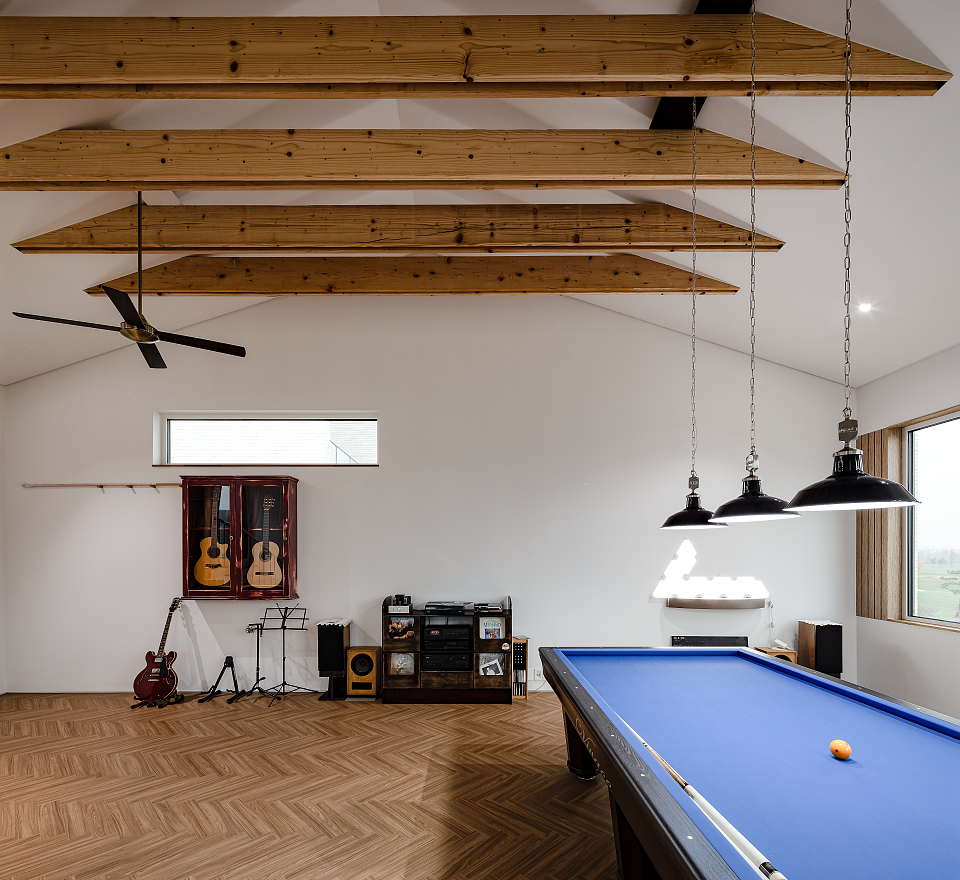 건축주(남편)는 취미인 당구와 AV룸, 목공을 할 수 있는 별도의 공간을 가지길 원했으며, 당구와 AV룸의 성격상 기본적인 최소 실의 크기 및 높은 층고가 필요했고 목공은 장비를 보관할 공간과 목재를 가공할 외부공간이 있어야 했다. 따라서 스킵플로어 구조의 계단을 통해 2층의 자녀공간보다 반 층 높은 최상부에 취미실을 배치하고, 반 층 위의 옥상 테라스를 연계하여 다른 공간과는 독립된 건축주만의 개인 공간을 계획하였다.