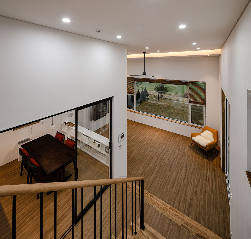 1층의 거실에서 일자 계단을 통해 2층의 자녀공간, 반 층 위에 위치한 거실 상부의 취미실(당구, AV룸), 거기서 또다시 반 층 위 자녀공간 상부의 옥외 데크까지 이어지는 스킵플로어 구조로 계획하여 각 실의 적절한 천정고를 확보하고 모든 공간에서 채광과 조망을 확보했다.