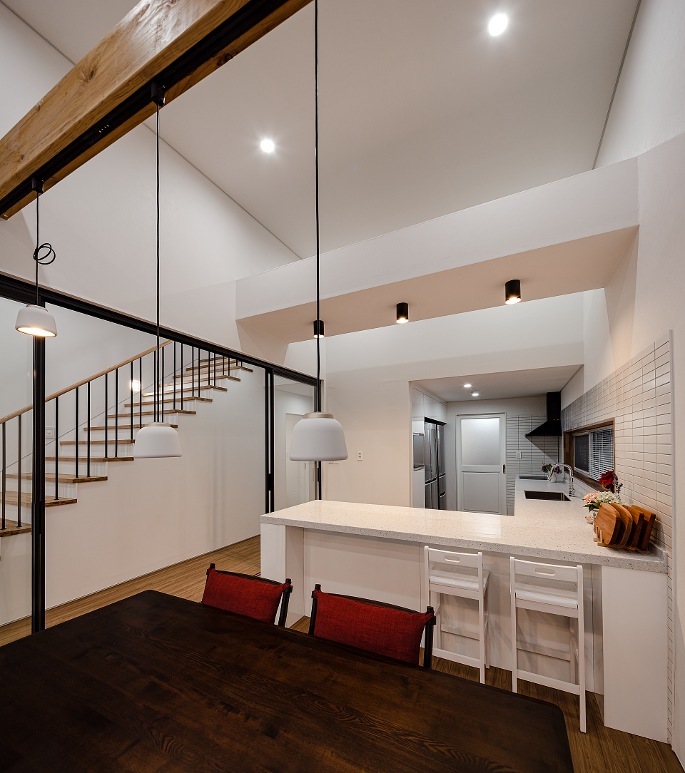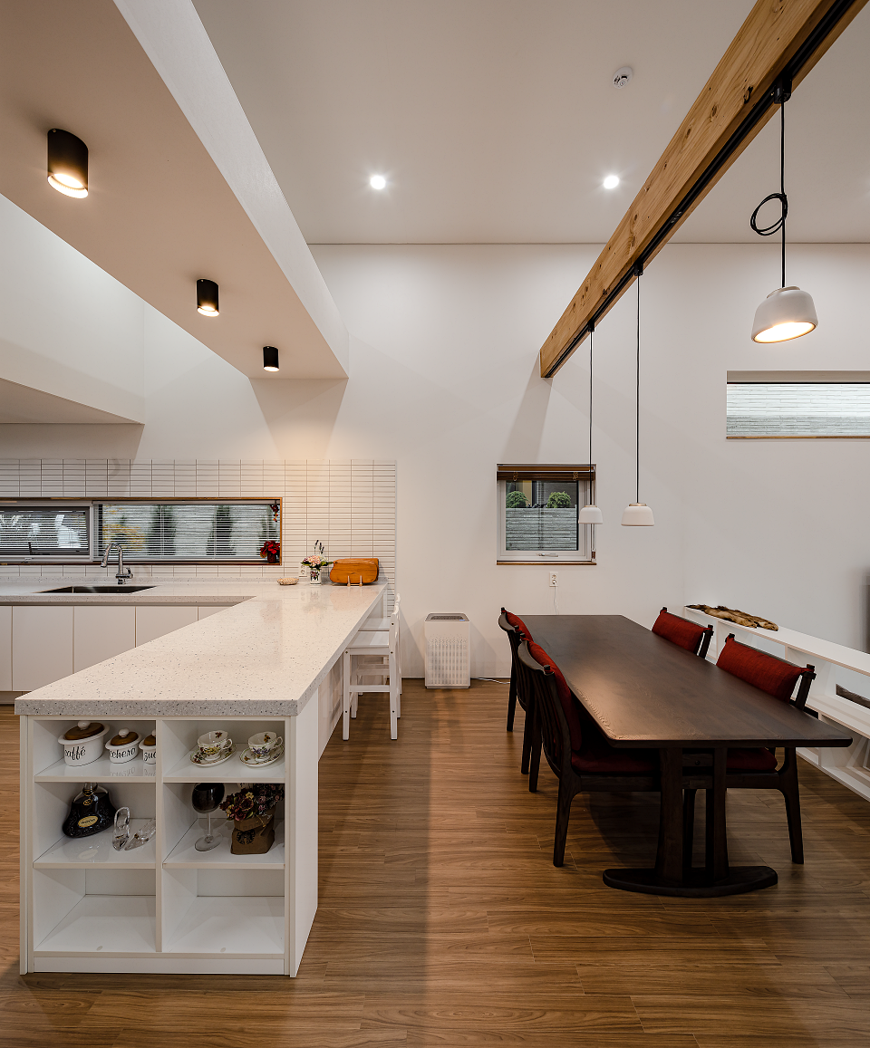 주방, 식당, 거실 순으로 연속되는 조망을 확보하였으며, 식당은 거실과 단차를 두어 하나의 공간에서 각각의 독립성을 확보하였다. 다용도실과 주방은 2400mm의 천정고, 식당은 3900mm, 거실은 4500mm의 천정고를 확보하여 각실의 성격에 맞게 천정고를 계획하였으며, 공간의 이동에 따른 층고의 점진적 증가는 단조로울 수 있는 1층 공간을 변화시켜 공간의 깊이와 리듬감을 느낄 수 있도록 했다.