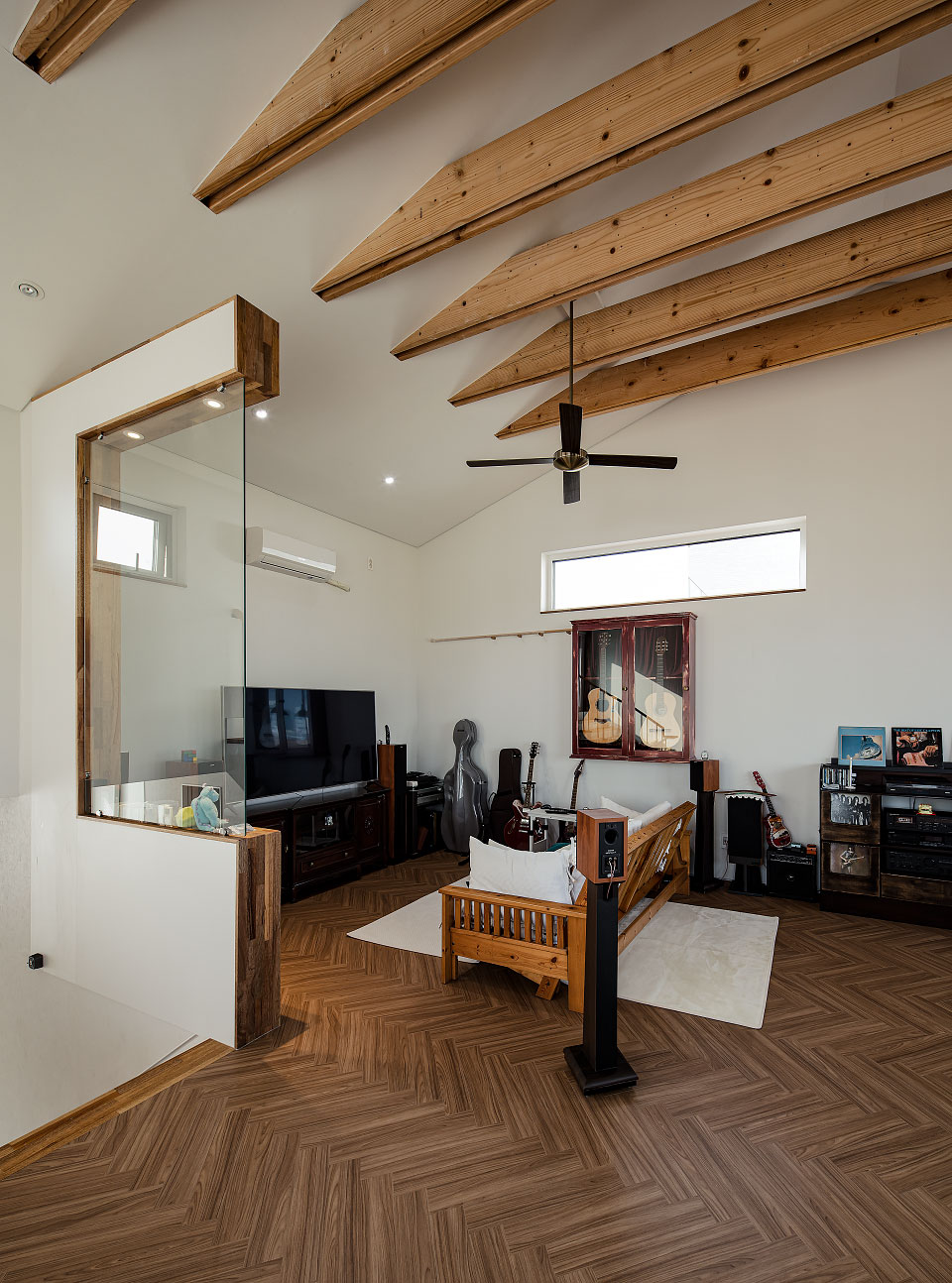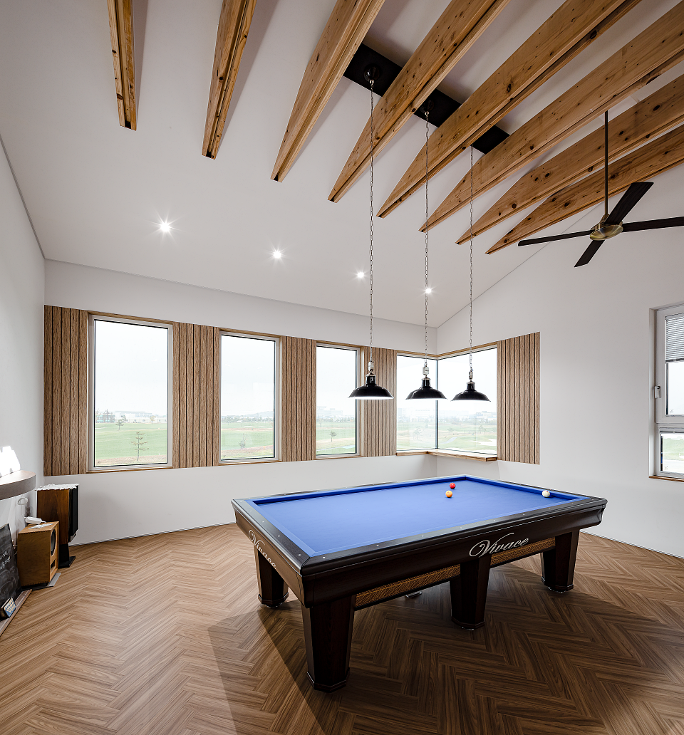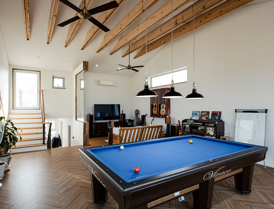 건축주(남편)는 취미인 당구와 AV룸, 목공을 할 수 있는 별도의 공간을 가지길 원했으며, 당구와 AV룸의 성격상 기본적인 최소 실의 크기 및 높은 층고가 필요했고 목공은 장비를 보관할 공간과 목재를 가공할 외부공간이 있어야 했다. 따라서 스킵플로어 구조의 계단을 통해 2층의 자녀공간보다 반 층 높은 최상부에 취미실을 배치하고, 반 층 위의 옥상 테라스를 연계하여 다른 공간과는 독립된 건축주만의 개인 공간을 계획하였다.