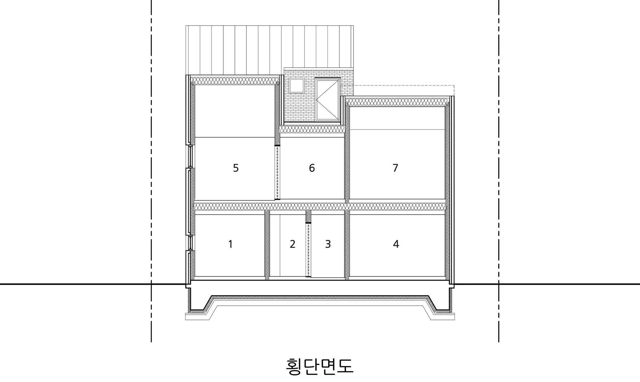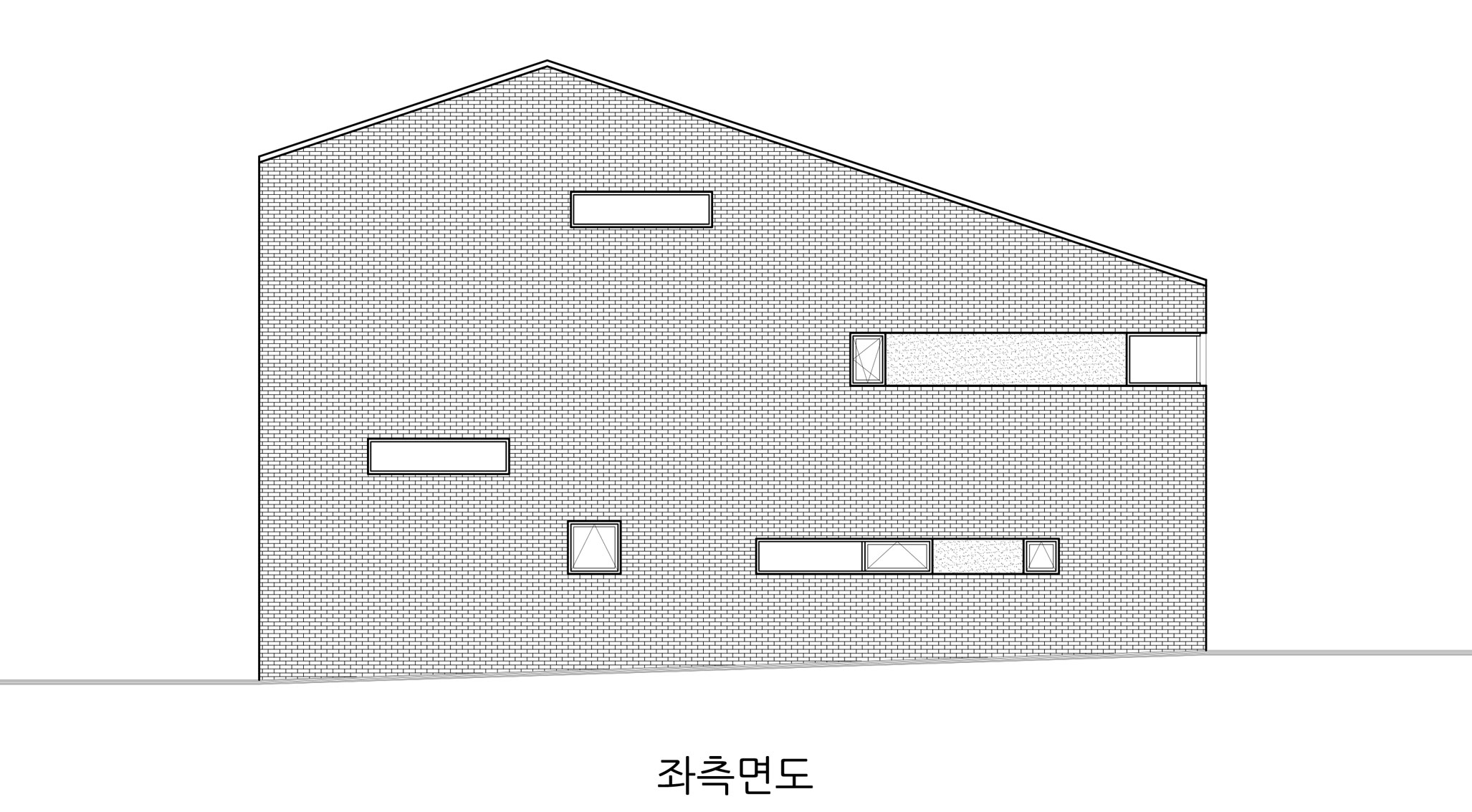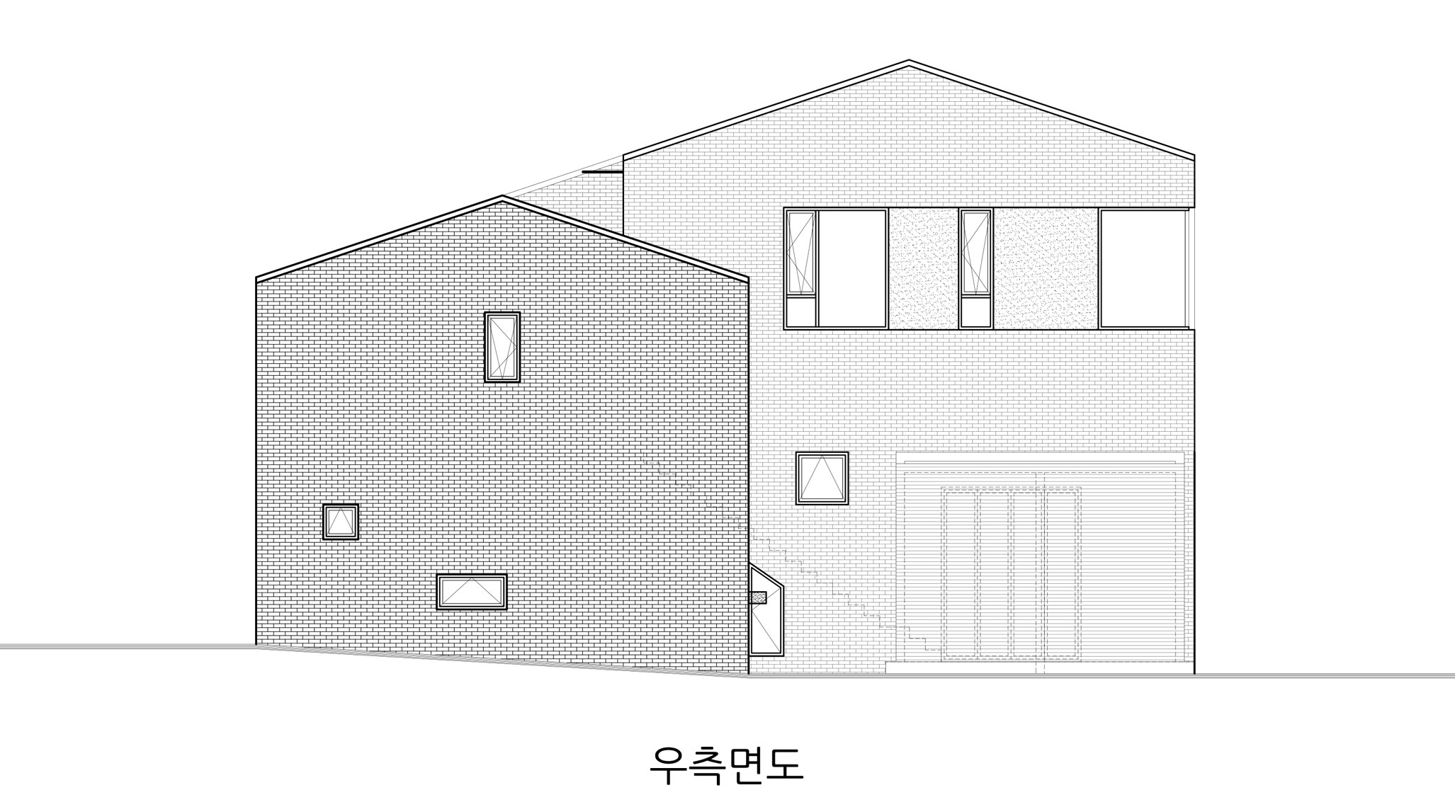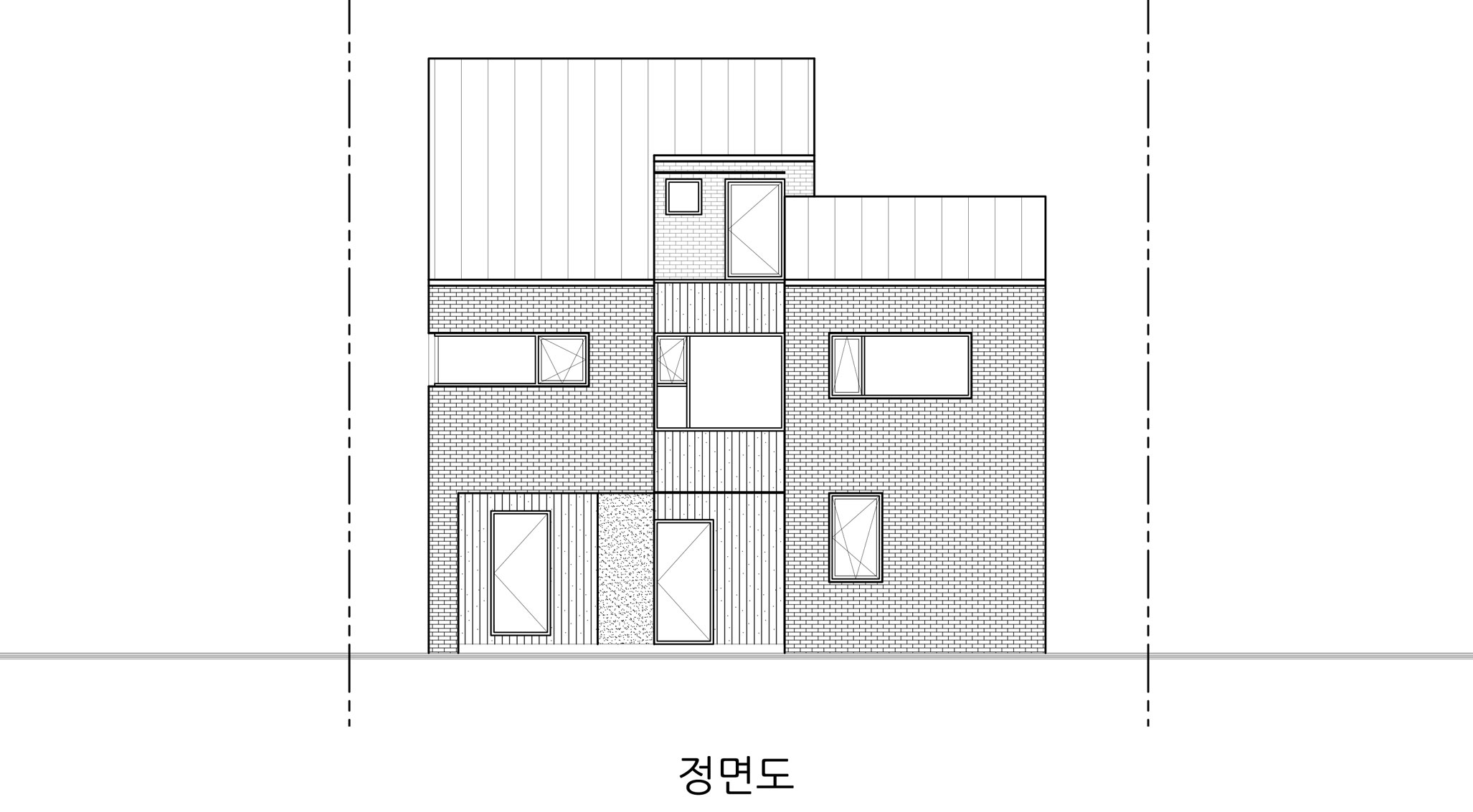 따라서 이격거리 적용으로 인해 생긴 진입도로로부터 건축물까지 7m의 전면 공간은 주차장과 진입 마당으로 계획하고 건축주가 요구한 각 프로그램(실)을 분석하여 전체적인 배치는 남북방향으로 하되, 계획 대지의 중심축을 기준으로 두 개의 매스로 분절하고 인접지와 접한 동서방향으로는 기능적으로 필요한 최소의 창을 계획하였으며, 부족한 남쪽의 채광은 두 개의 매스 중 동쪽의 매스를 덜어내어 프라이버시 및 동향의 채광을 확보하였다.