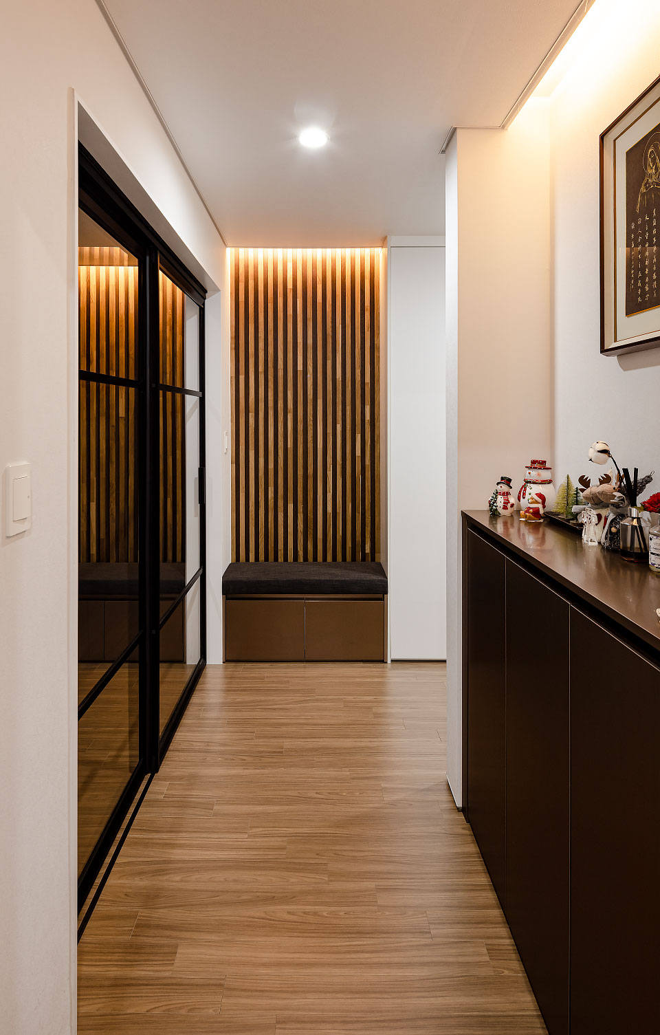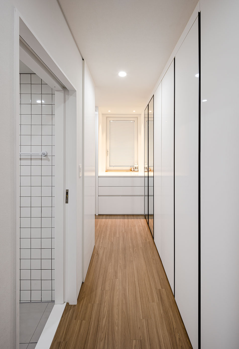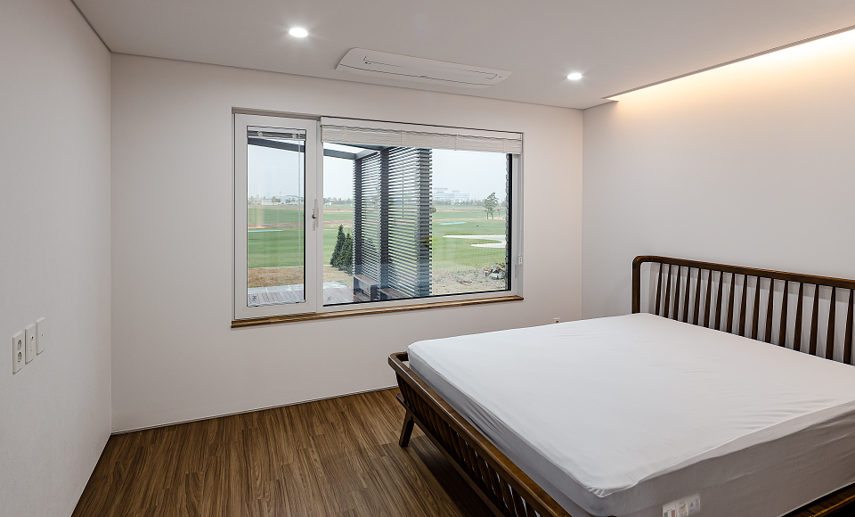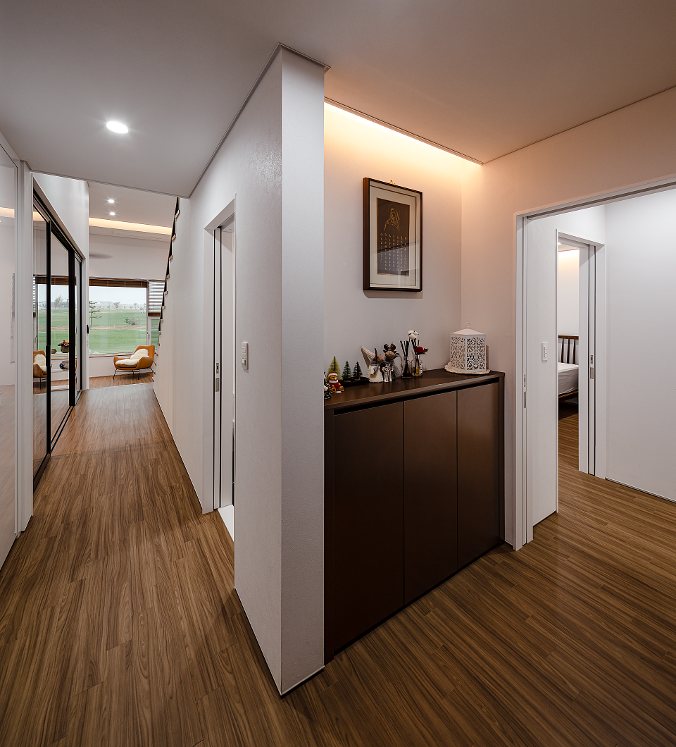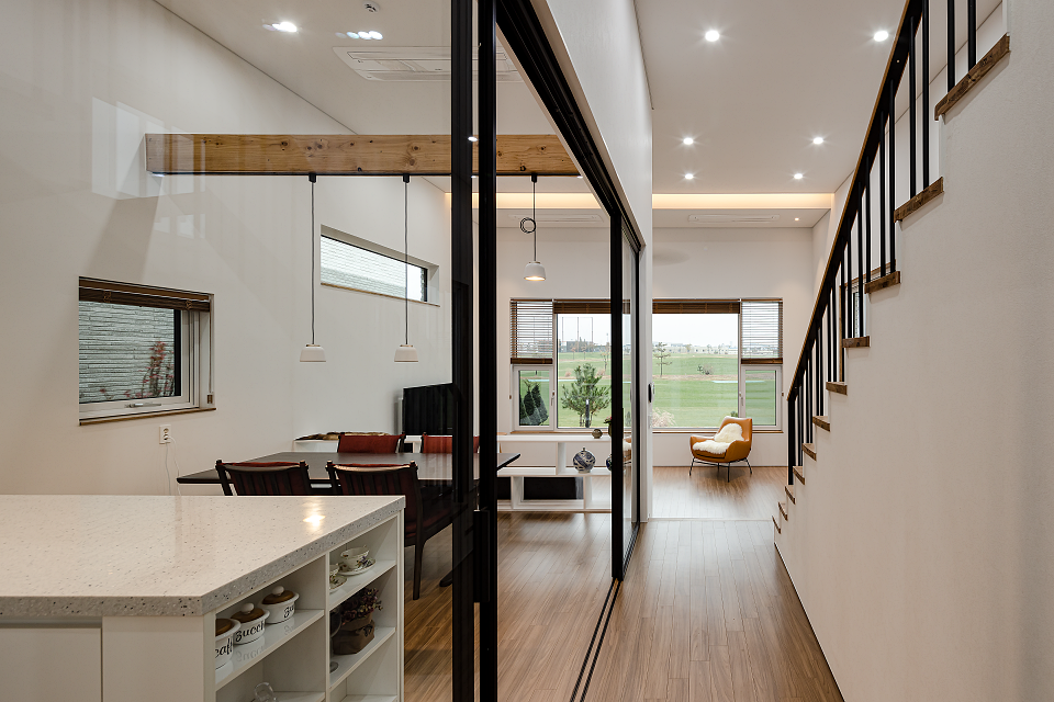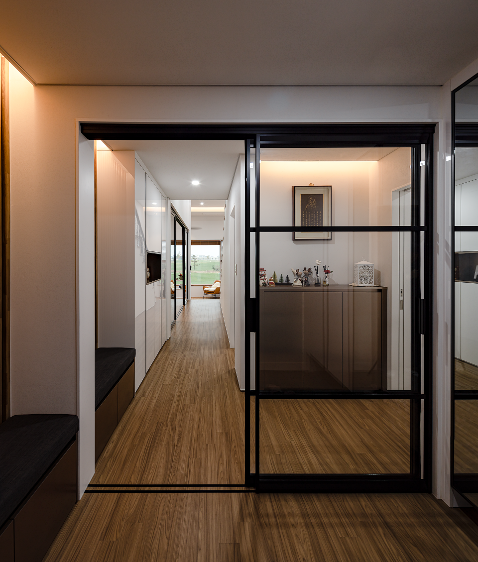 현관은 외부에서 건축물의 내부로 진입할 때 첫인상이 되는 부분이다. 세장한 대지에서 현관을 통해 북측의 골프장 조망까지 시선에 장애를 받지 않도록 계획을 하여 진입 시 개방감을 확보하였다. 좁은 복도를 지나 넓은 거실과 연결되는 공간 변화는 거실의 공간감과 개방감을 배가시키게 된다.